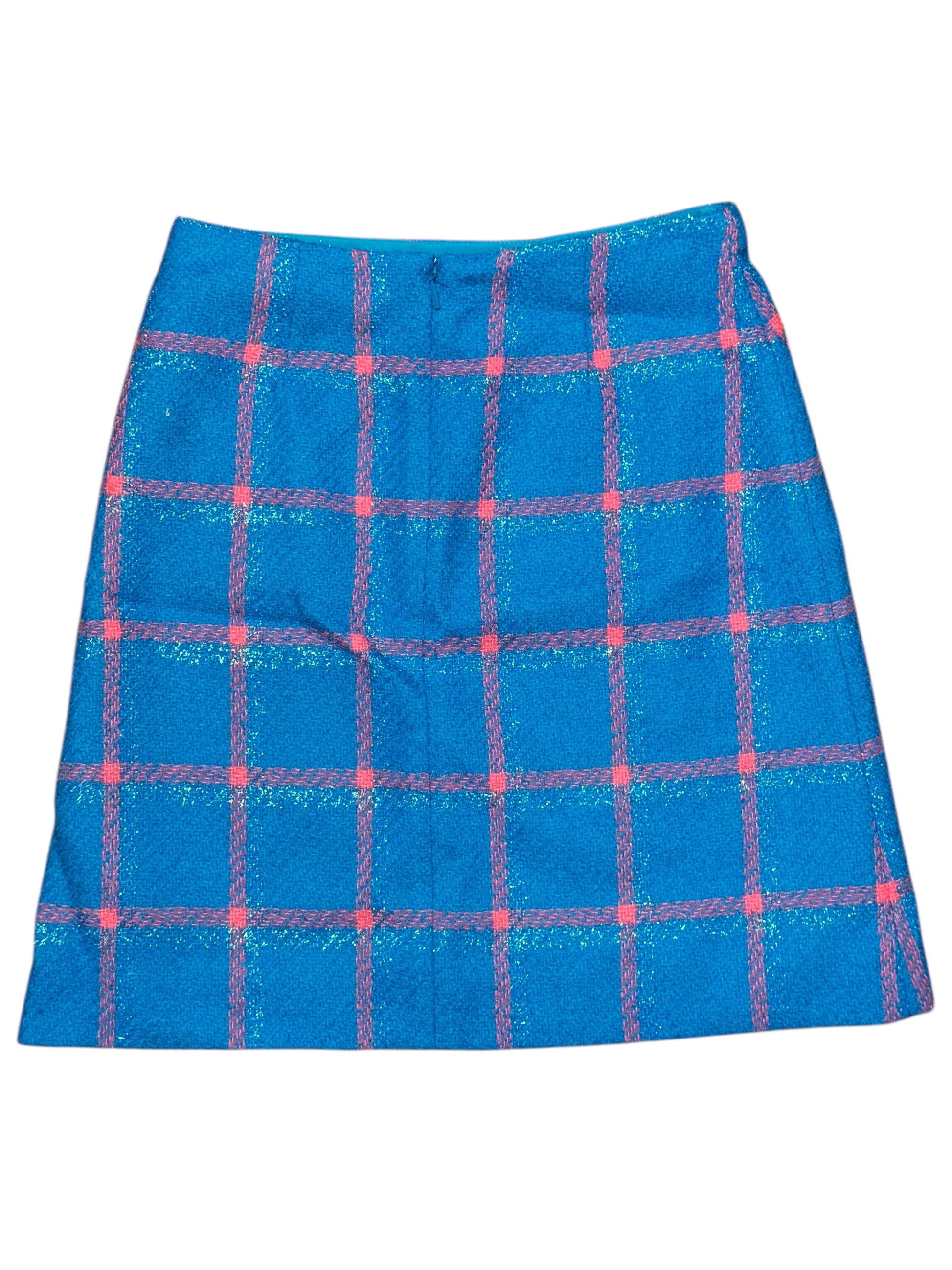 Gonna Versace autentica realizzata in tessuto di lana vergine con motivo check (windowpane) nei toni del blu e rosa. Modello elegante e strutturato, arricchito da finvia Medusa dorata in vita, dettaglio iconico della maison. Chiusura con zip posteriore, interno foderato per una vestibilità confortevole.
