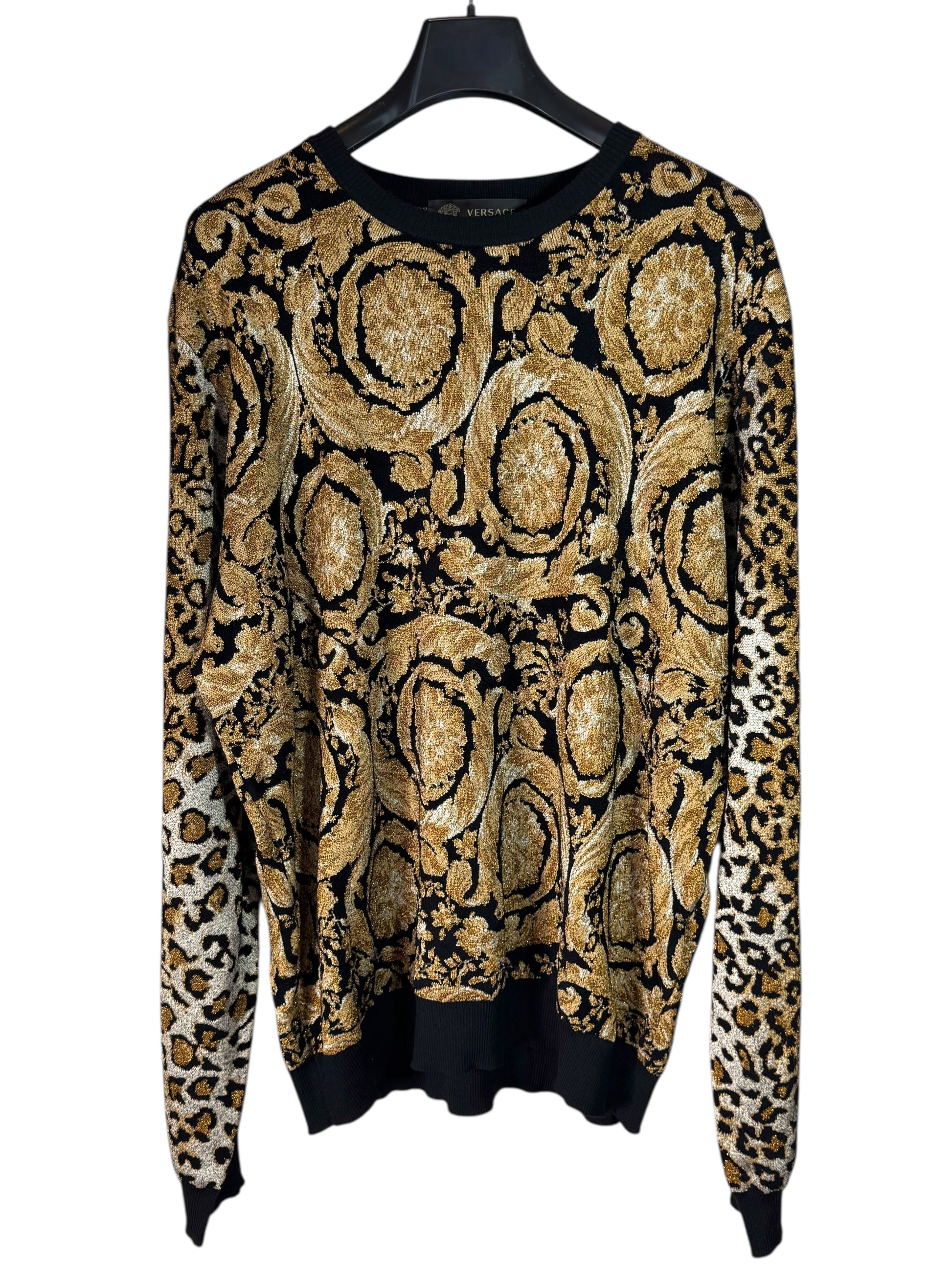 Maglia originale Gianni Versace in tessuto jacquard con motivo barocco dorato e dettagli animalier leopardati su base nera. Capo di forte impatto visivo, elegante e prezioso, realizzato in Italia con filati di qualità.