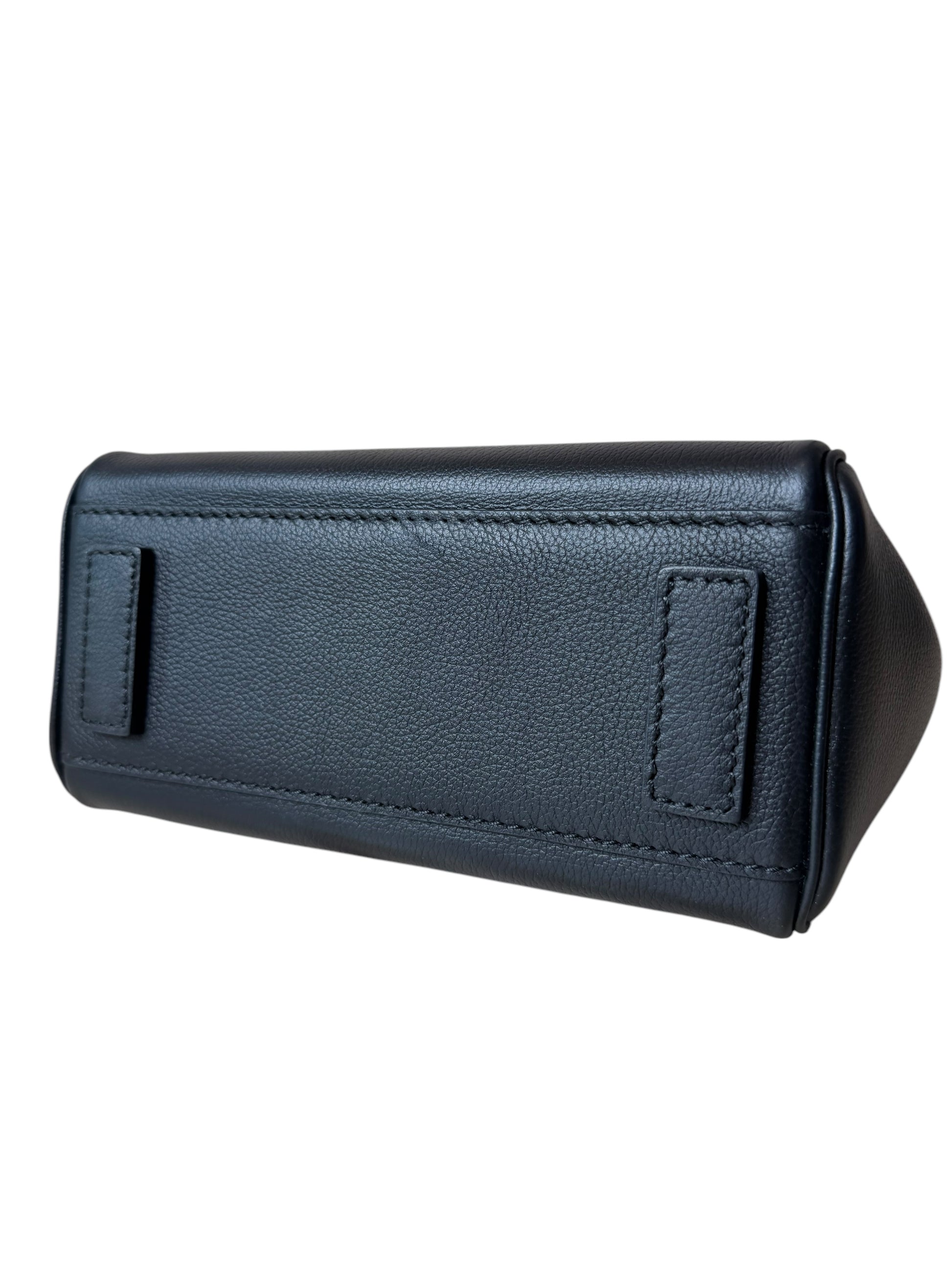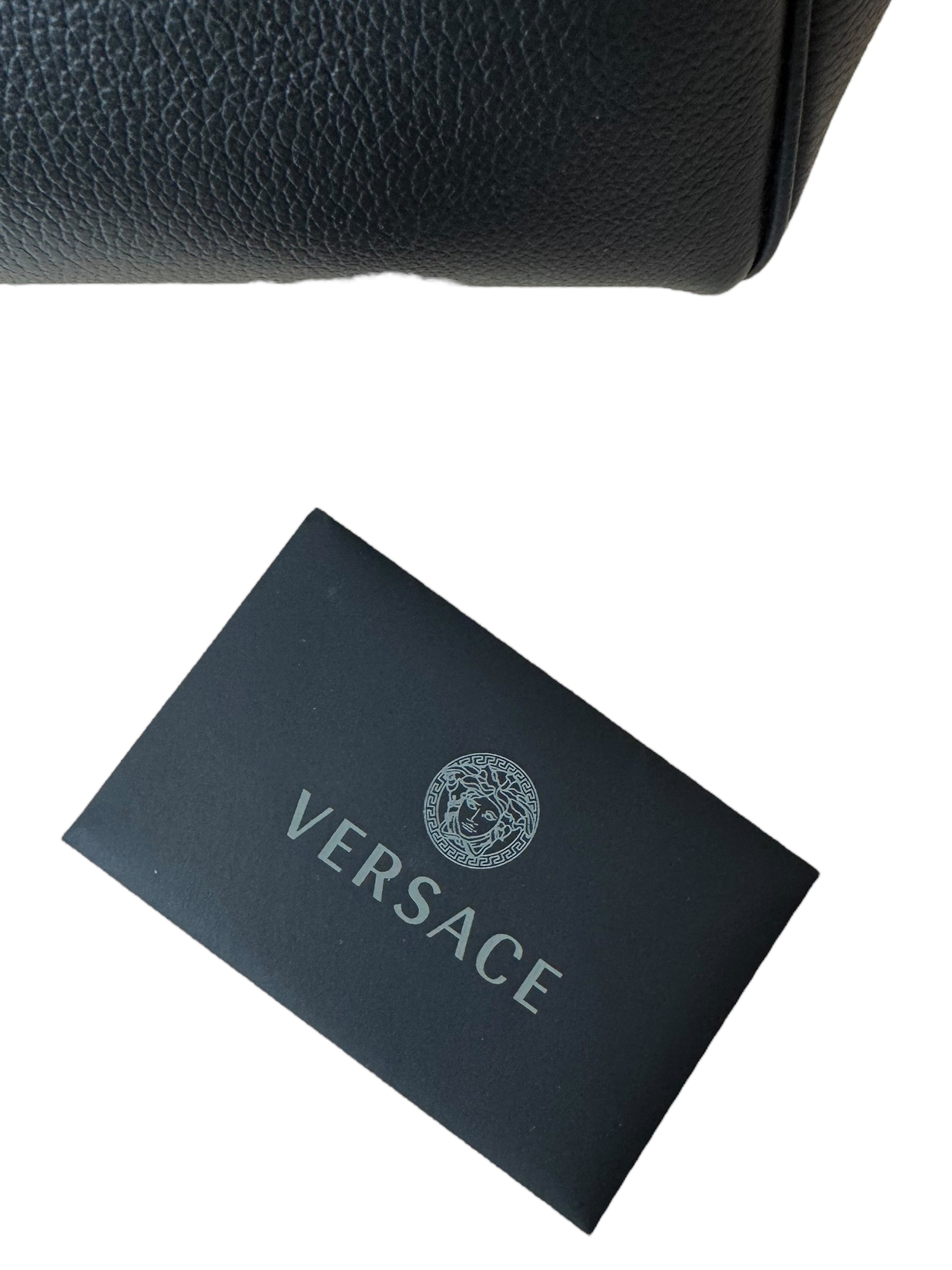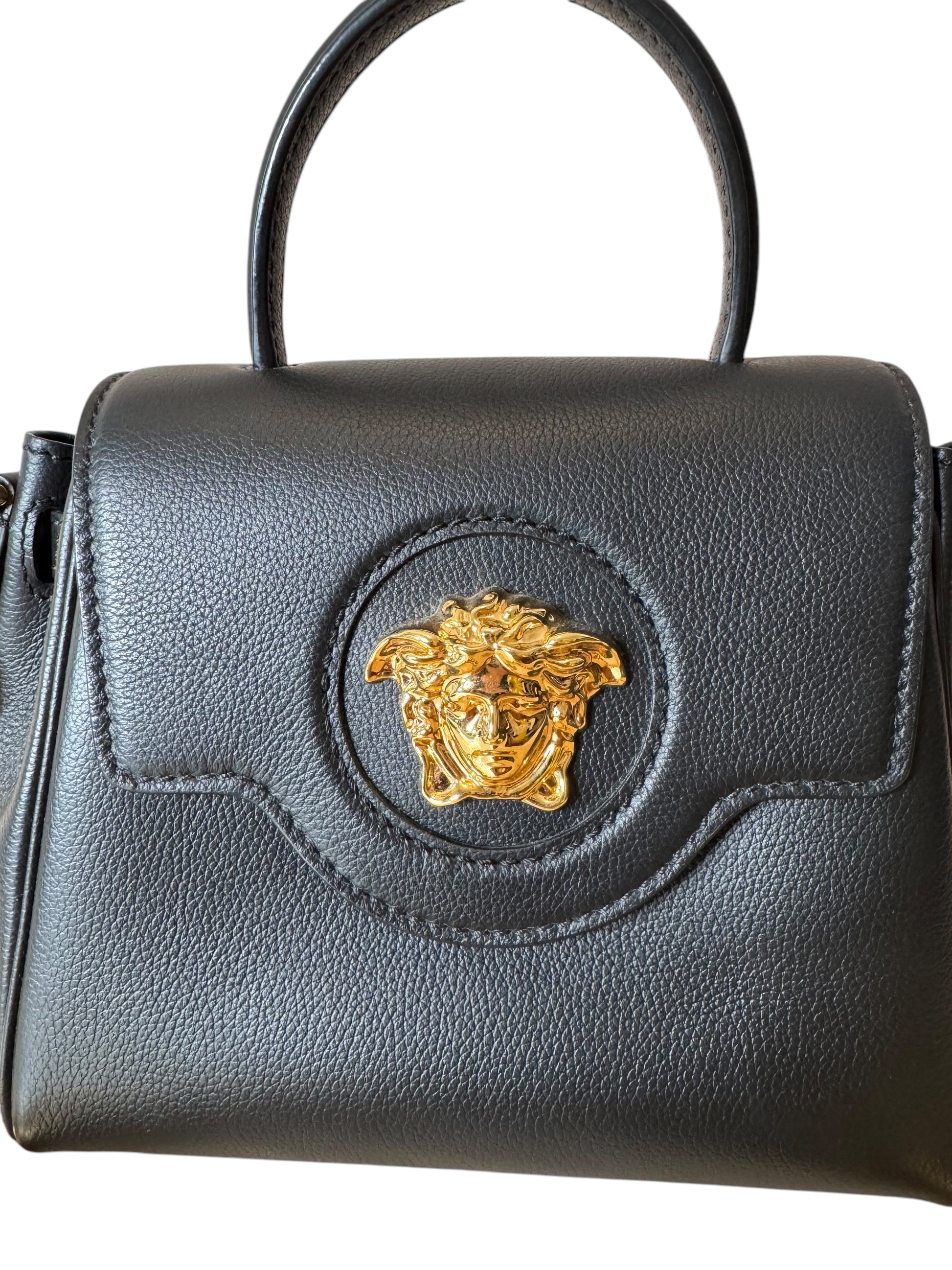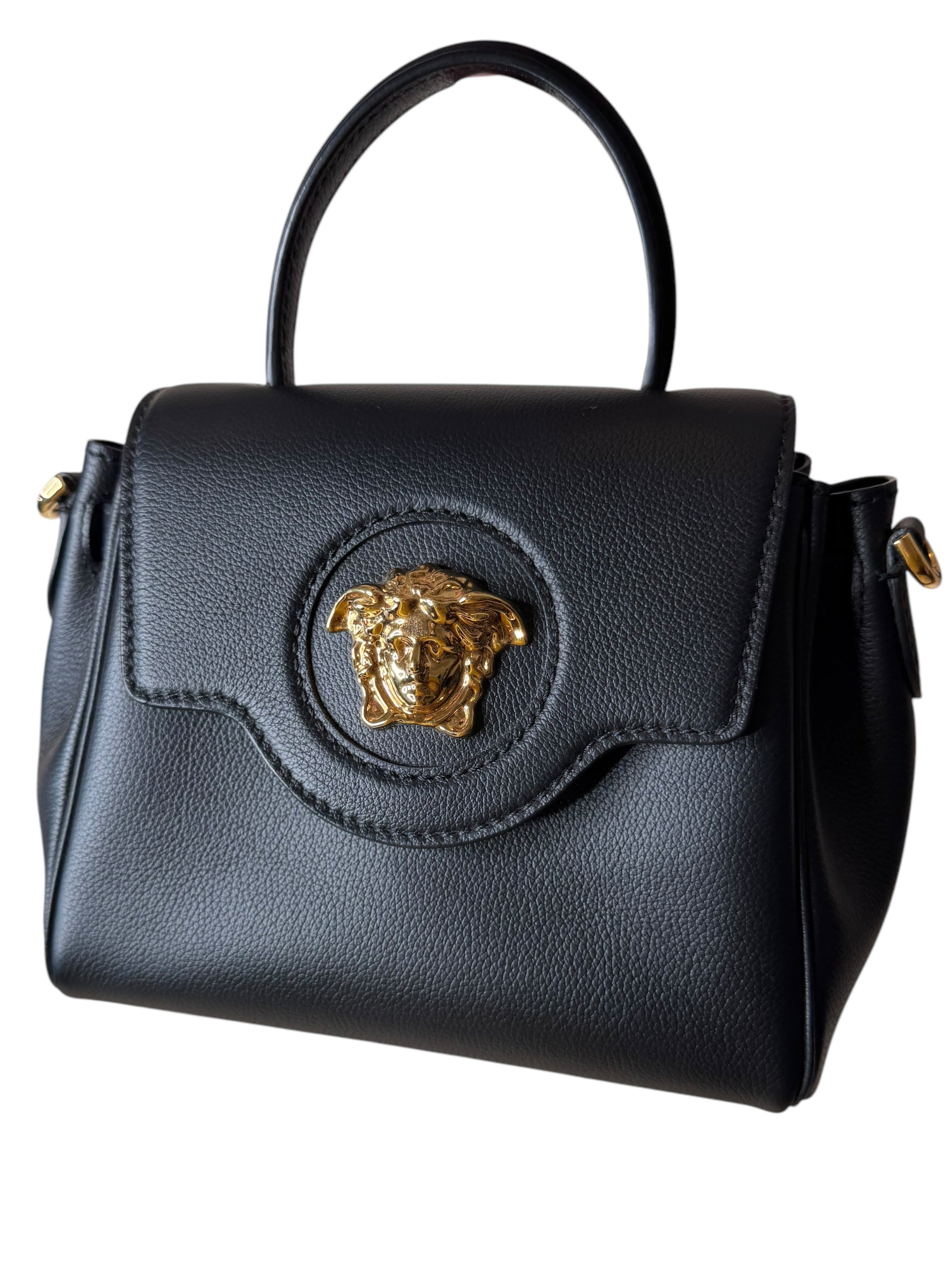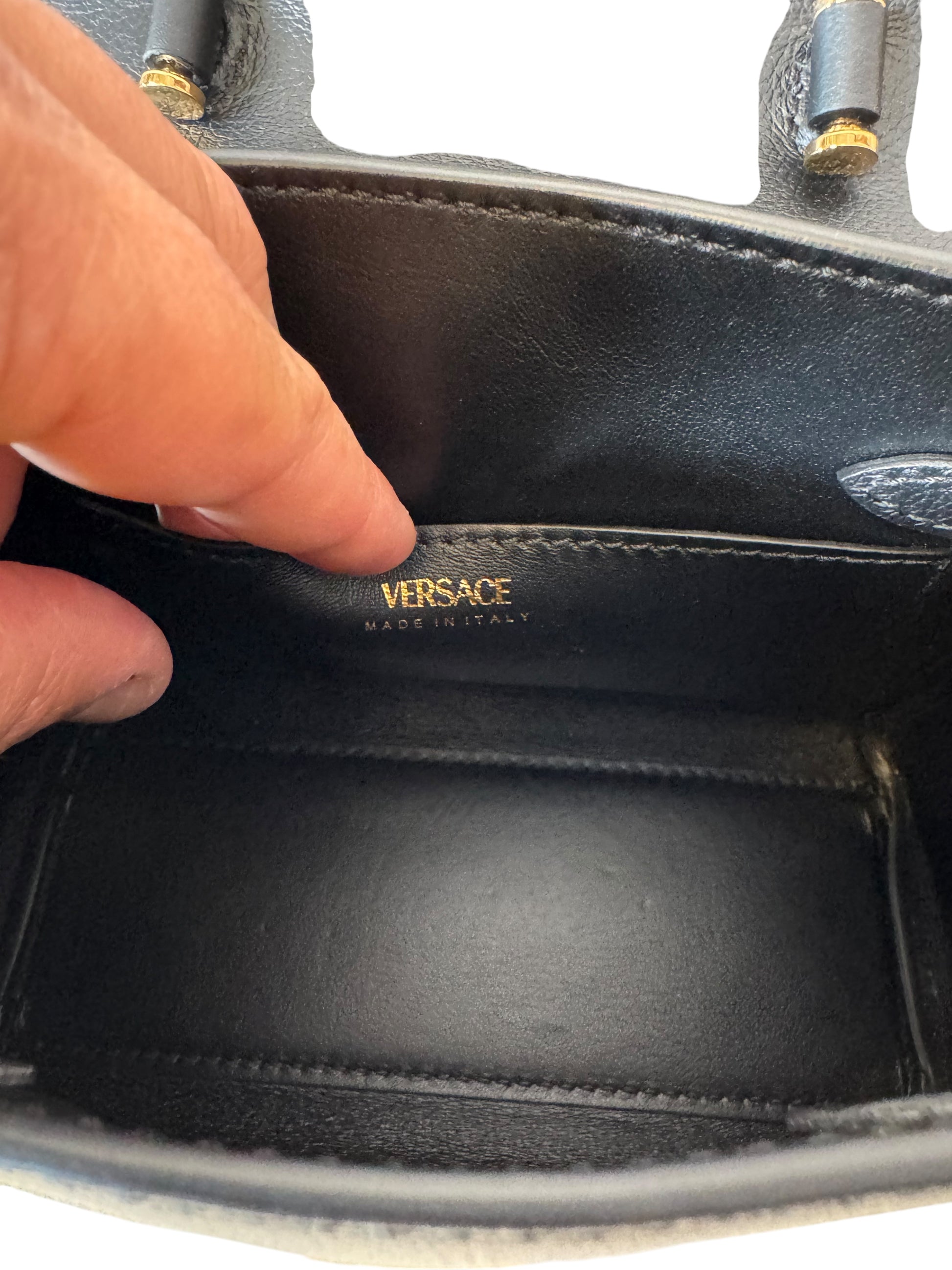 Borsa originale Versace Medusa Mini, realizzata in vera pelle nera martellata, con dettagli metallici oro lucido e iconica testa di Medusa sul fronte. Dotata di manico superiore, tracolla a catena dorata e tracolla in pelle regolabile removibile per utilizzo a spalla o a mano. Chiusura con bottone magnetico e interno foderato in pelle con tasca piatta.