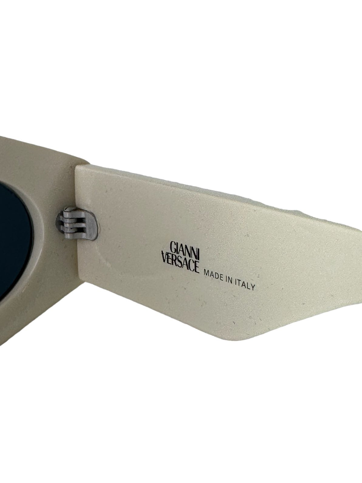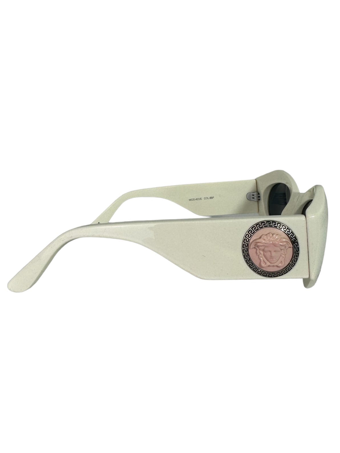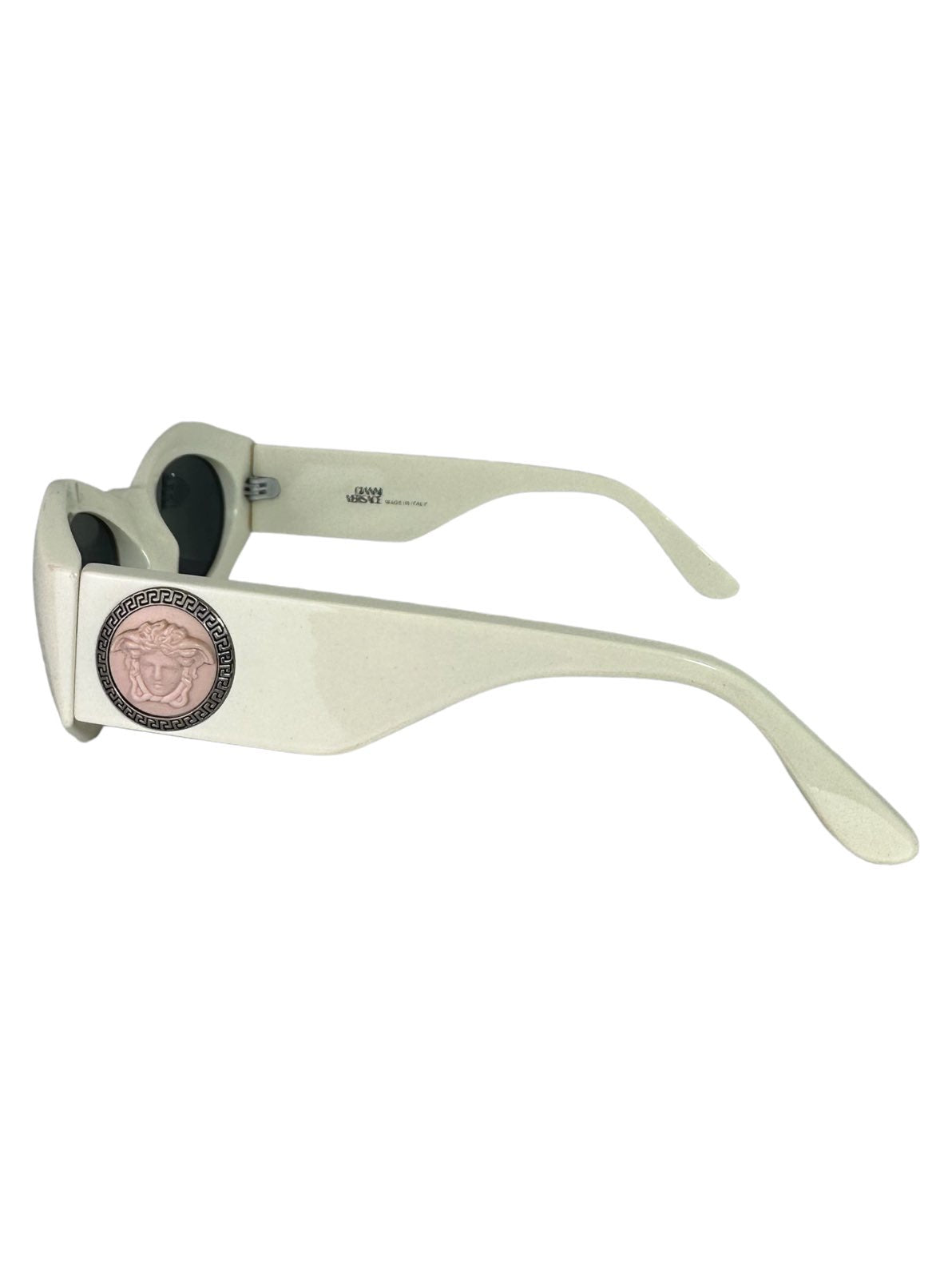 Versace occhiali vintage anni 90s in plastica dura bianca con meduse rosa antico in rilievo sulle bacchette. Montatura asimmetrica con lente scura. Lieve segno impermeabile sulla montatura nella parte frontale. Non vengono spediti con custodia originale di quell’epoca.
