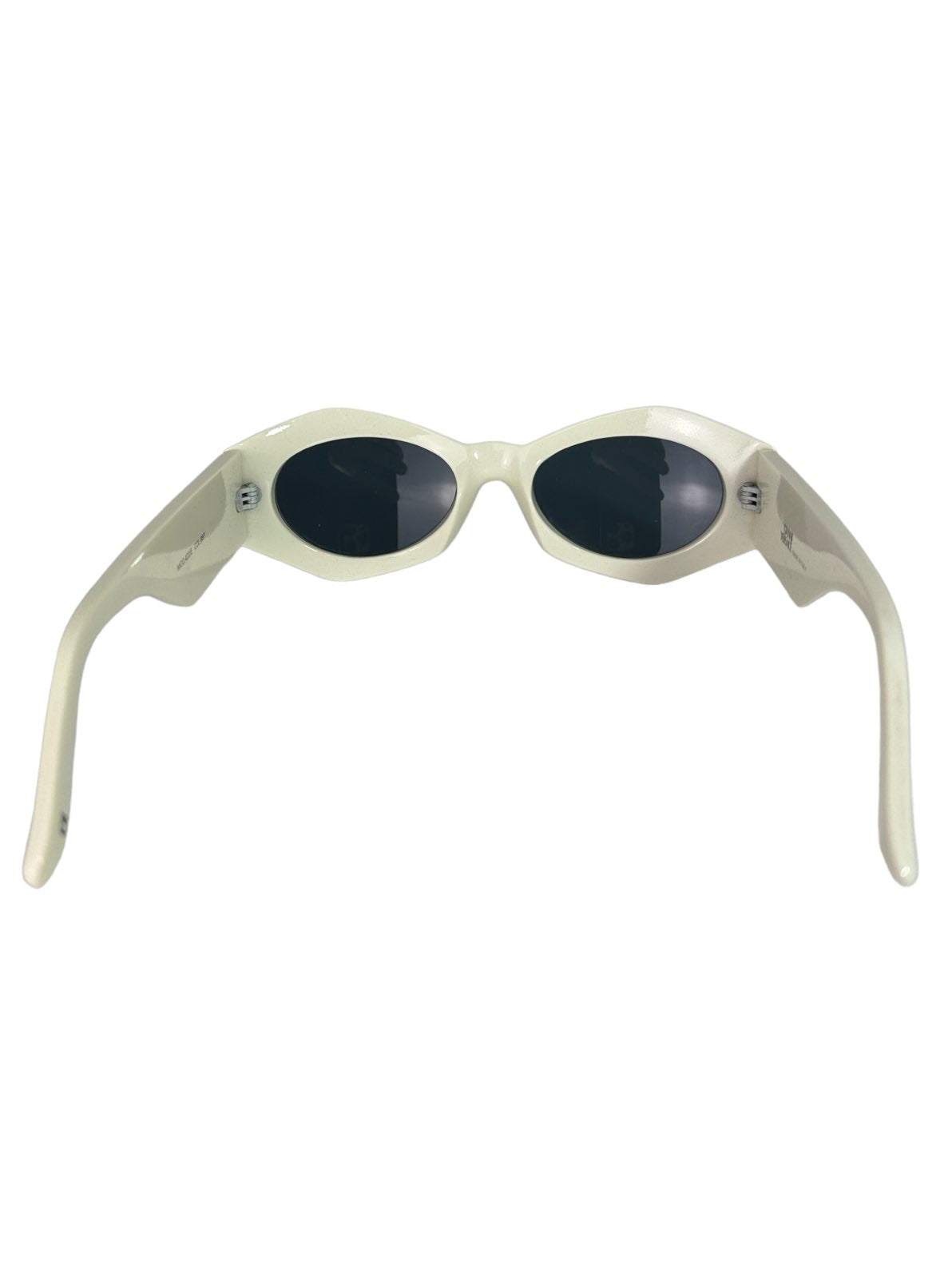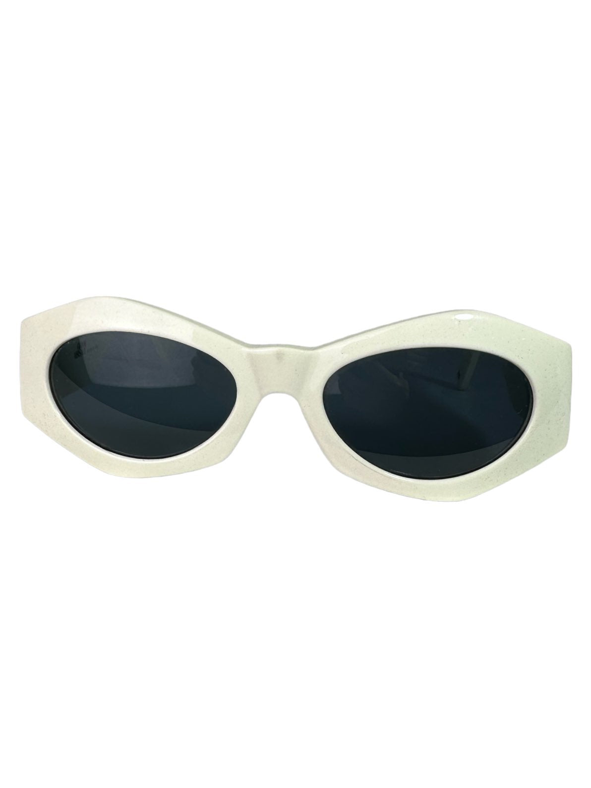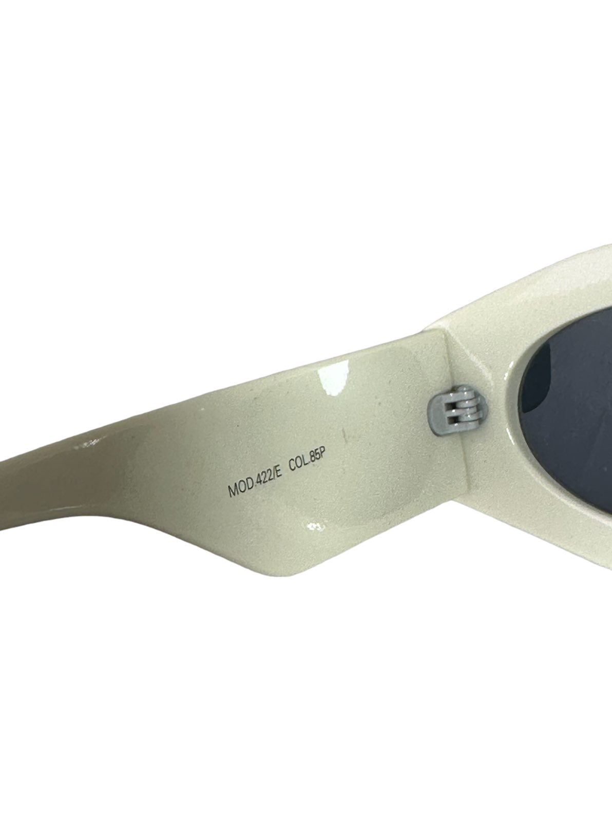 Versace occhiali vintage anni 90s in plastica dura bianca con meduse rosa antico in rilievo sulle bacchette. Montatura asimmetrica con lente scura. Lieve segno impermeabile sulla montatura nella parte frontale. Non vengono spediti con custodia originale di quell’epoca.
