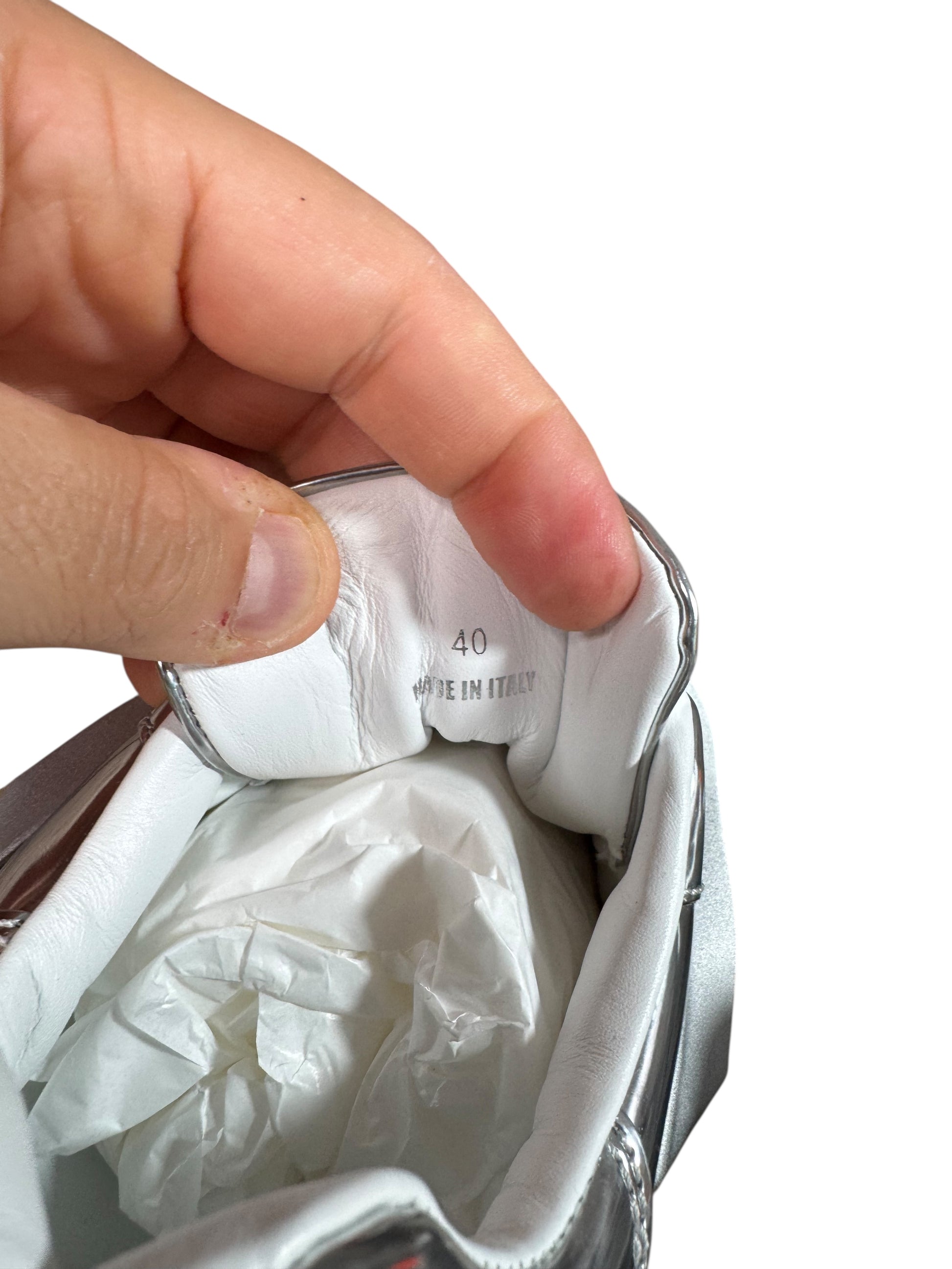 Sneakers Versace Odissea in versione argento metallizzato, caratterizzate dall’iconico logo Medusa 3D in rilievo sulla tomaia. Modello futuristico e di forte impatto visivo, realizzato in Italia con materiali premium. Suola scolpita con logo Versace, interni in pelle bianca e finiture di alta qualità.