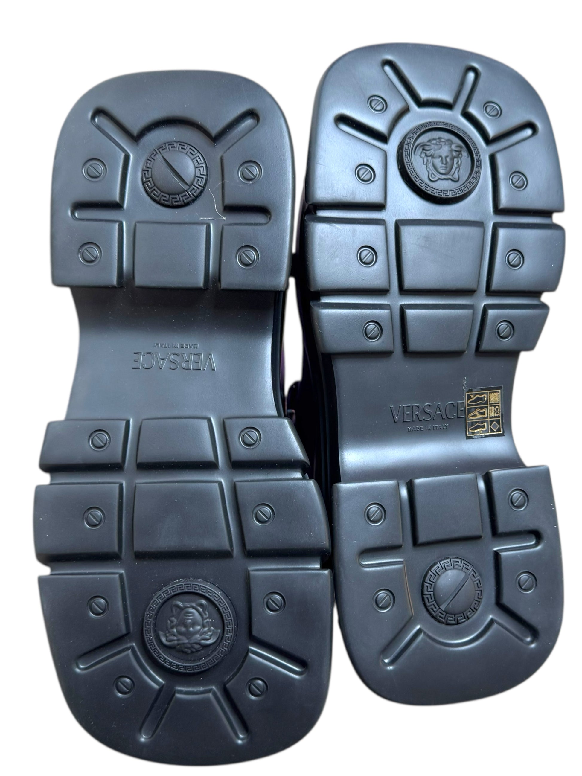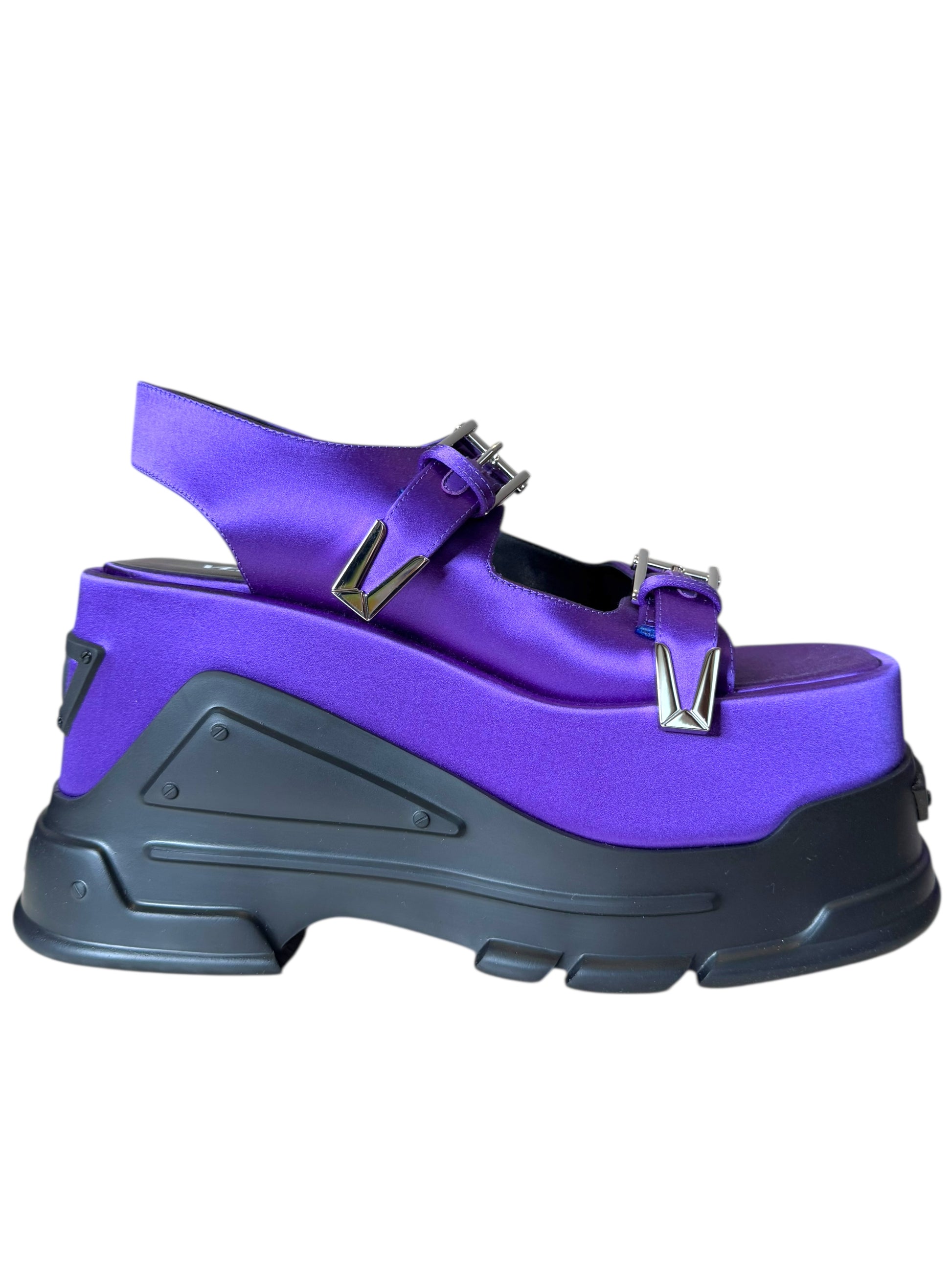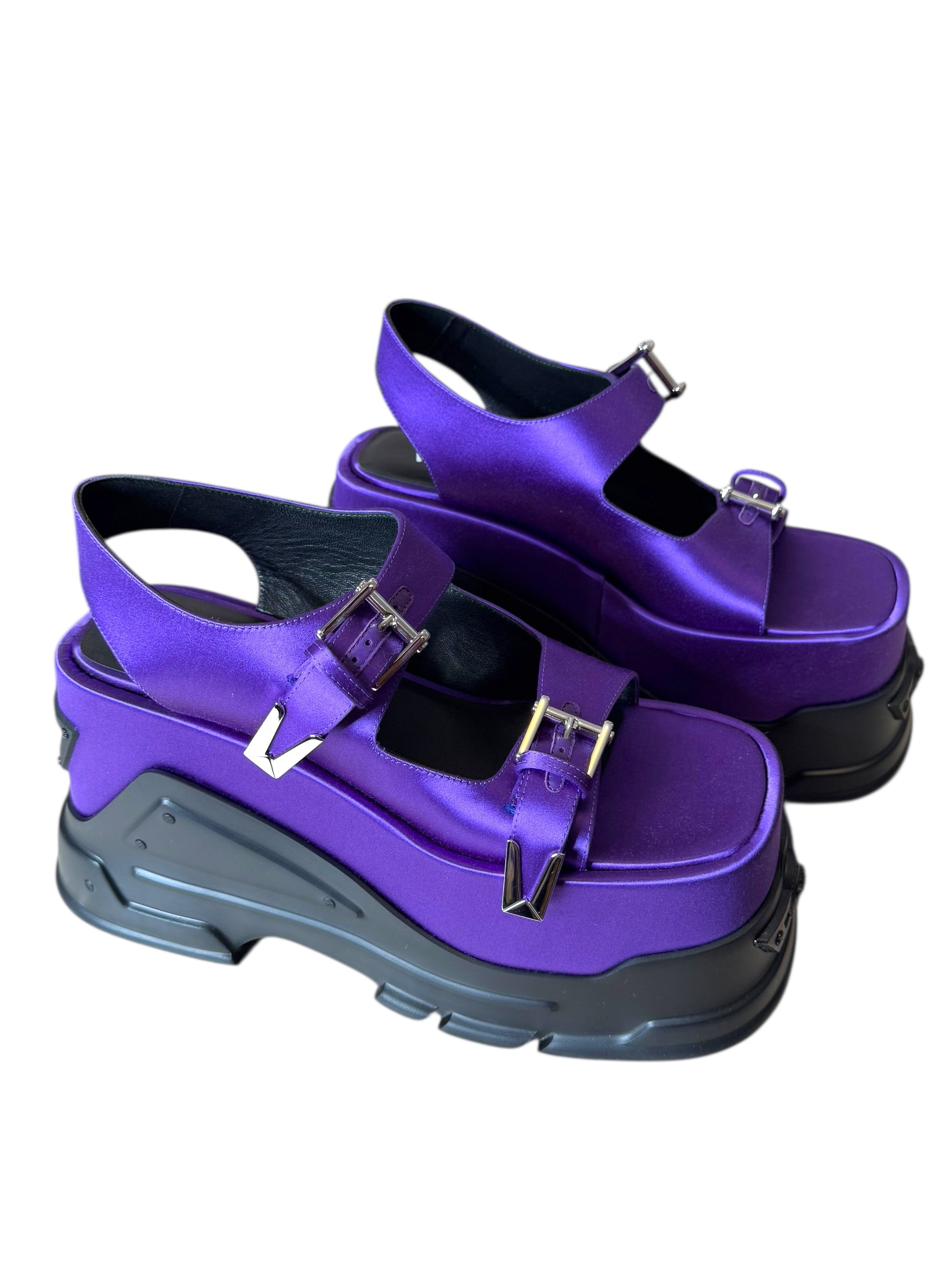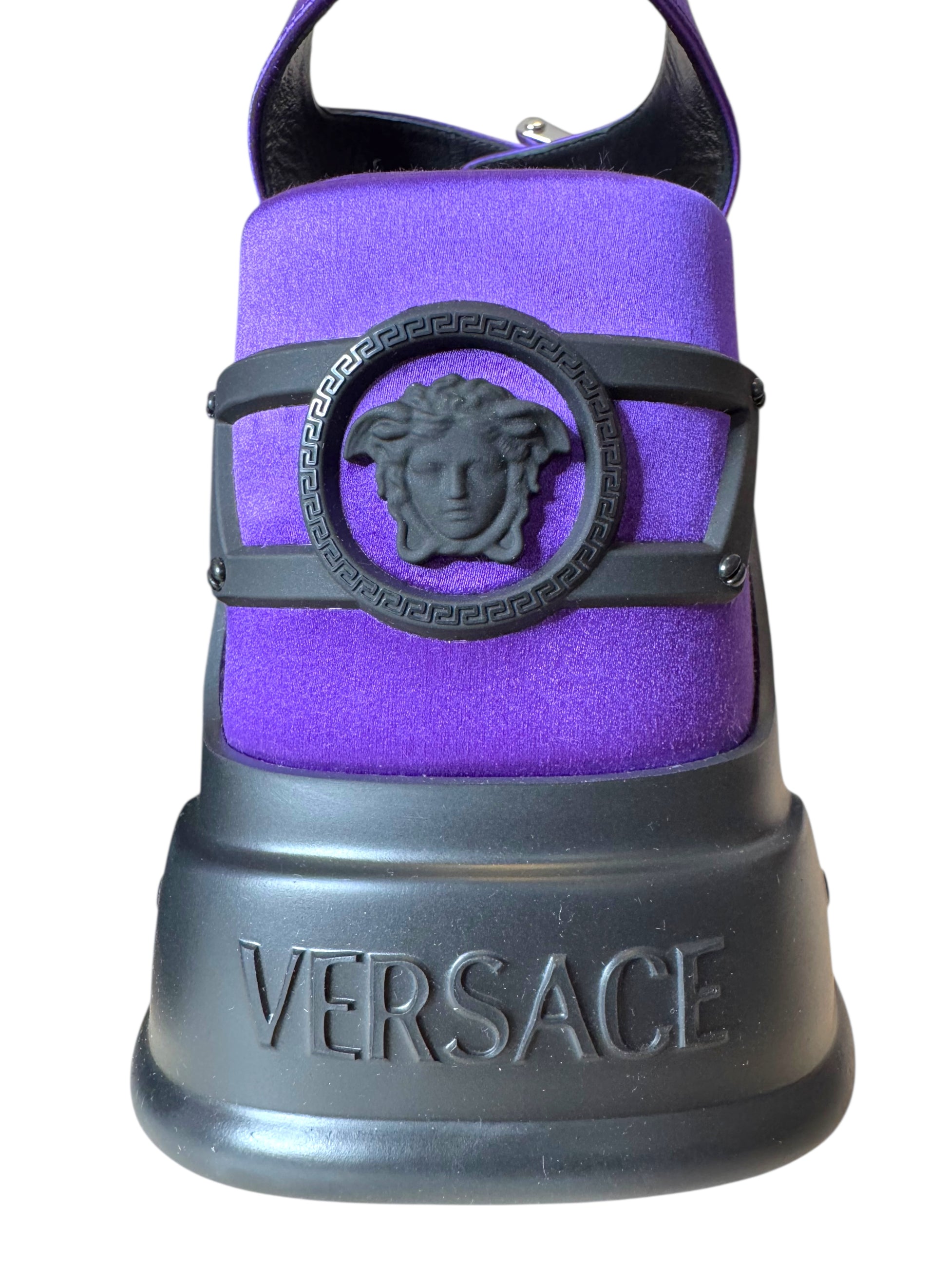 Sandali platform Versace in satin viola con suola chunky in gomma nera. Design contemporaneo con doppia fibbia regolabile e dettagli iconici Medusa sul tallone e sulla suola. Plantare rivestito in pelle per massimo comfort. Modello audace e moderno, perfetto per aggiungere un tocco fashion a qualsiasi outfit.