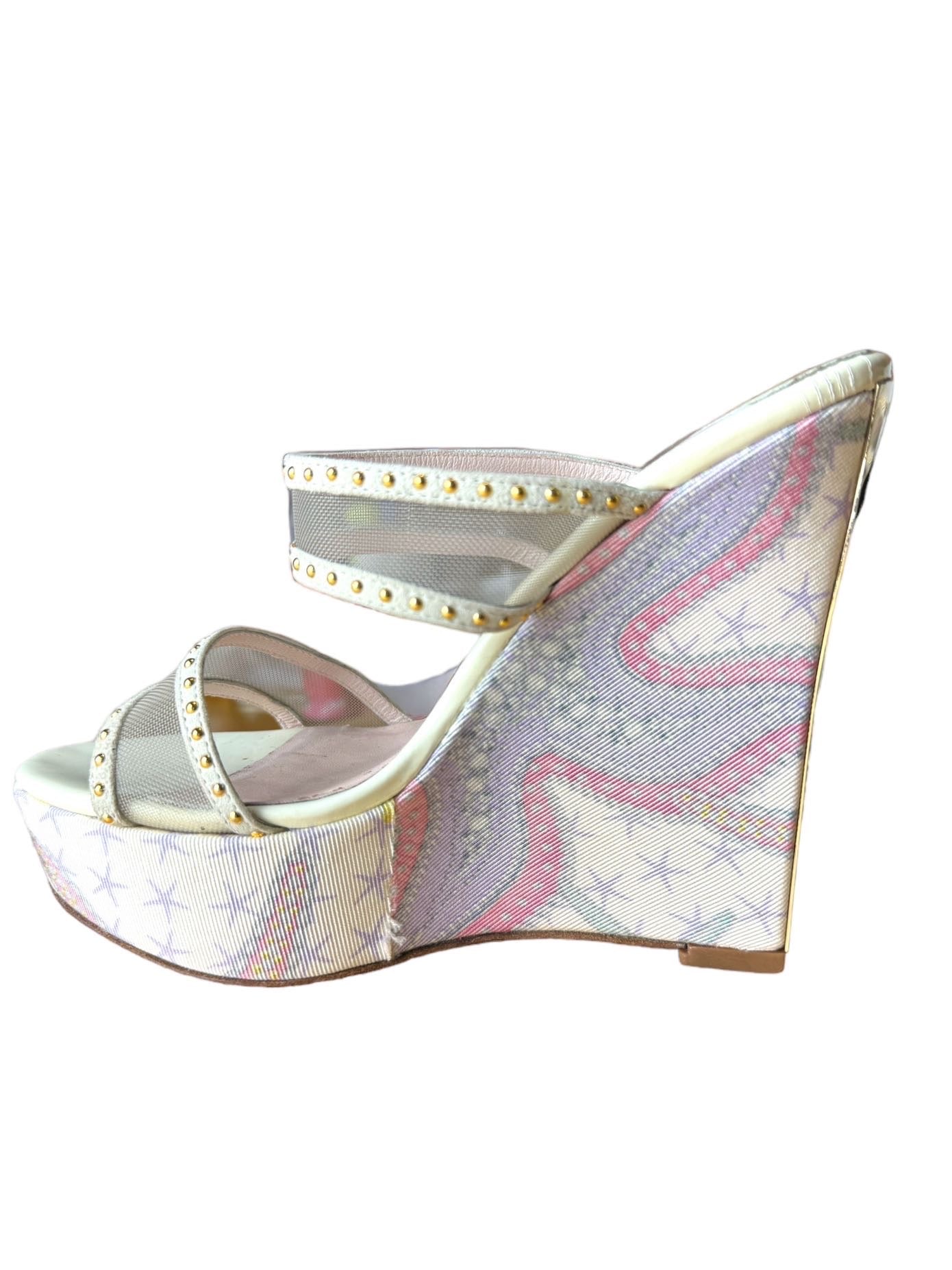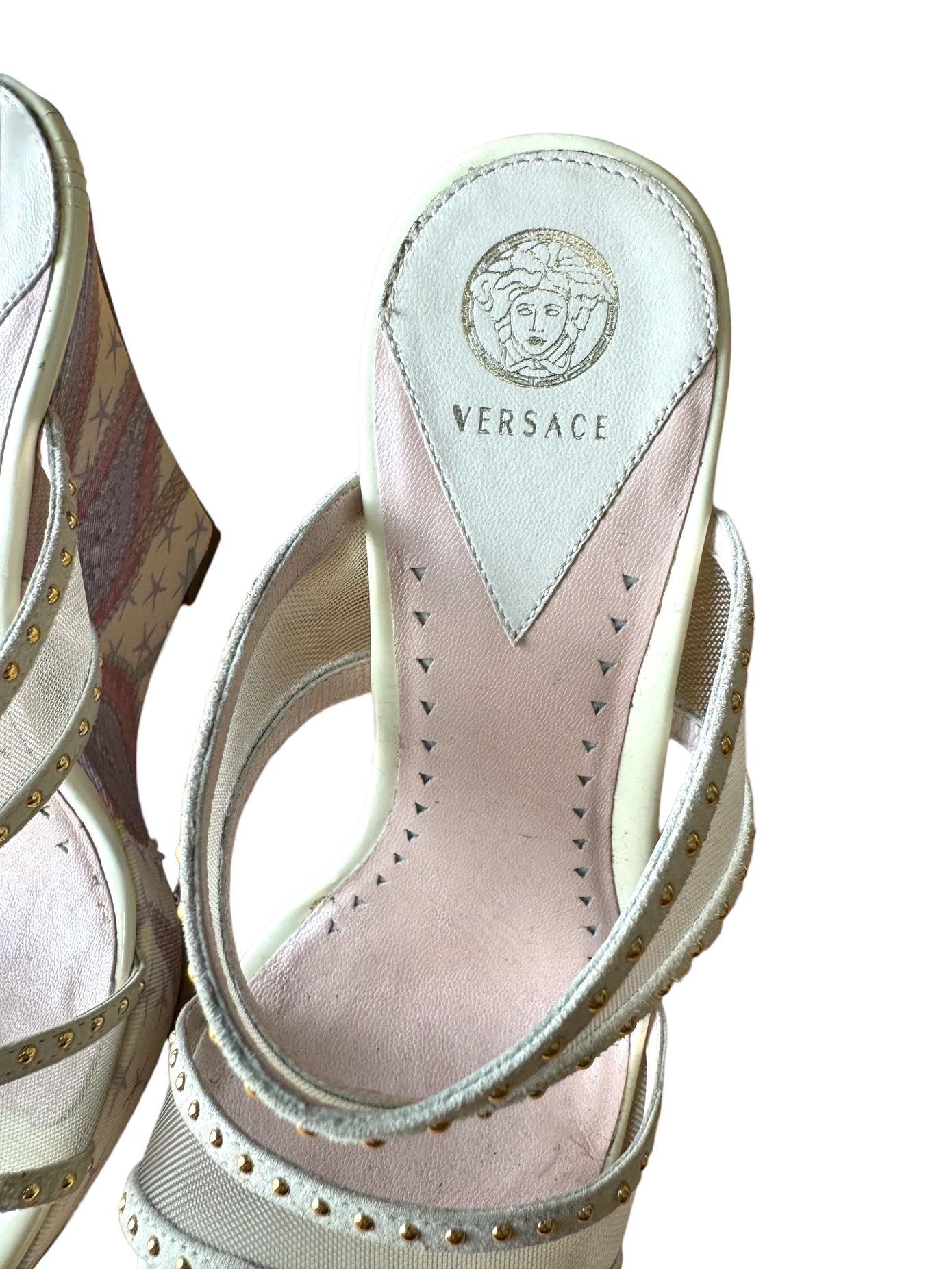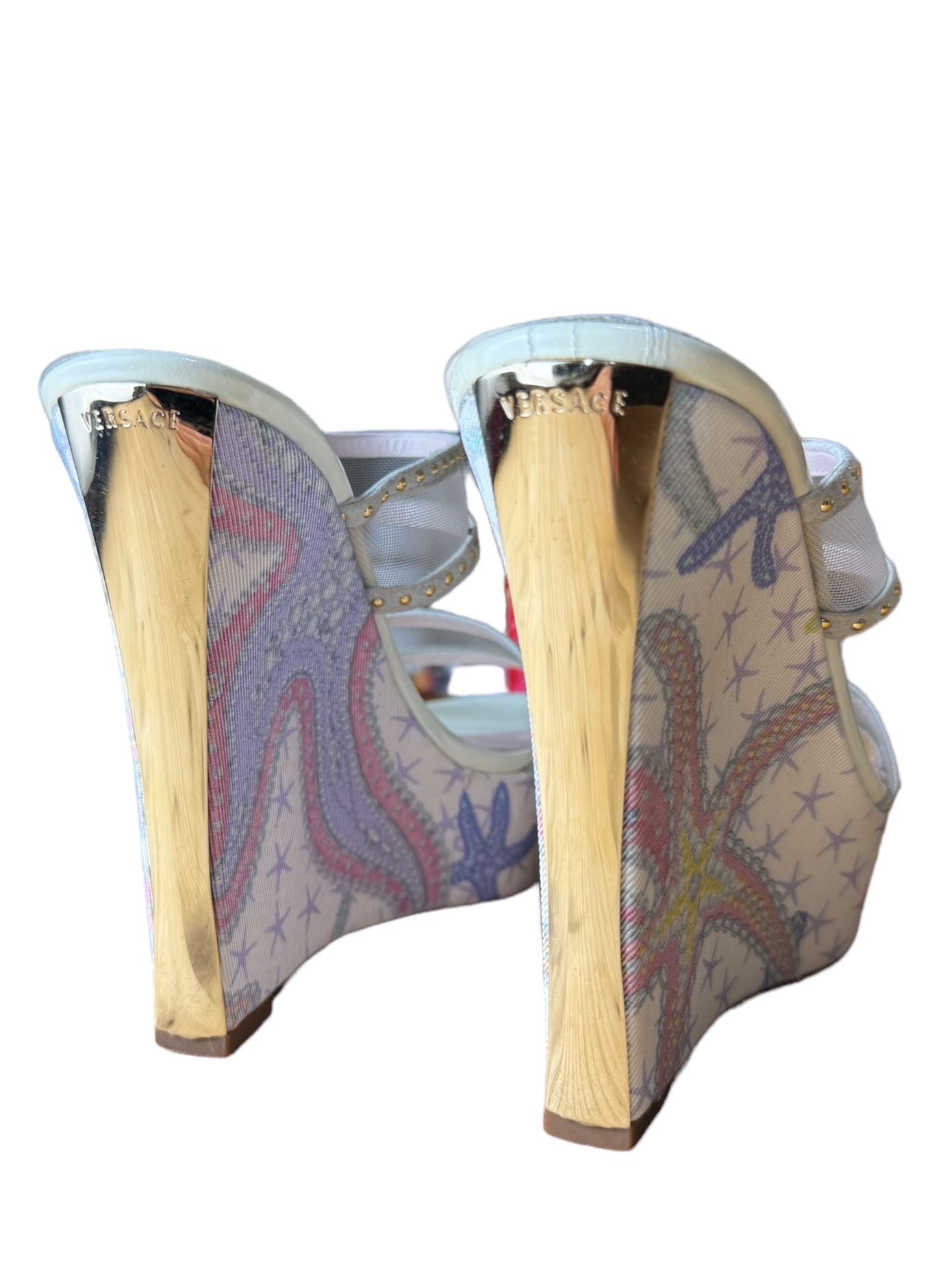 Versace sandali tresor de la mer con zeppa e placca dorata sul retro. Numero 35