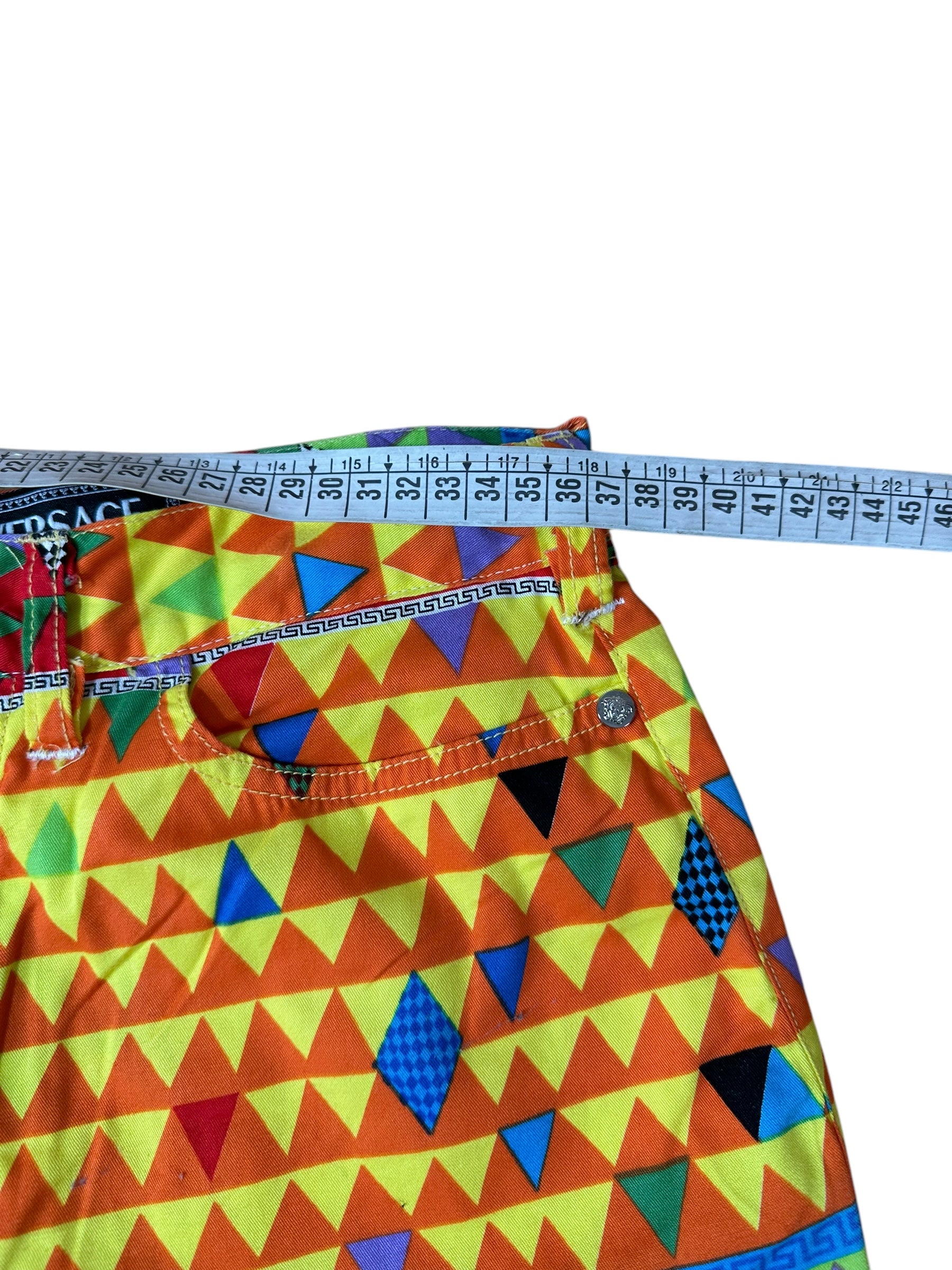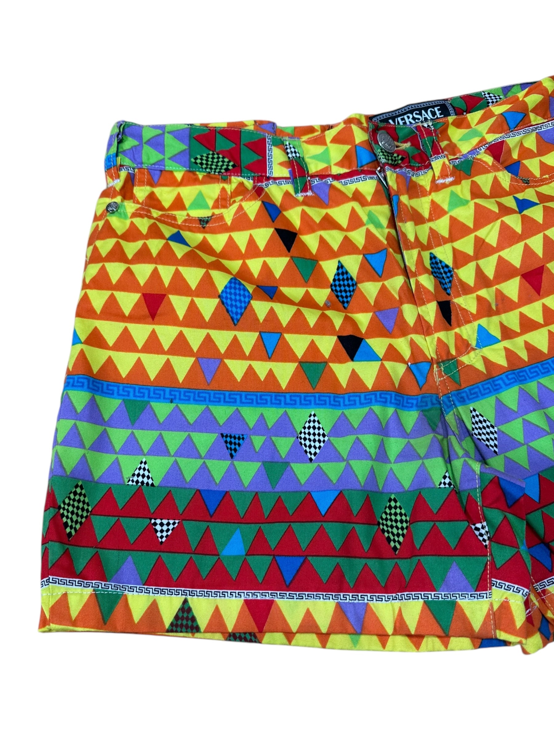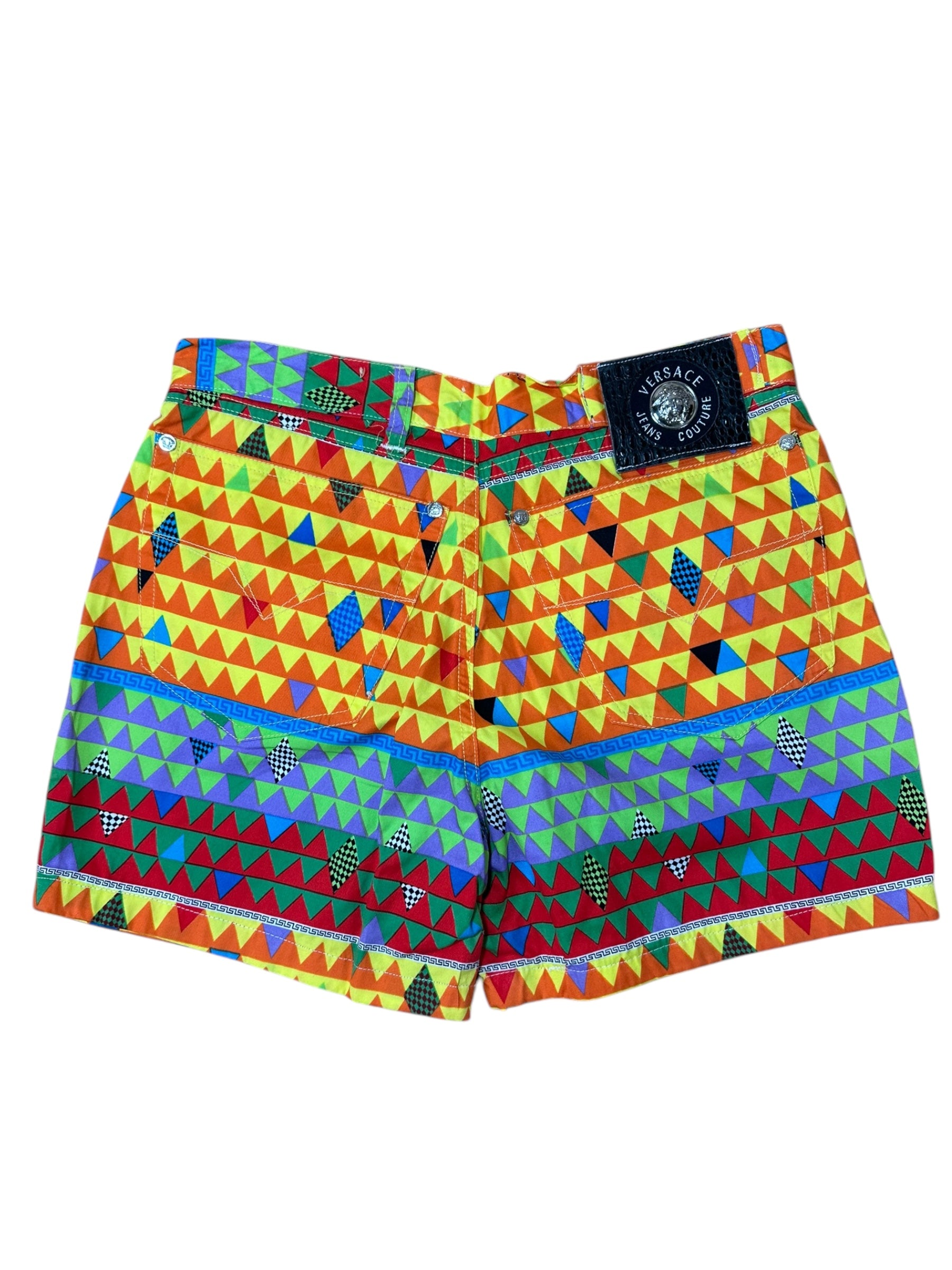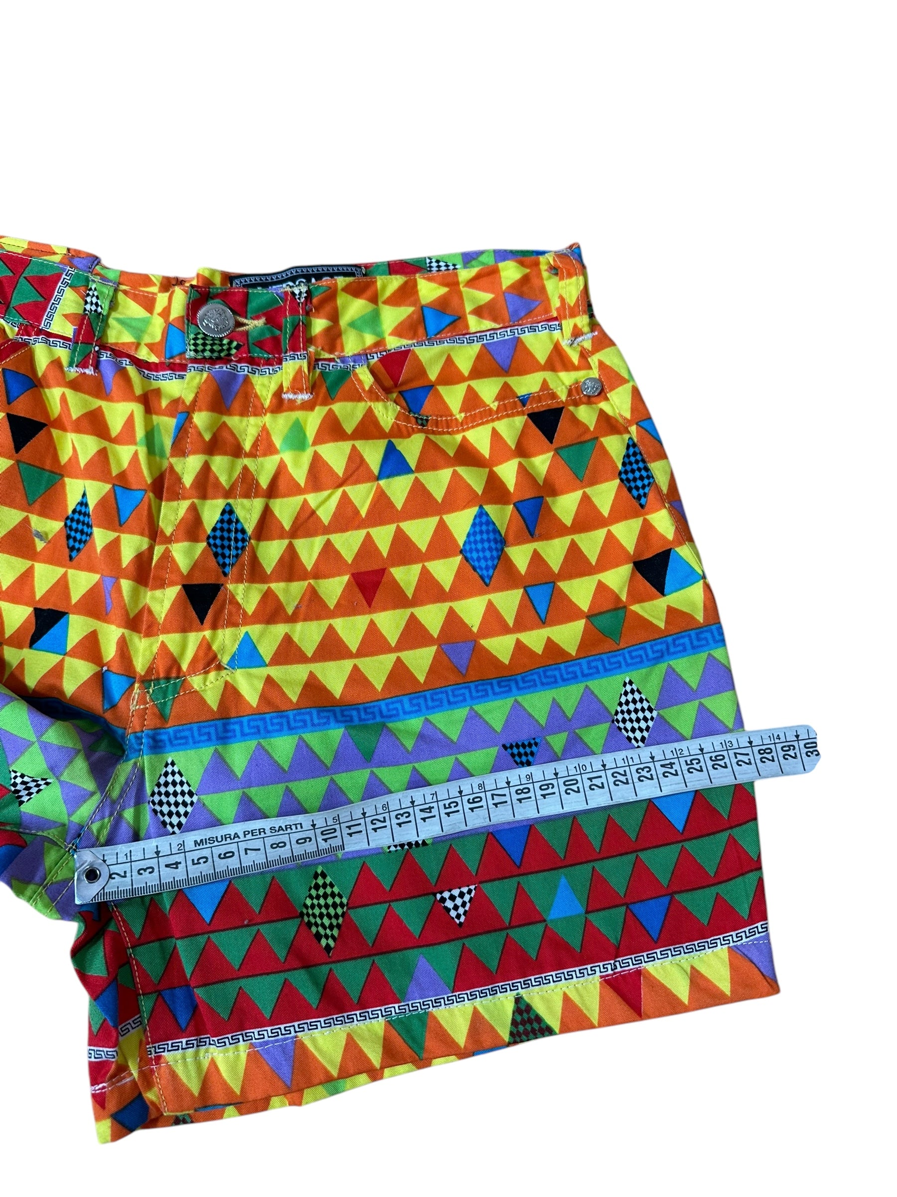 Shorts vintage firmati Versace Jeans Couture, realizzati in 100% cotone. Il capo presenta una stampa geometrica coloratissima con motivi a triangolo, in tonalità vivaci di arancione, giallo, verde, rosso, blu e nero.