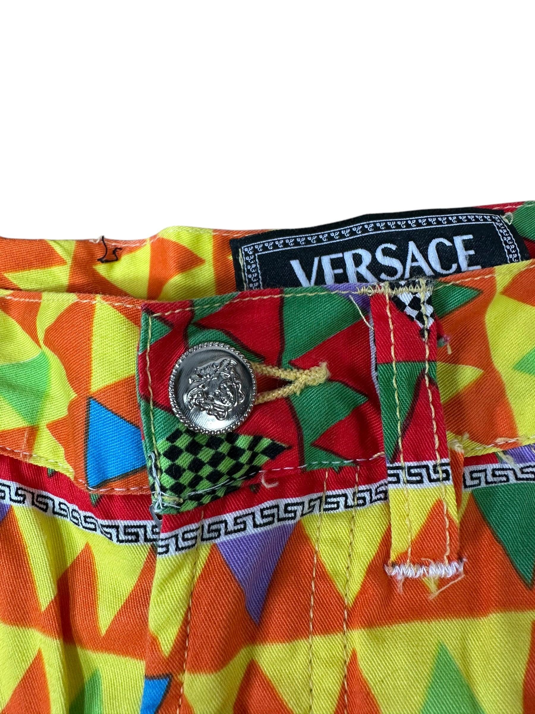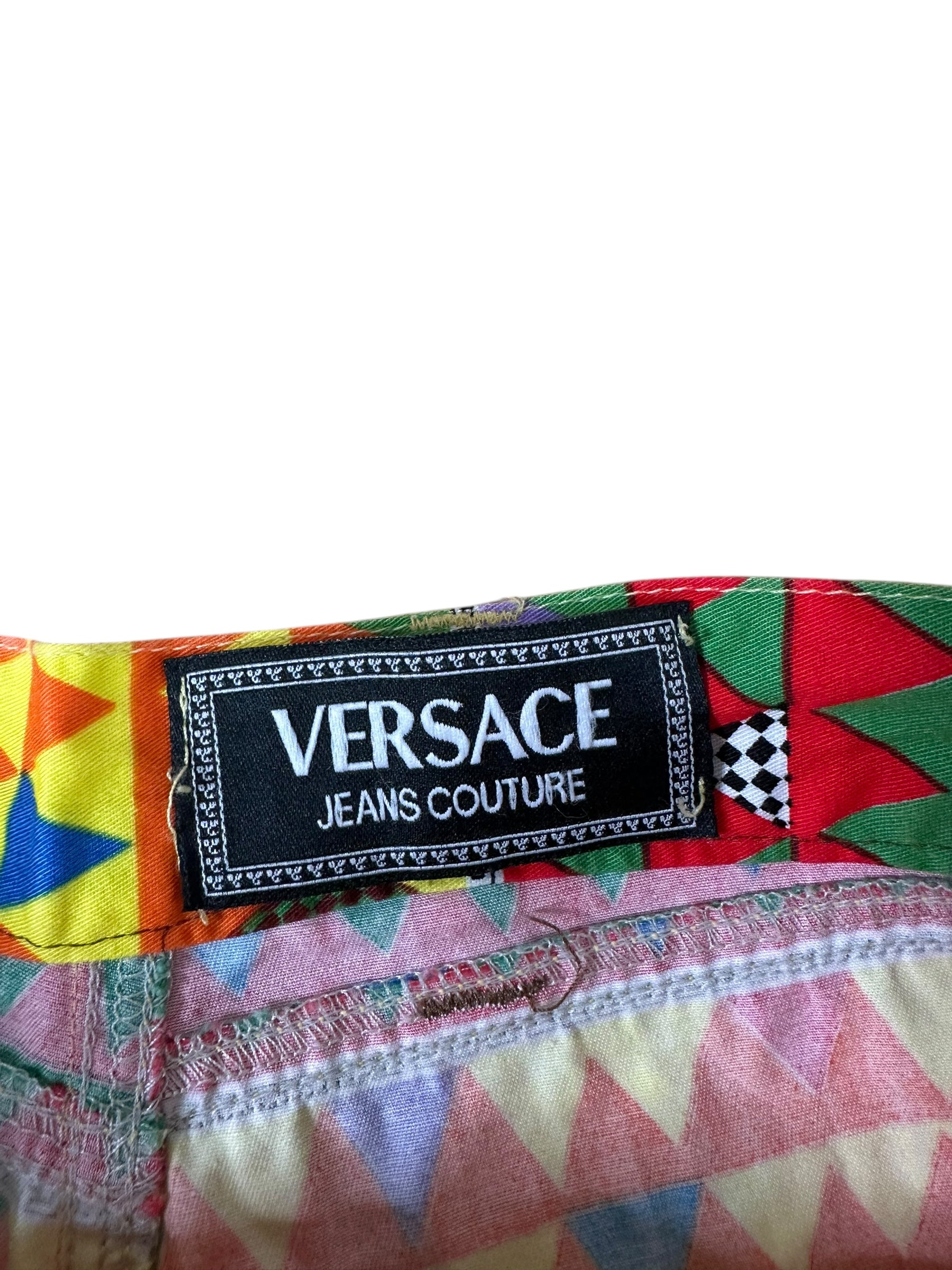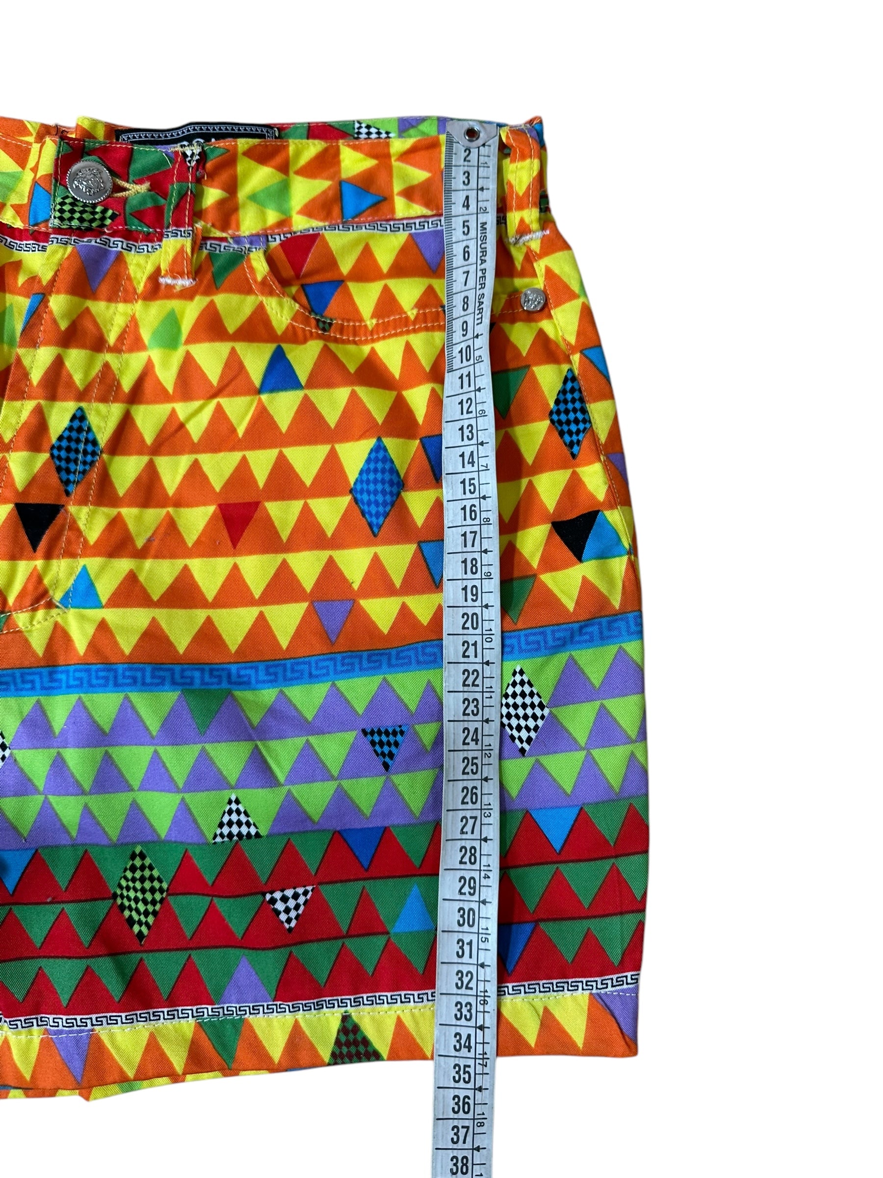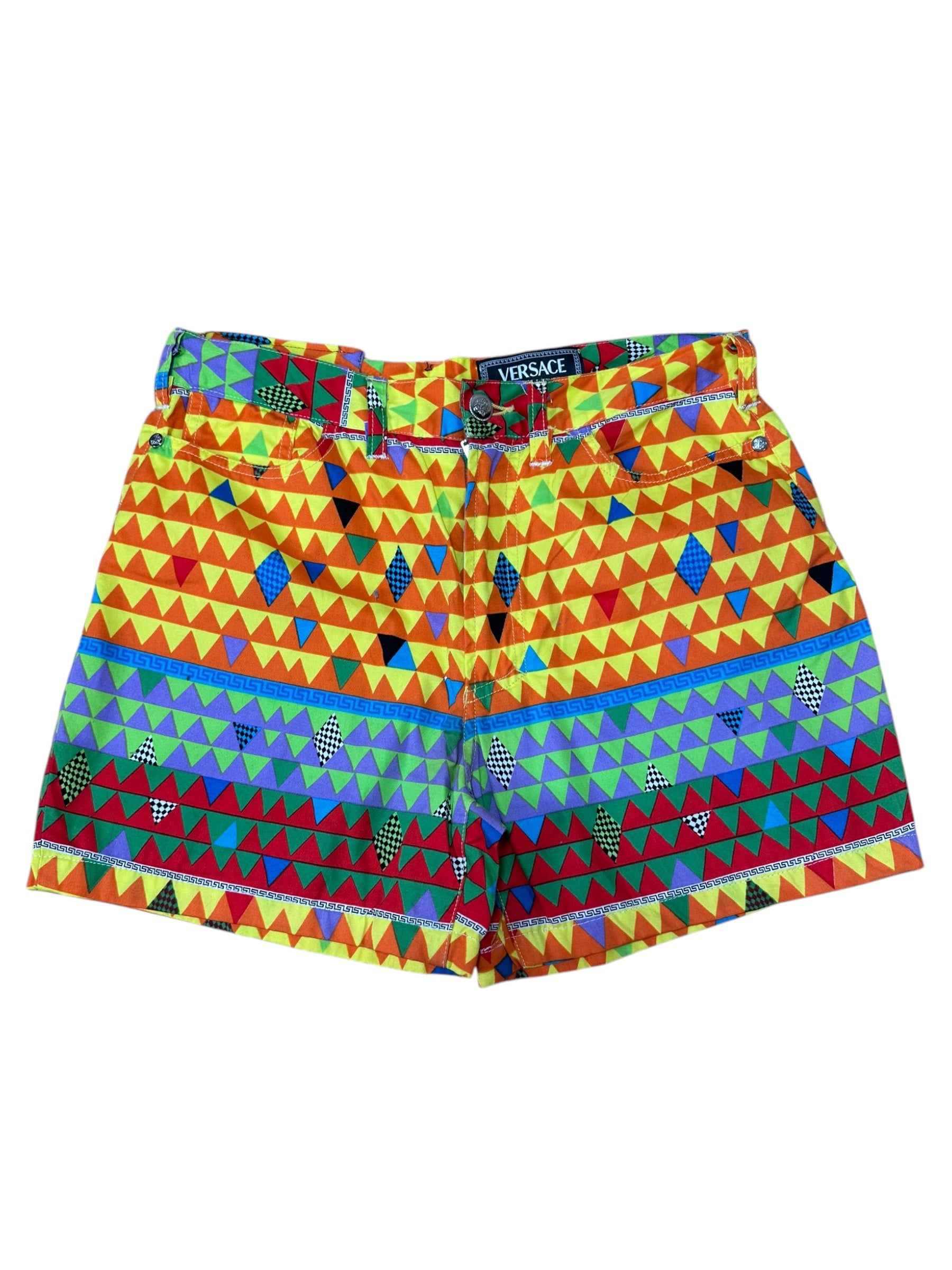 Shorts vintage firmati Versace Jeans Couture, realizzati in 100% cotone. Il capo presenta una stampa geometrica coloratissima con motivi a triangolo, in tonalità vivaci di arancione, giallo, verde, rosso, blu e nero.