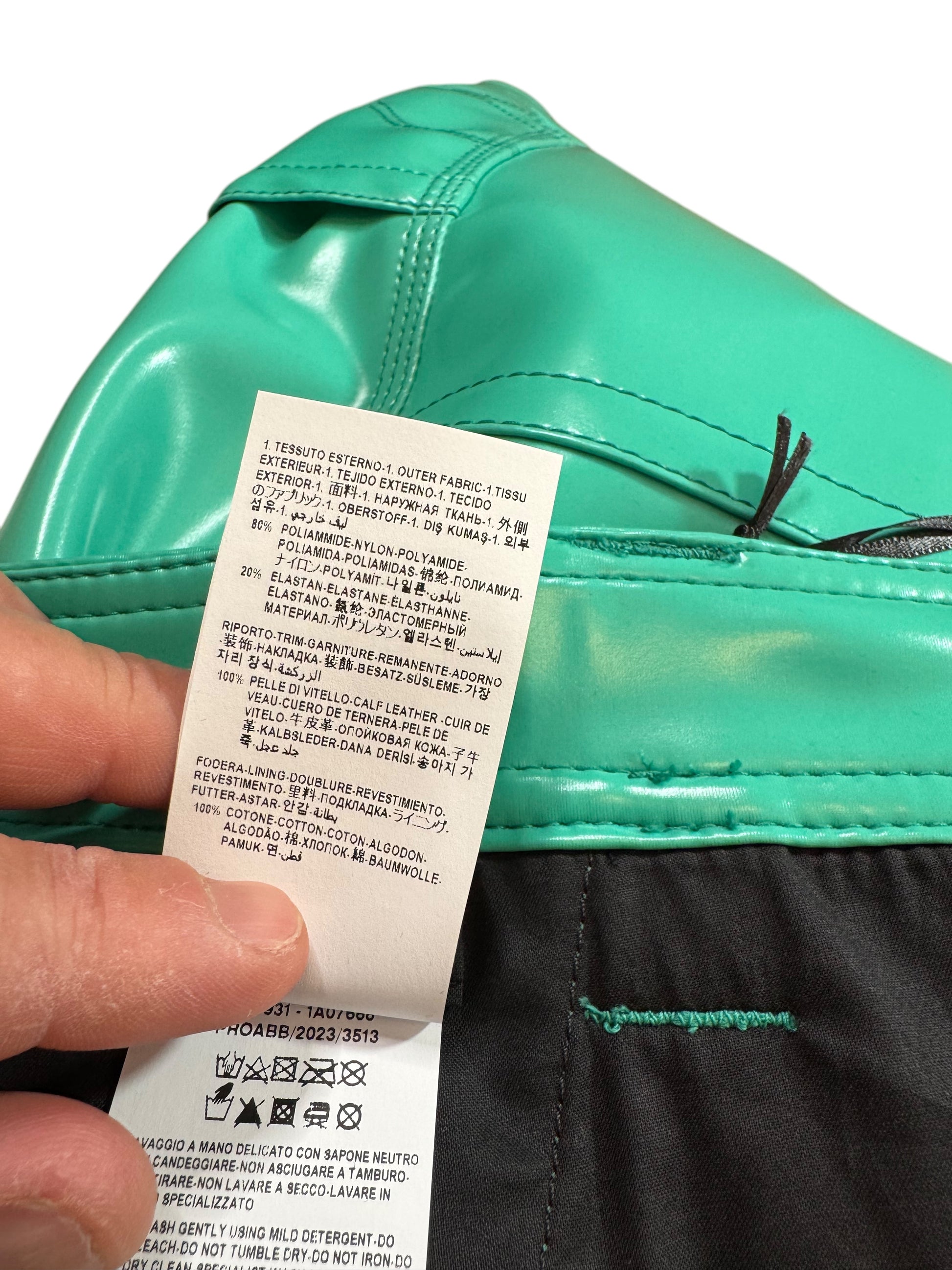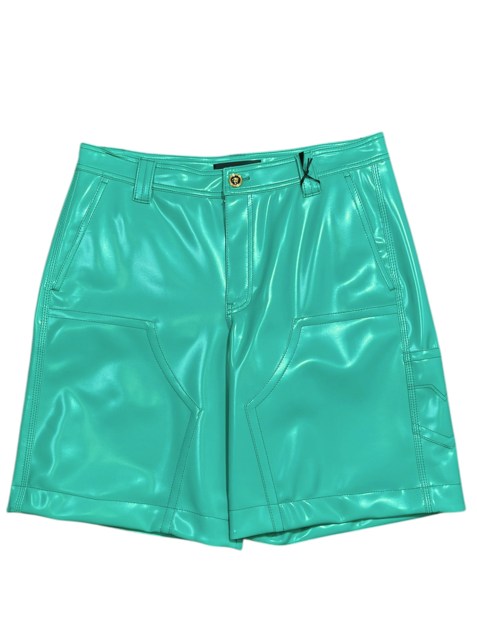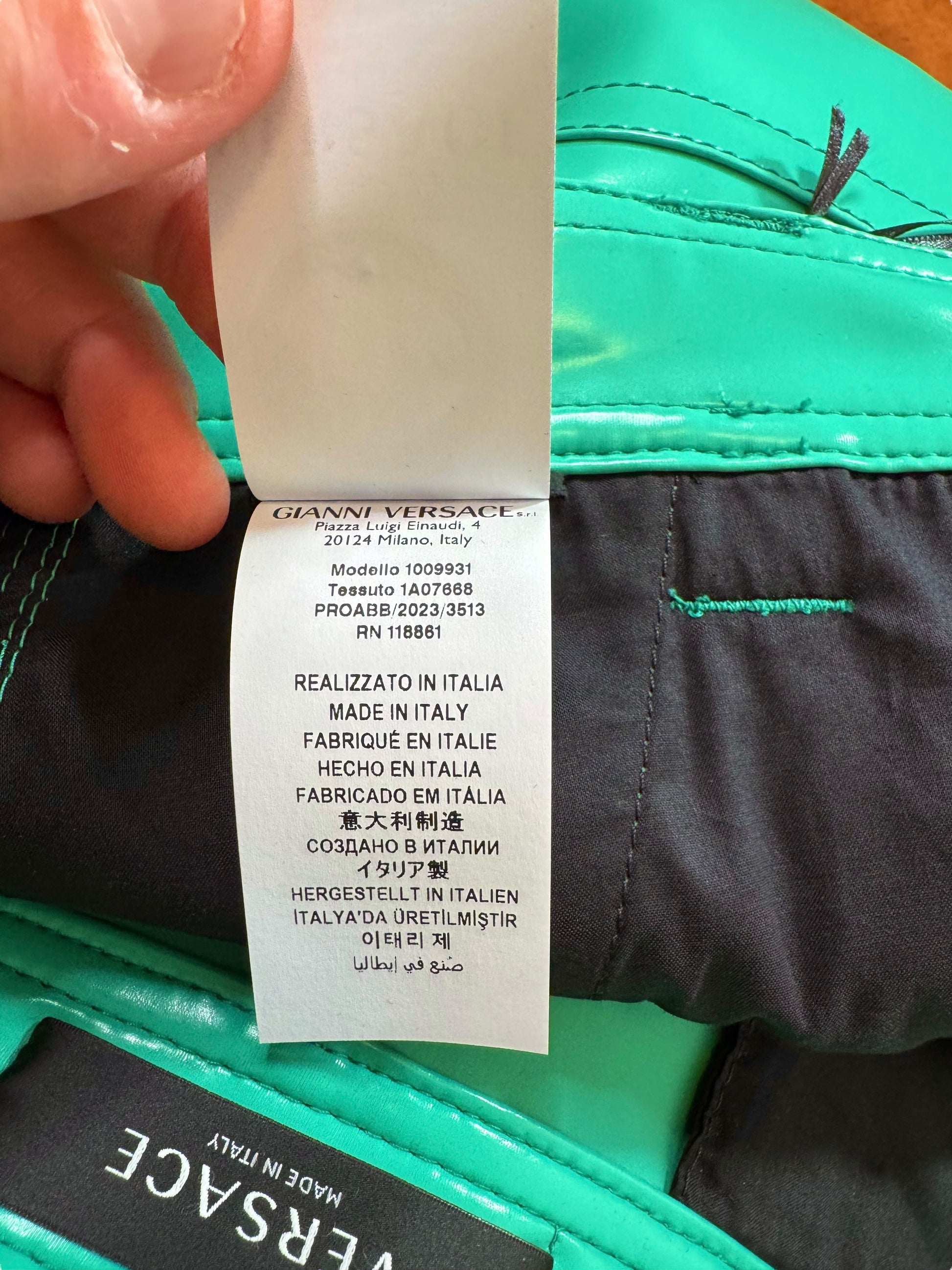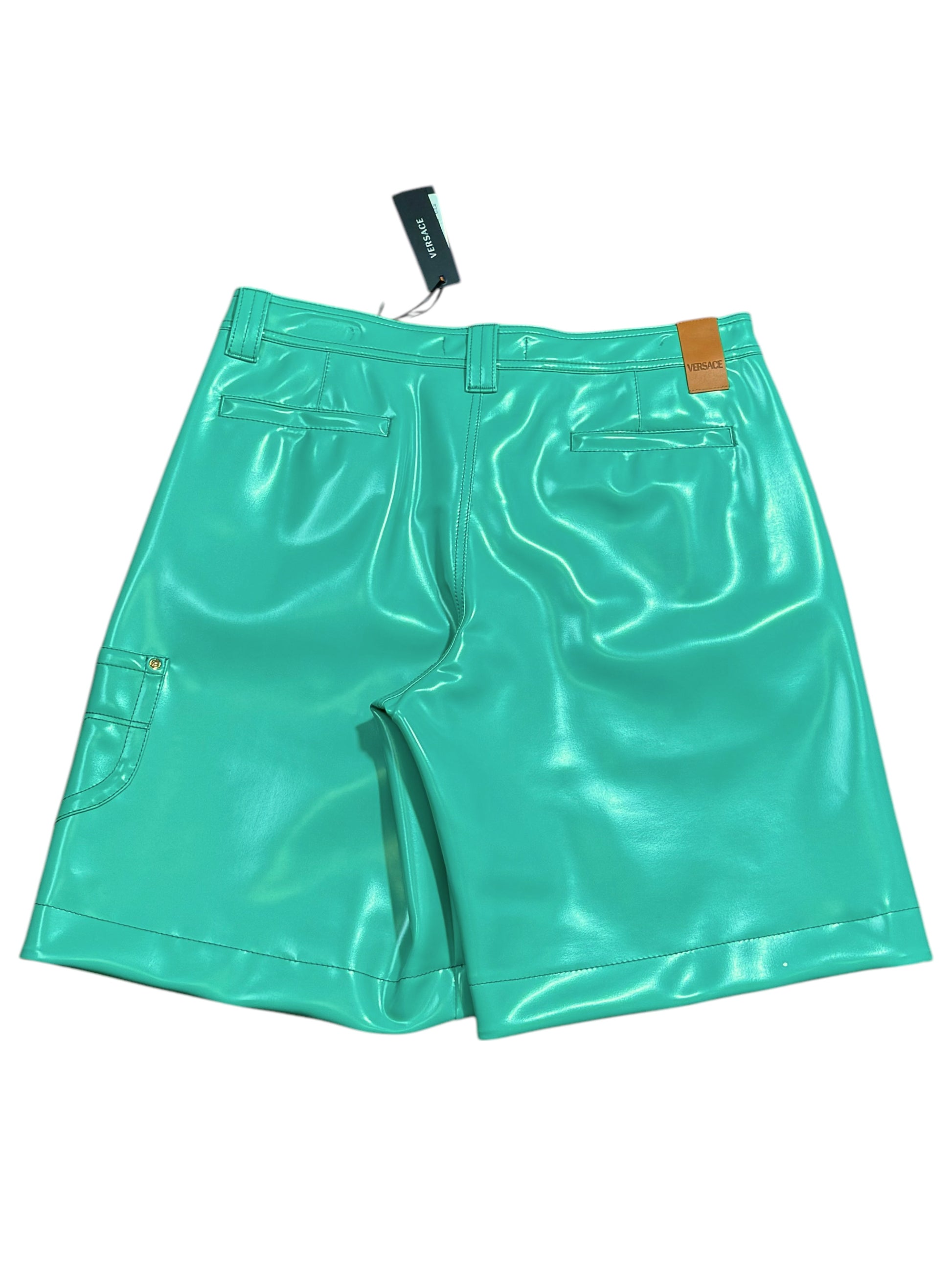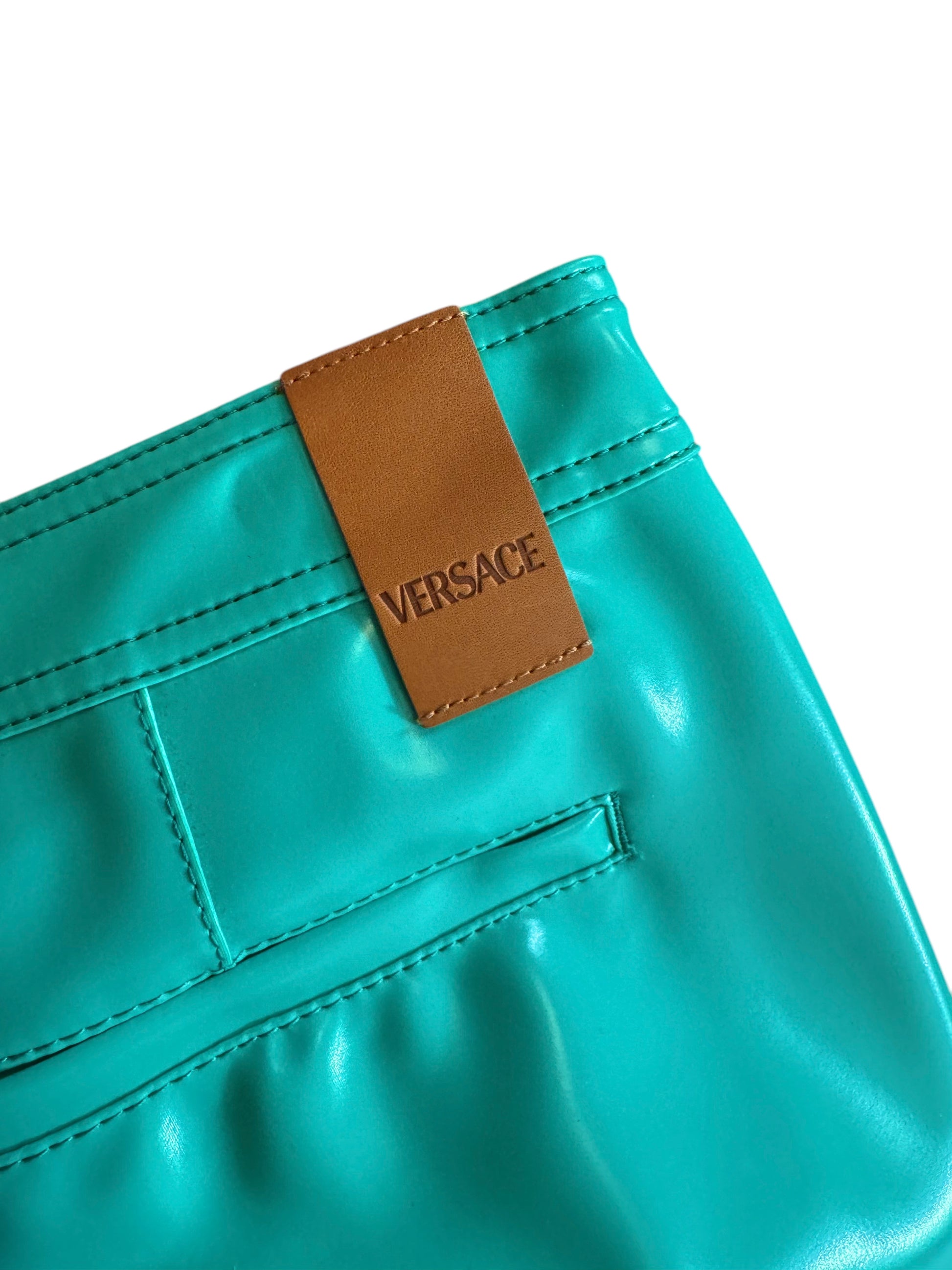 Shorts da uomo Versace, realizzati in Italia in materiale gommato spesso, dall’aspetto lucido e struttura solida. Colore verde acqua acceso, chiusura con bottone Medusa dorato, passanti per cintura, tasche laterali e posteriori, dettaglio in vera pelle con logo Versace sul retro. Un capo statement, ideale per chi cerca uno stile deciso e contemporaneo.