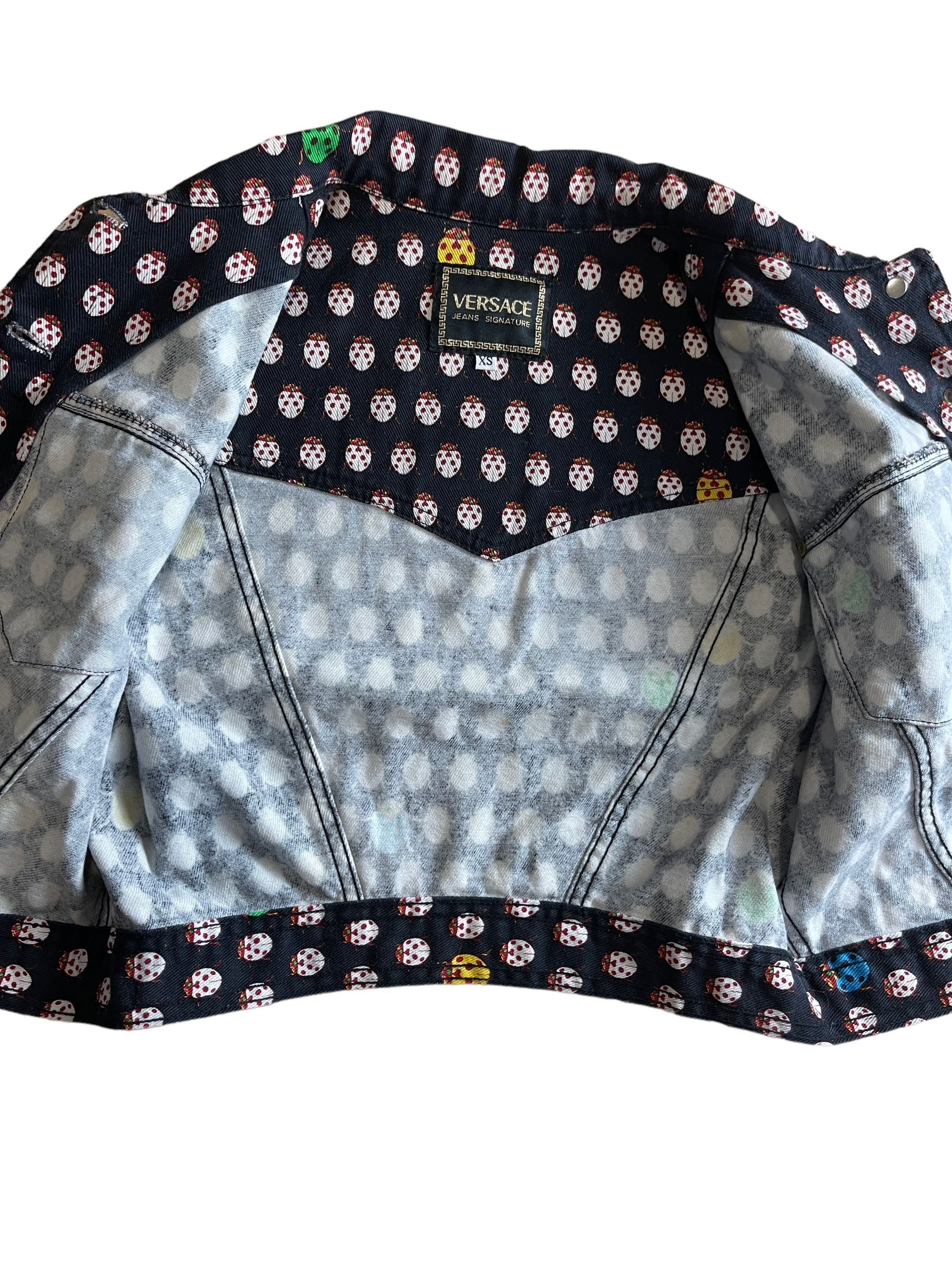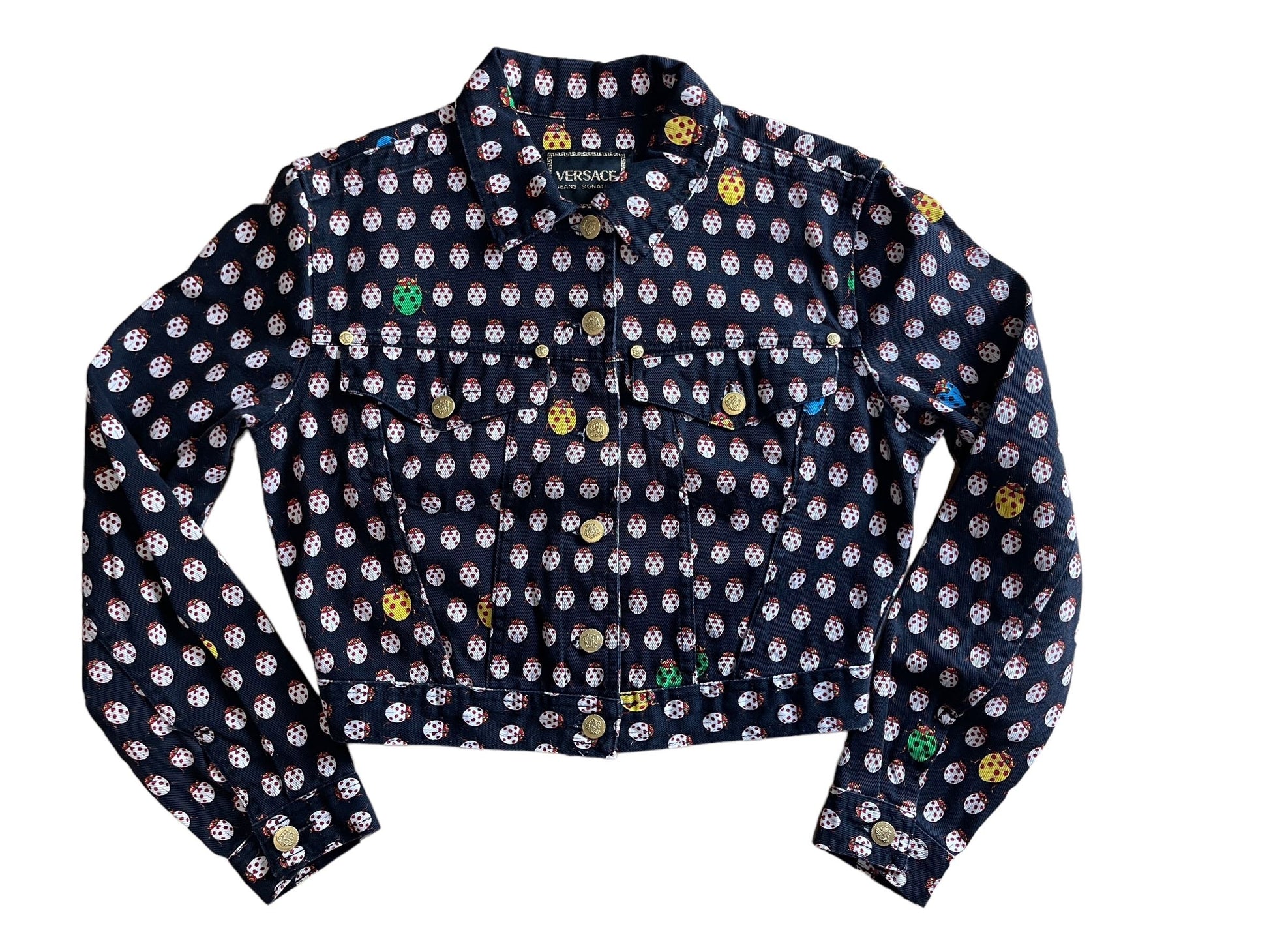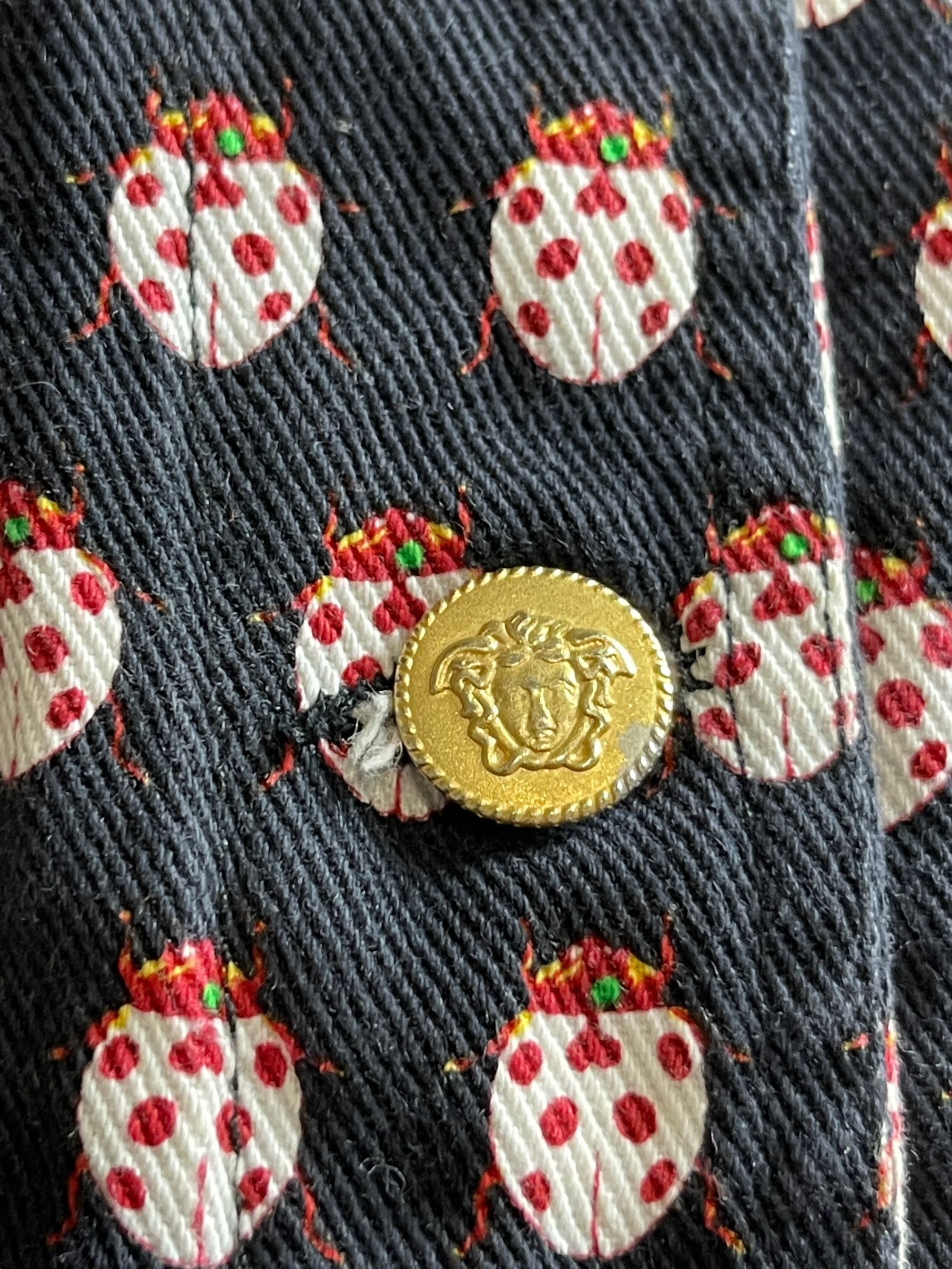 Gianni Versace, linea Versace jeans signature, giacca corta in cotone con stampa coccinella e bottoni dorati con