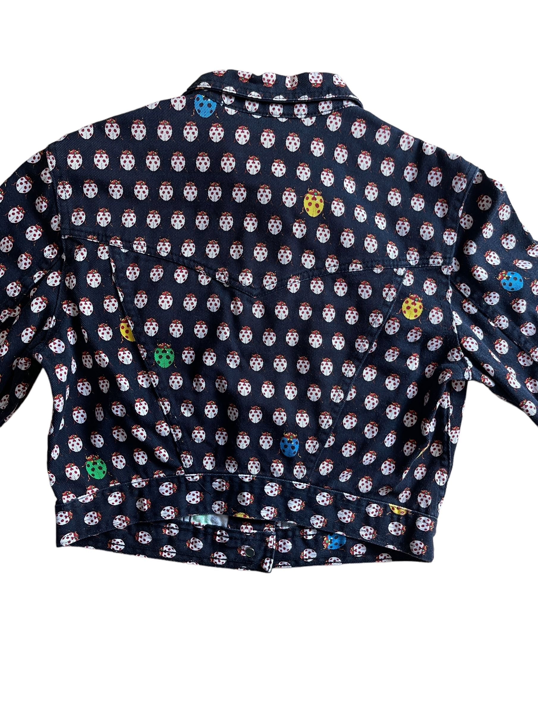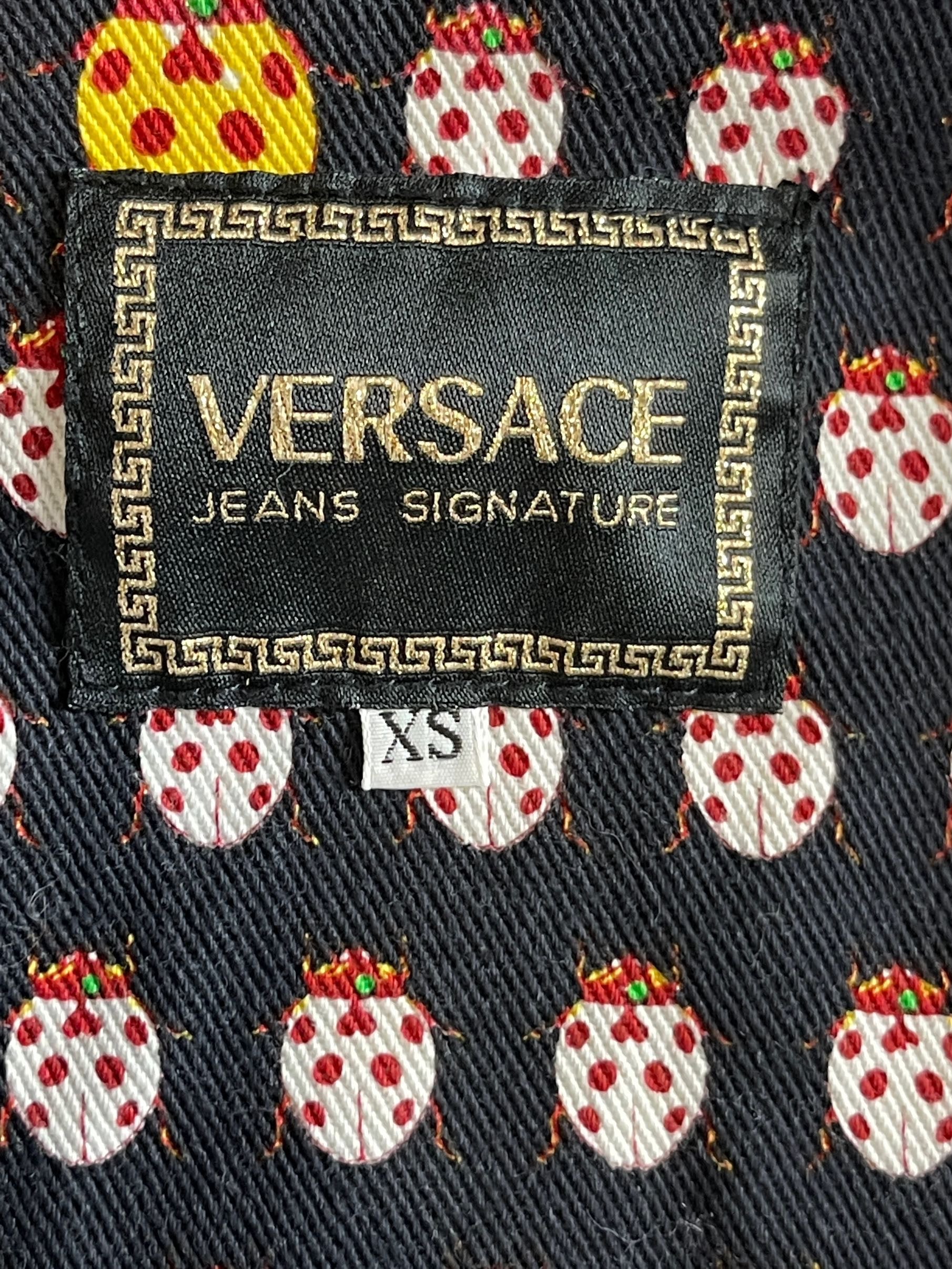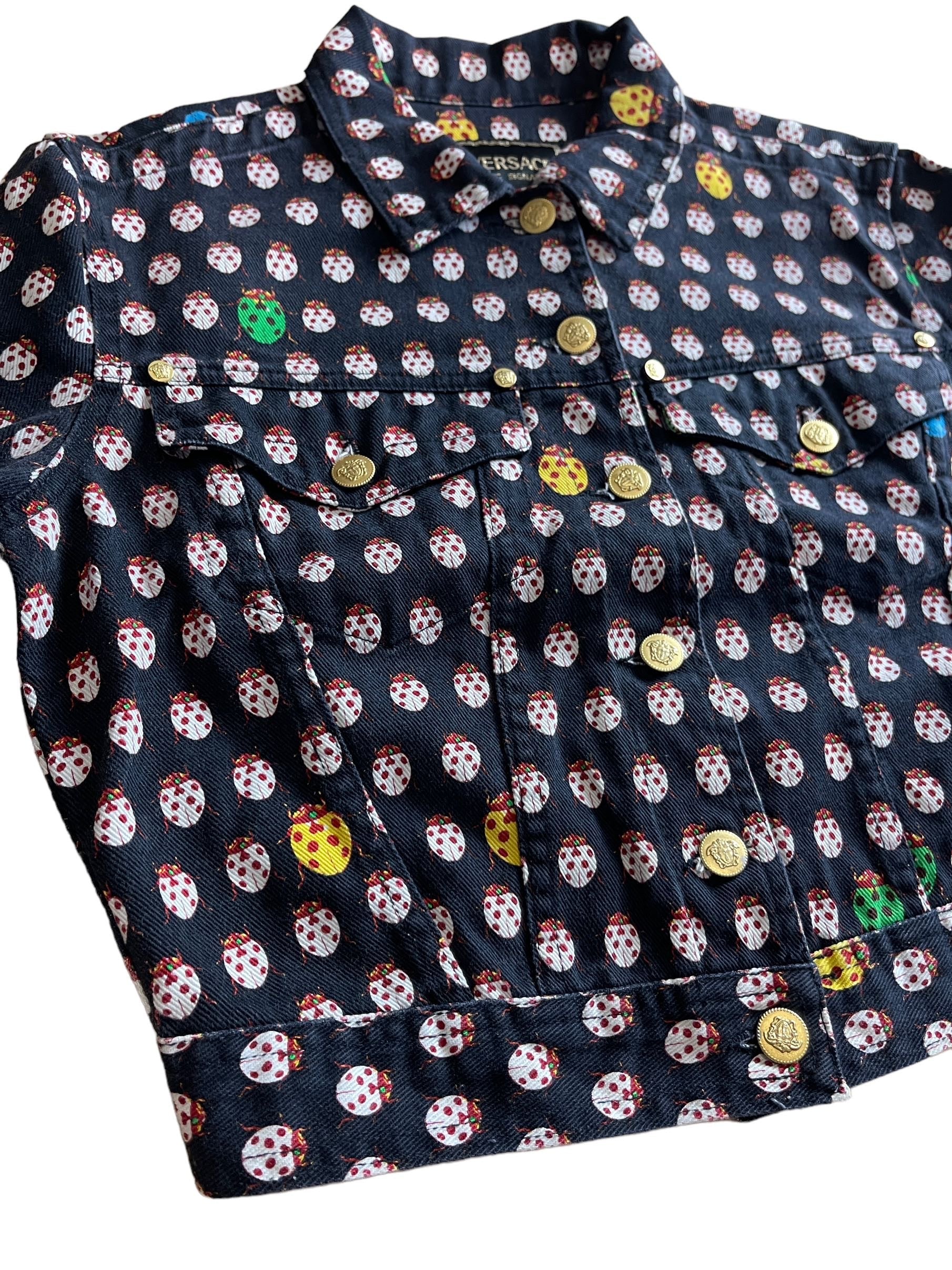 Gianni Versace, linea Versace jeans signature, giacca corta in cotone con stampa coccinella e bottoni dorati con