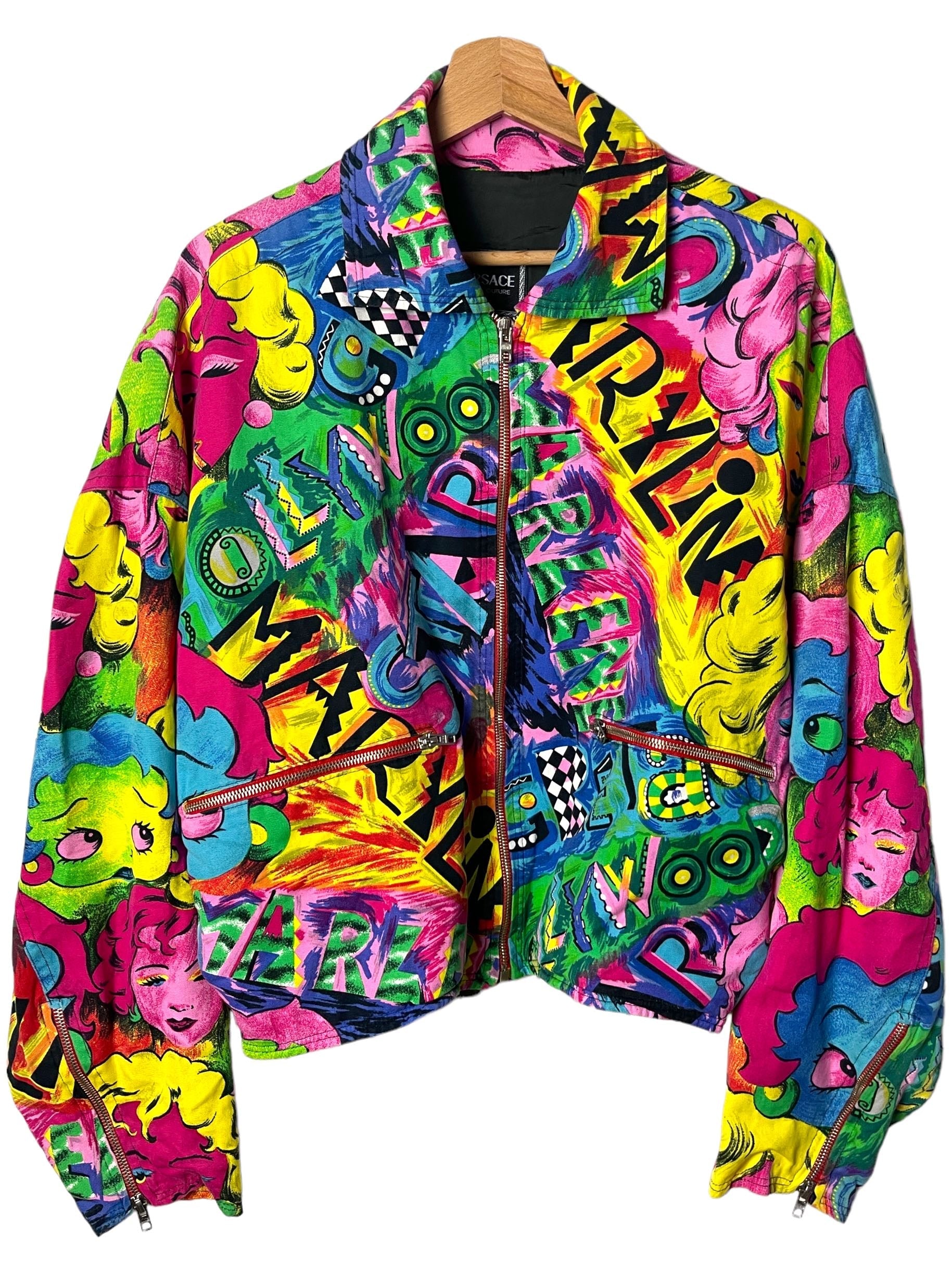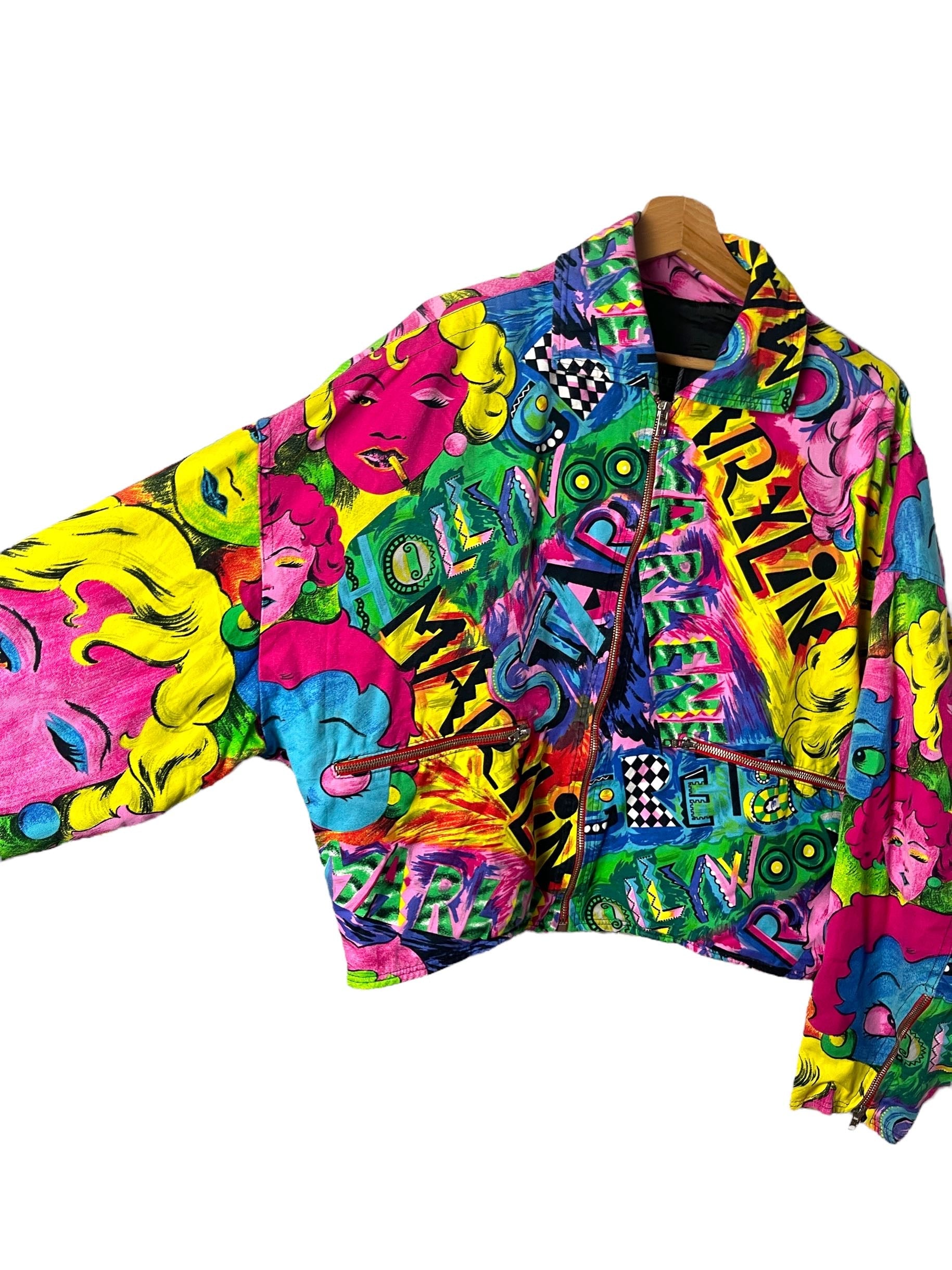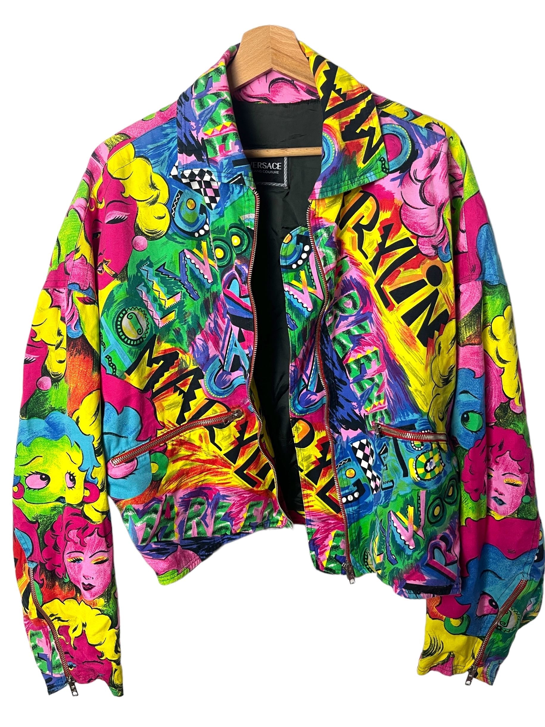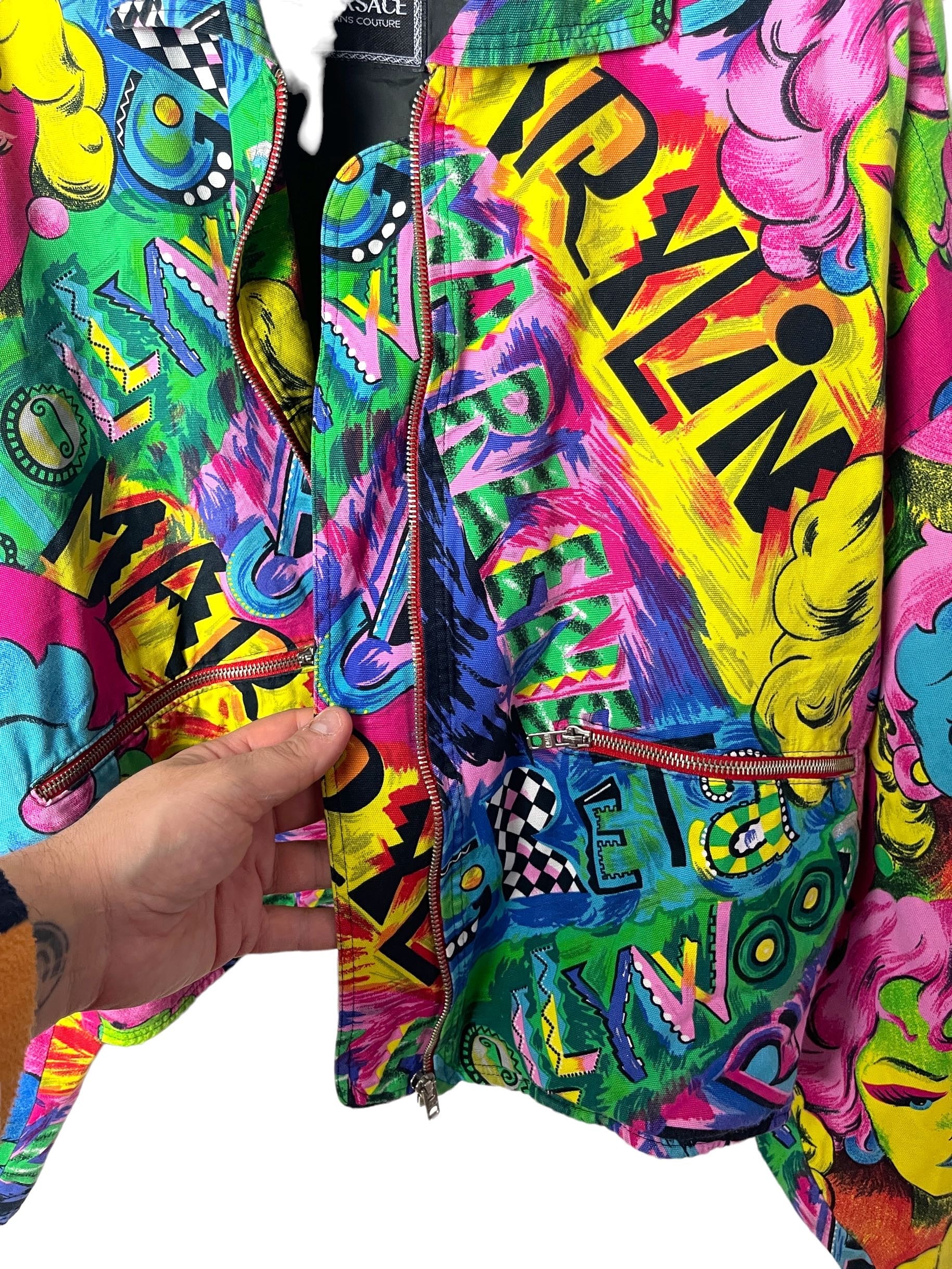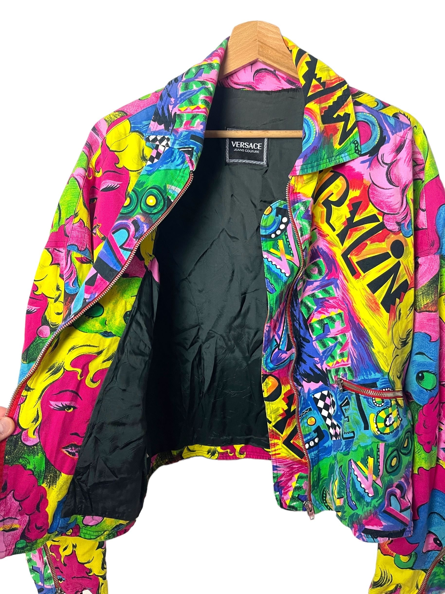 Gianni Versace linea jeans couture, giacca con stampa pop art Betty boop e Marylin Monroe.