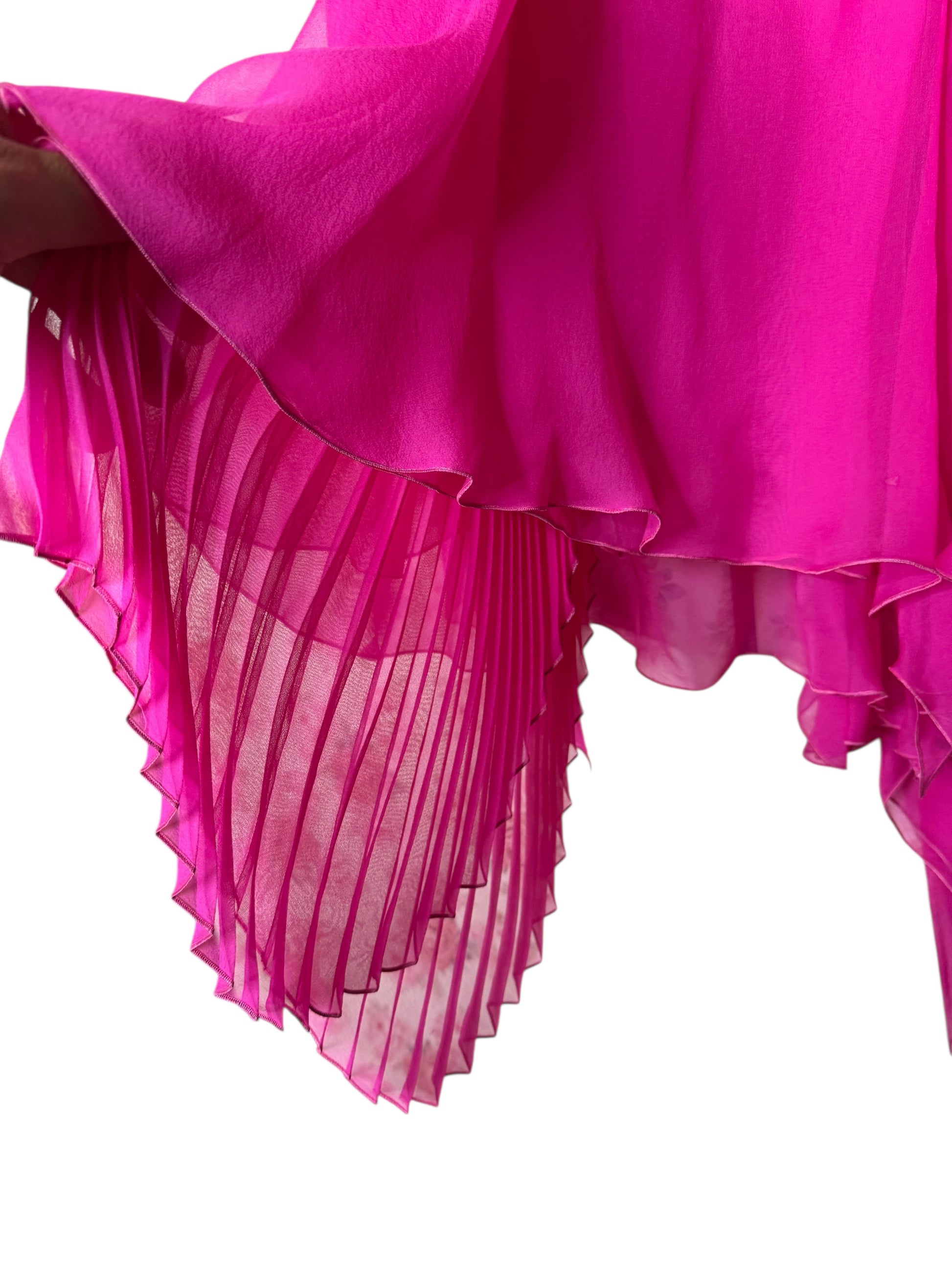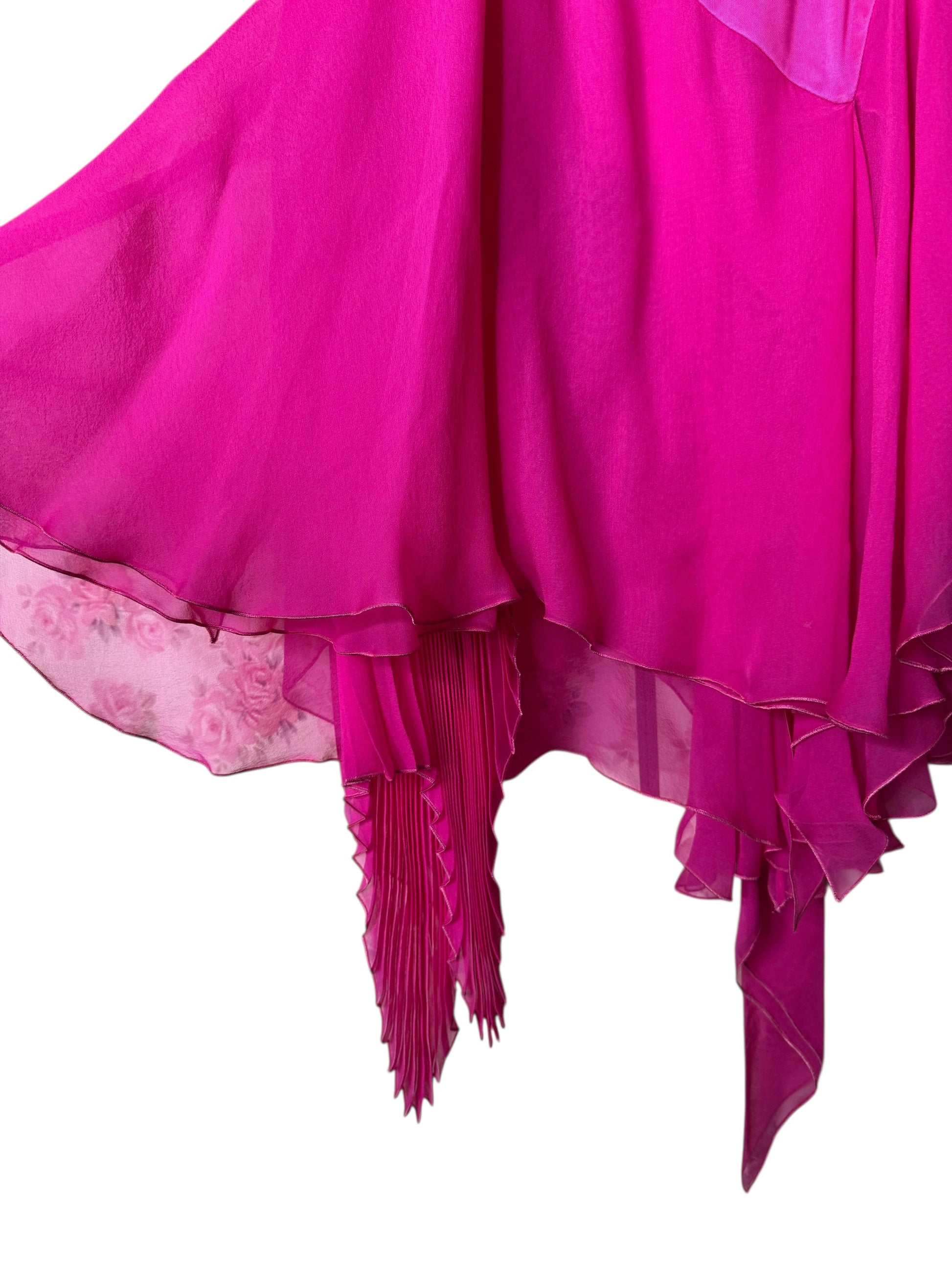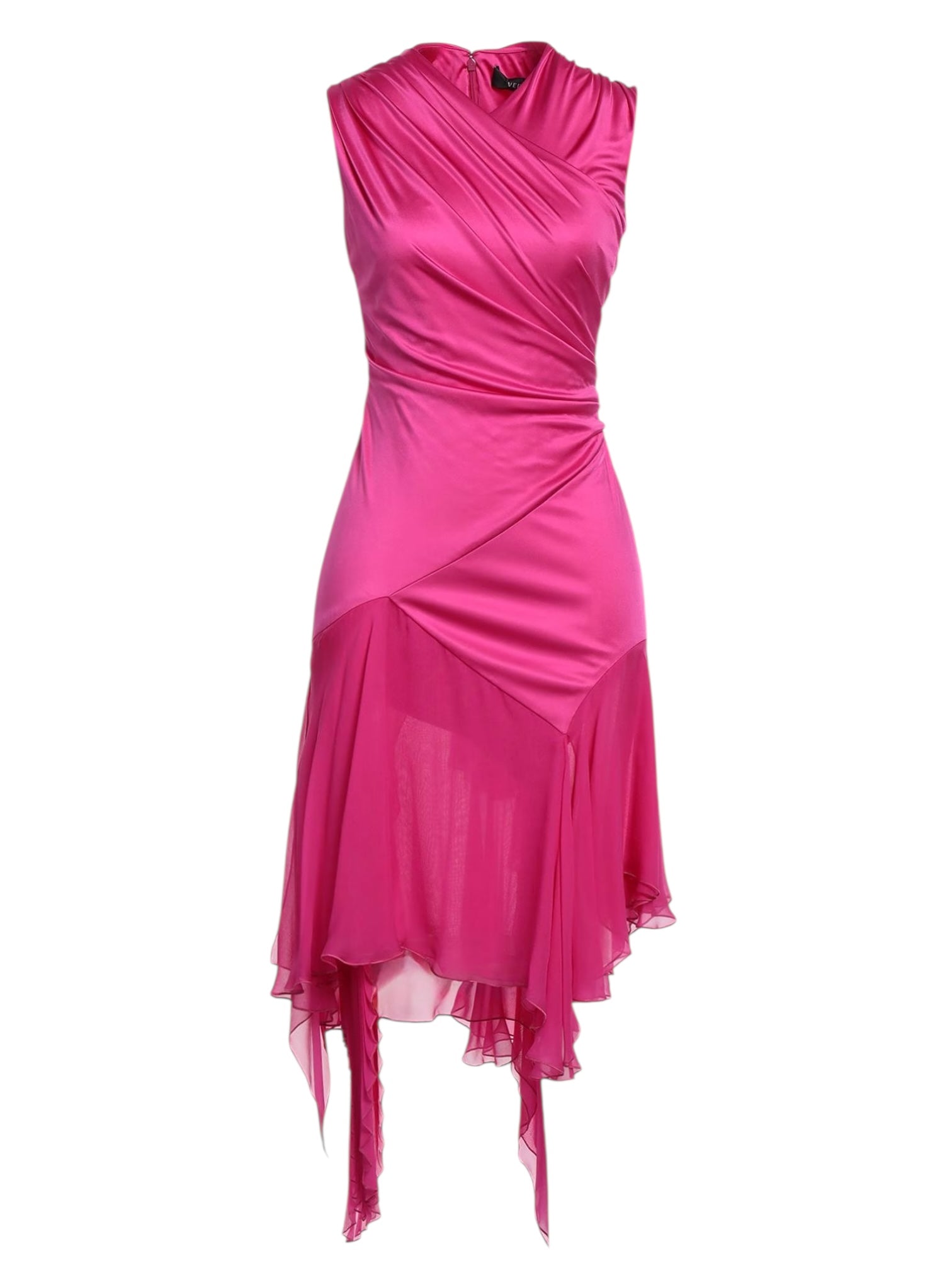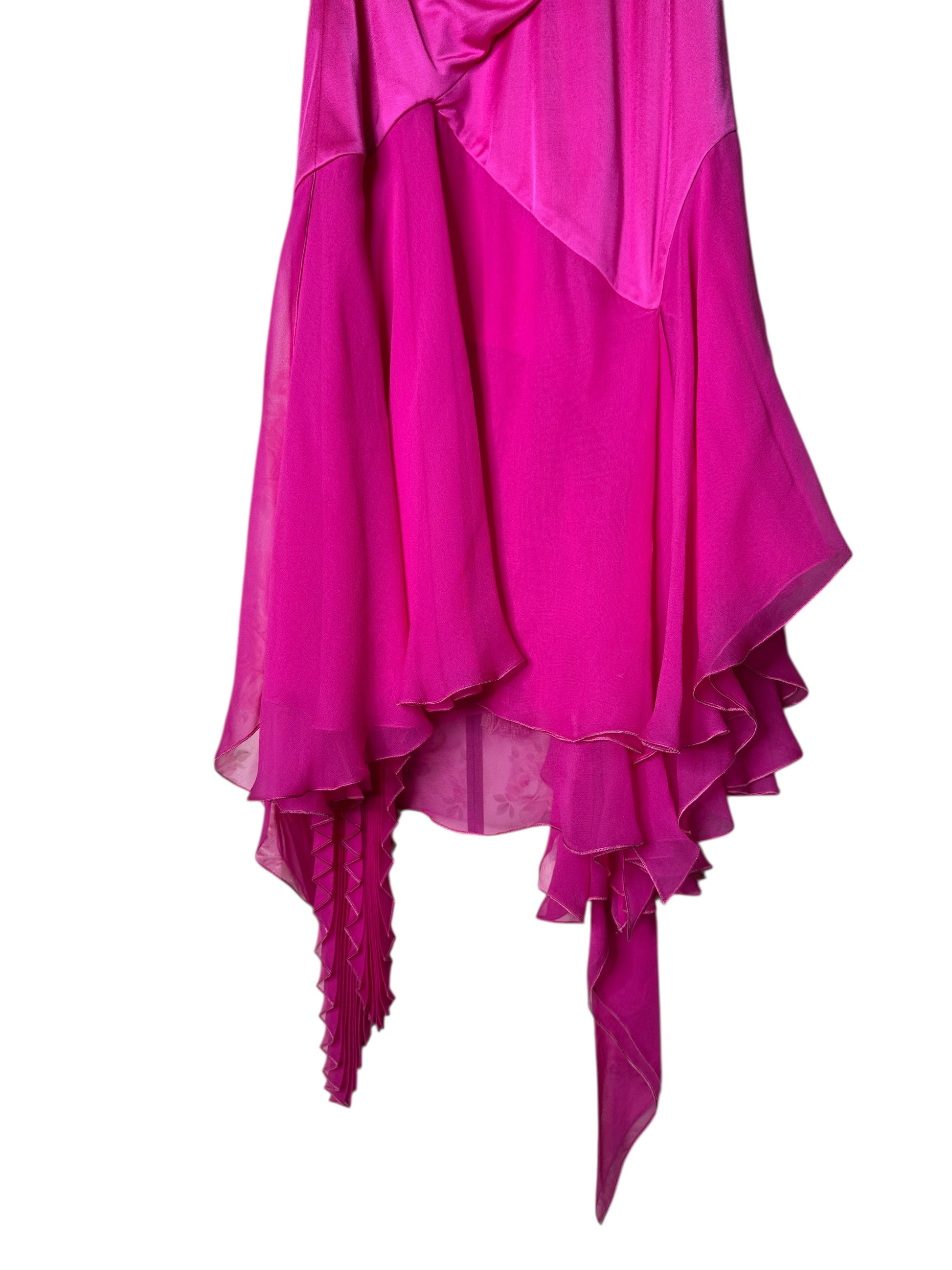 Vestito Versace cocktail in seta fucsia con drappeggi e orlo asimmetrico - taglia 36