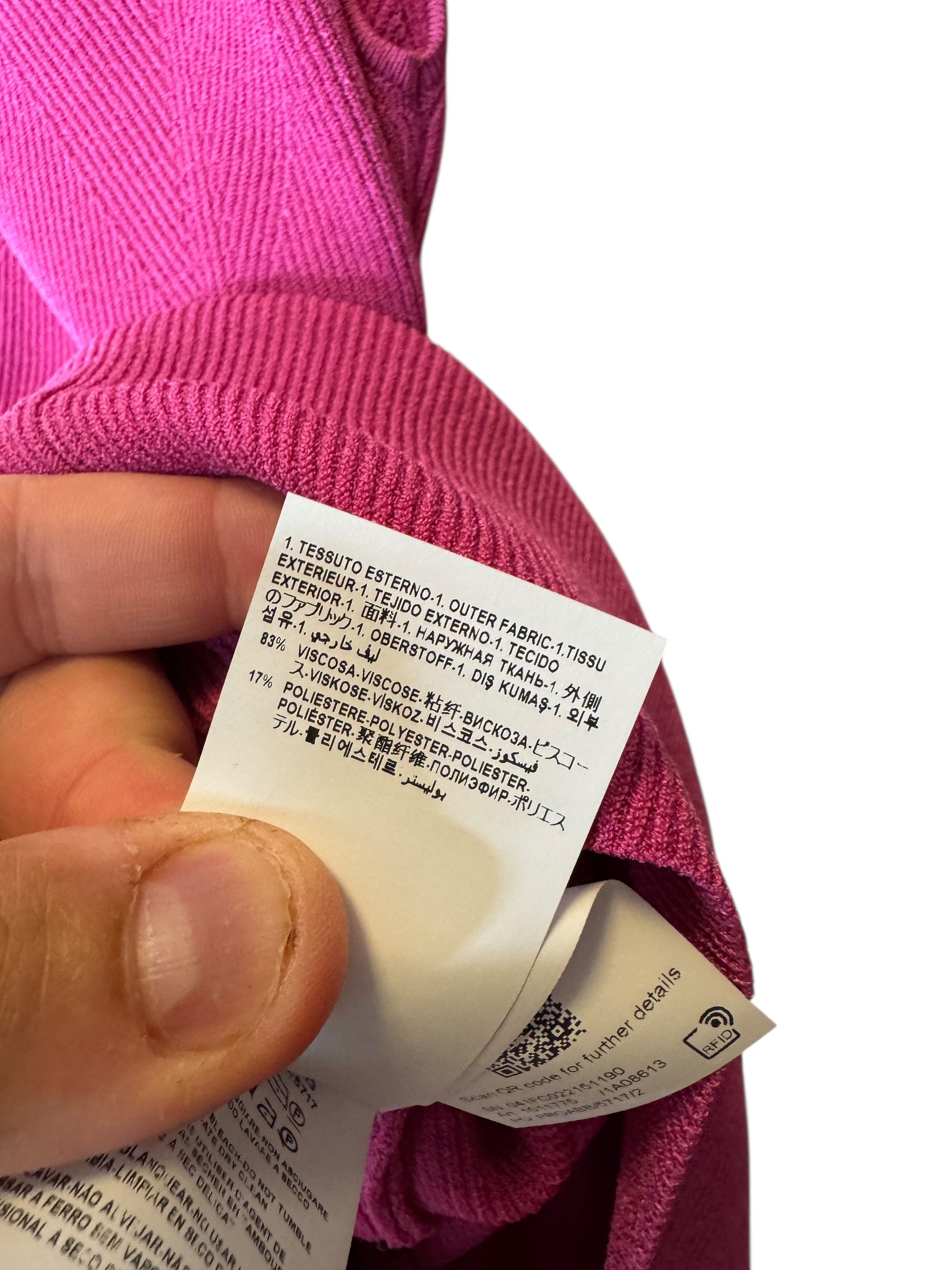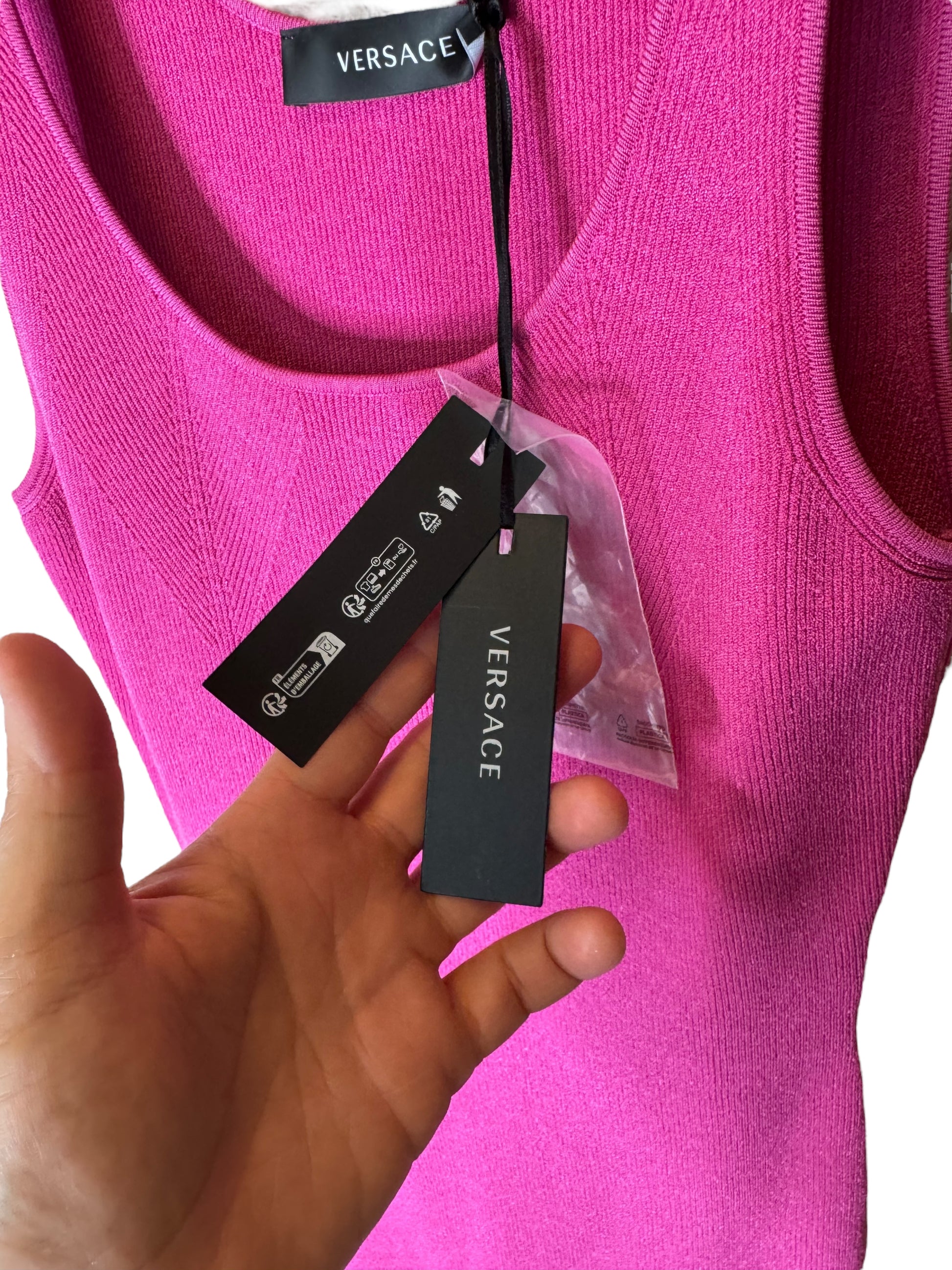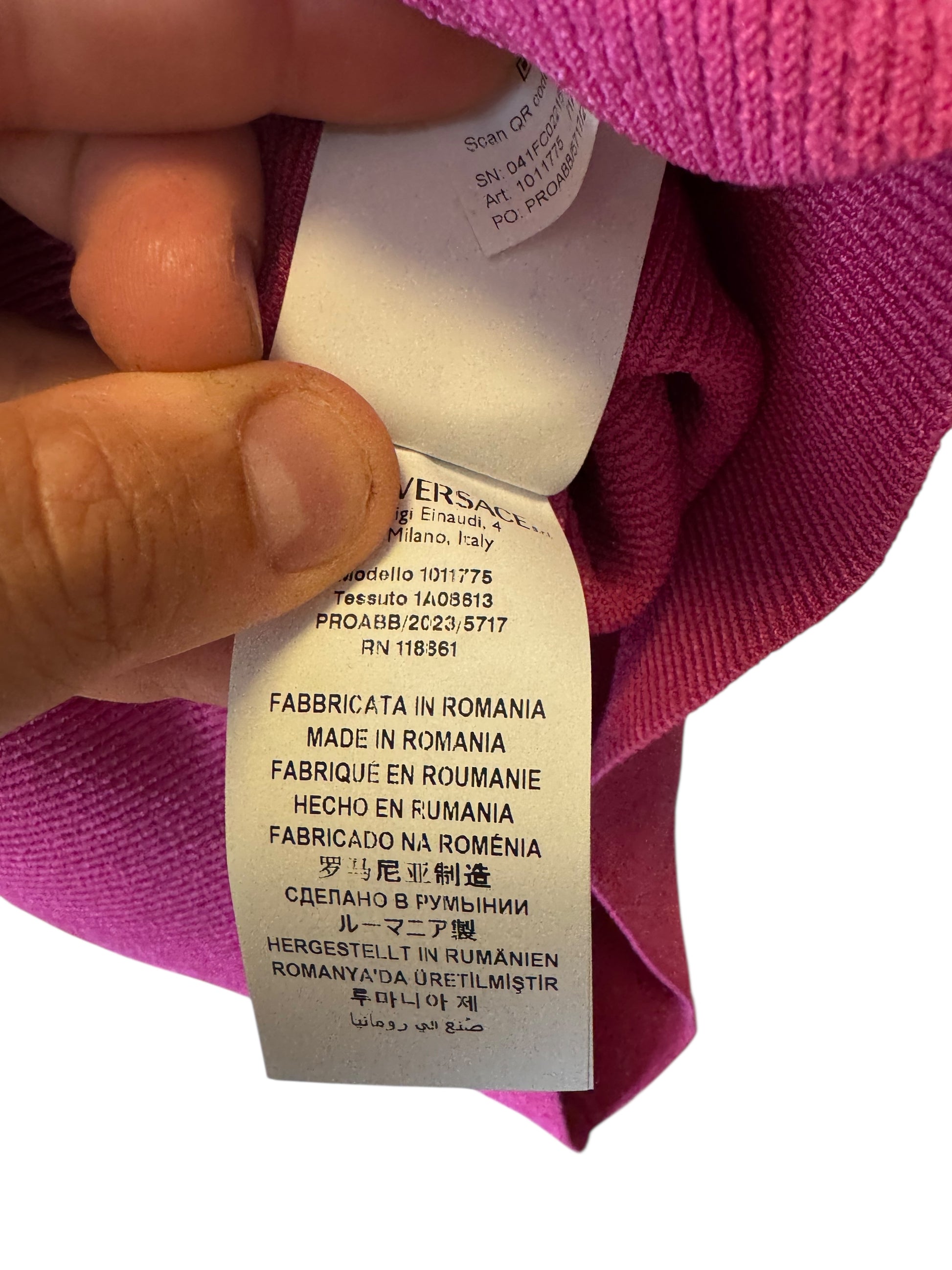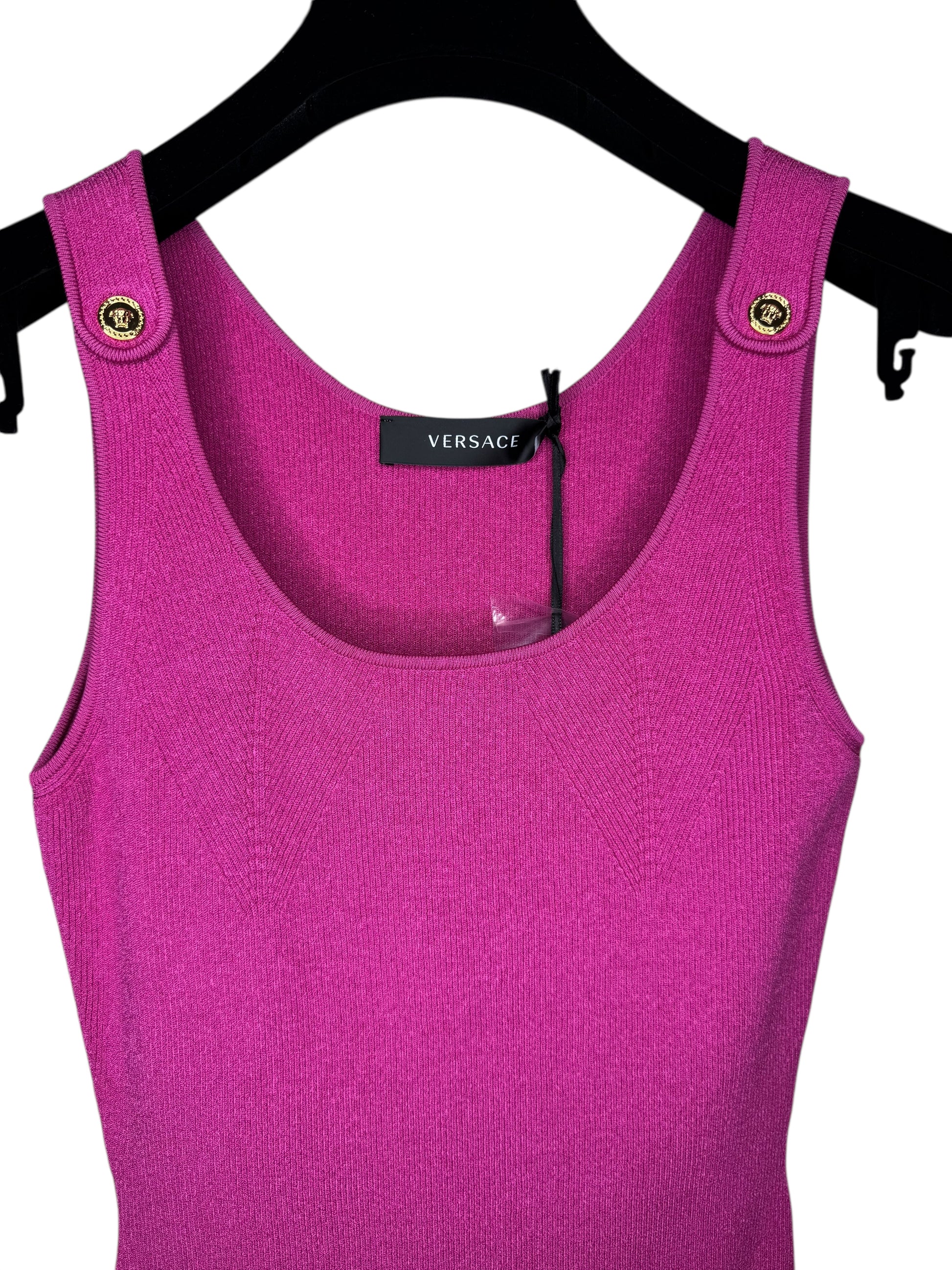 Vestito Versace fucsia in maglia stretch con bottoni Medusa dorati – Taglia IT 38
