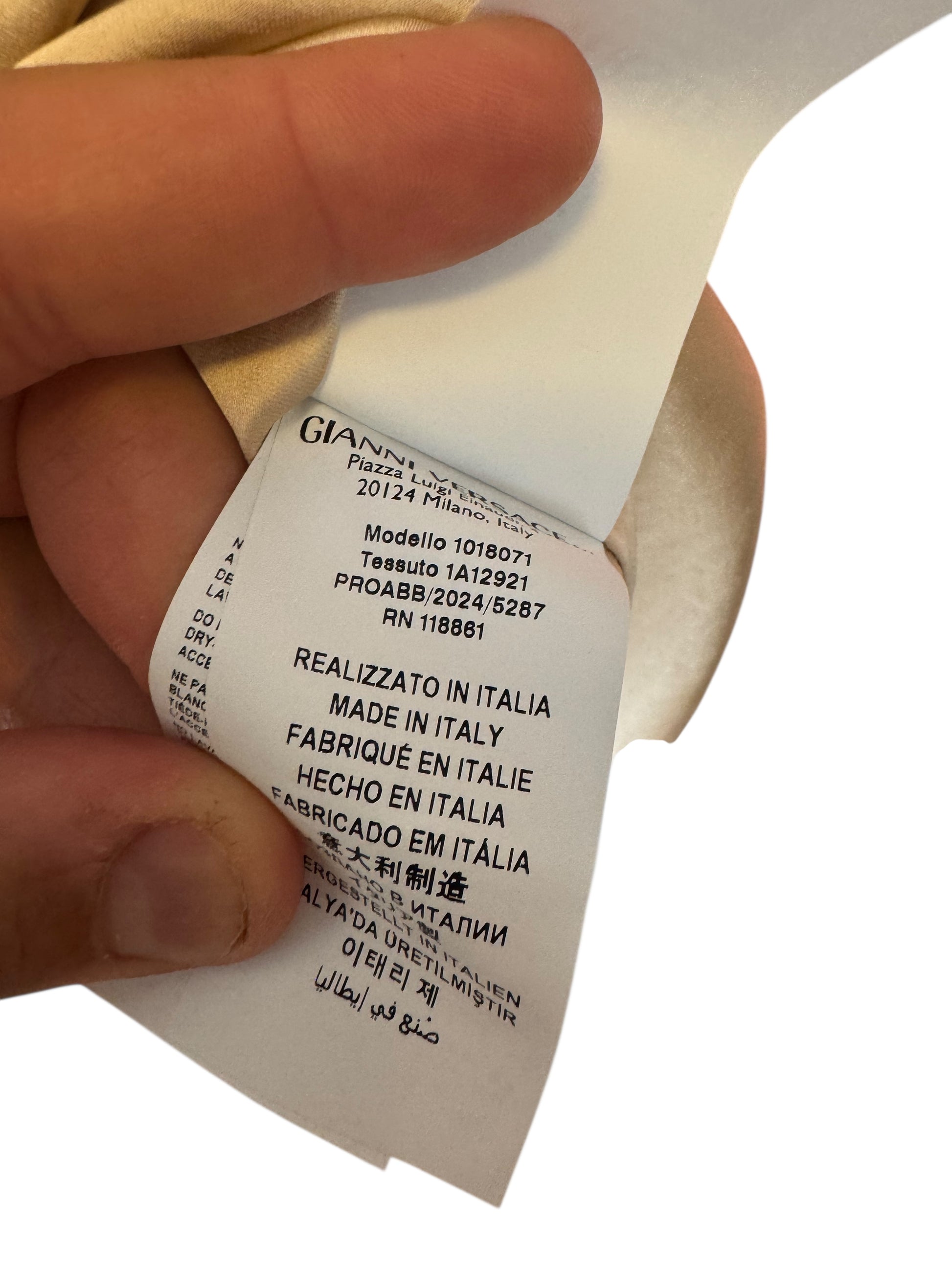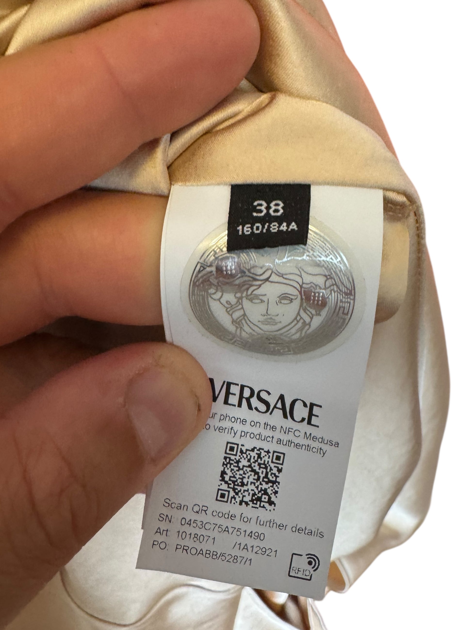 Abito originale Versace in raso lucido color champagne, con linea dritta e lunghezza al ginocchio. Lo scollo drappeggiato frontale è impreziosito da una cascata di paillettes metalliche e da spalline gioiello con bottoni Medusa, simbolo distintivo della maison. Il retro presenta un elegante scollo morbido. Capo interamente foderato, realizzato in Italia, completo di etichette originali e dotato di tecnologia NFC/QR per la verifica dell’autenticità.