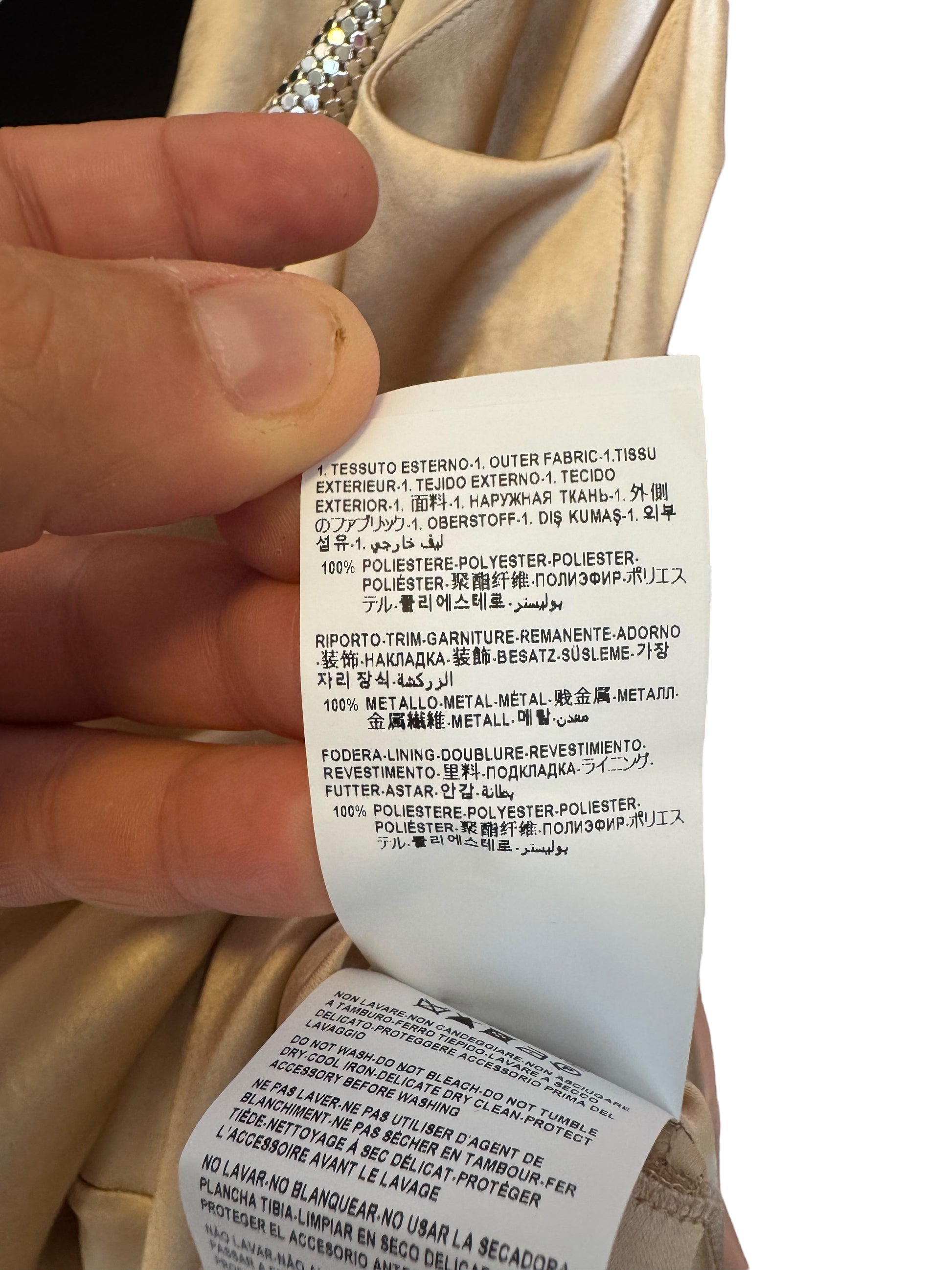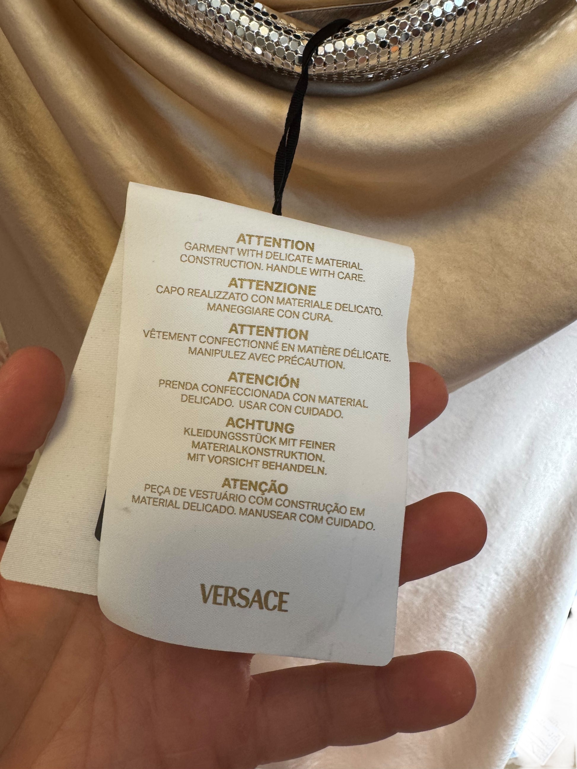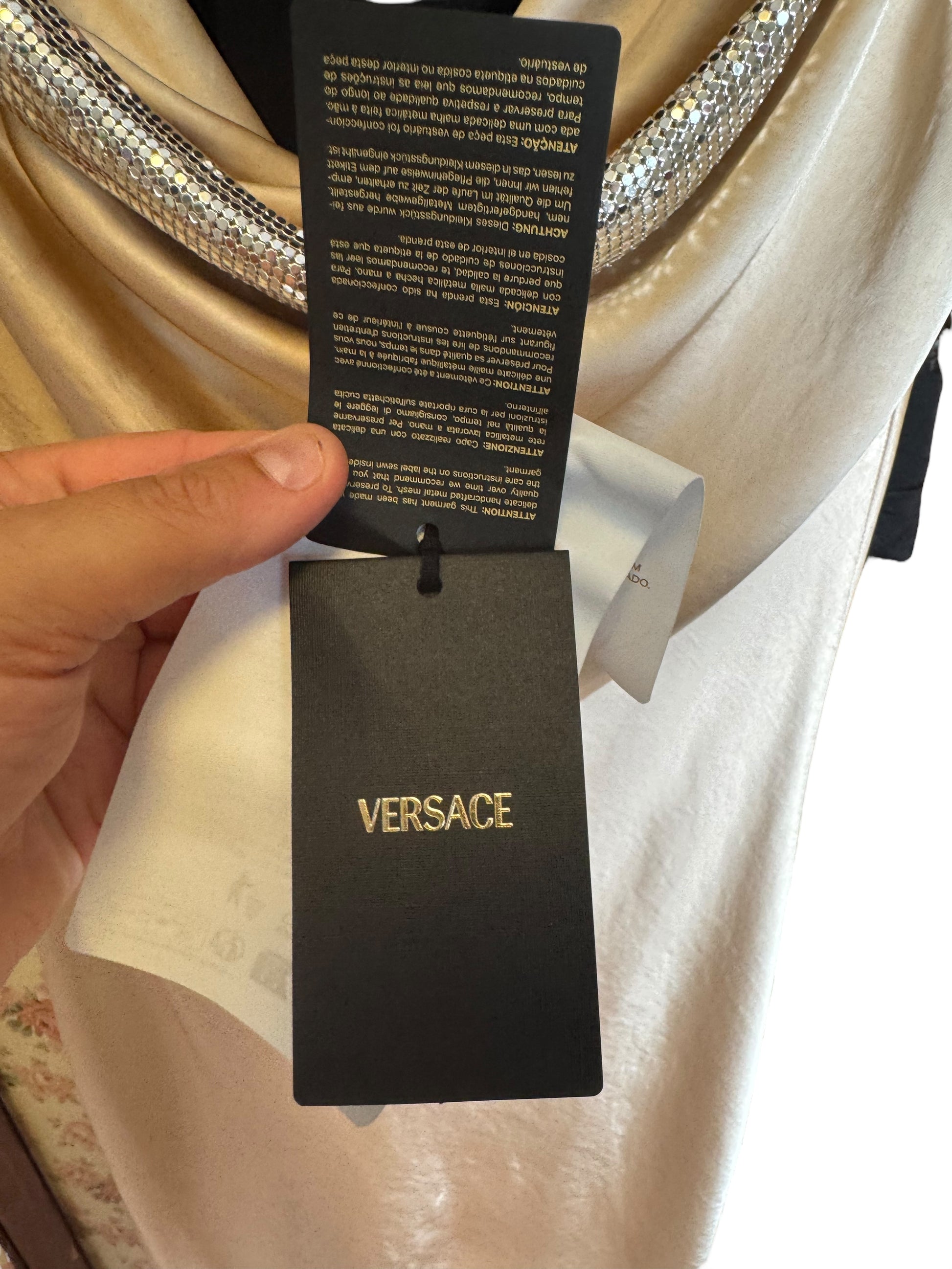 Vestito Versace in raso champagne con scollo drappeggiato e dettagli metallici