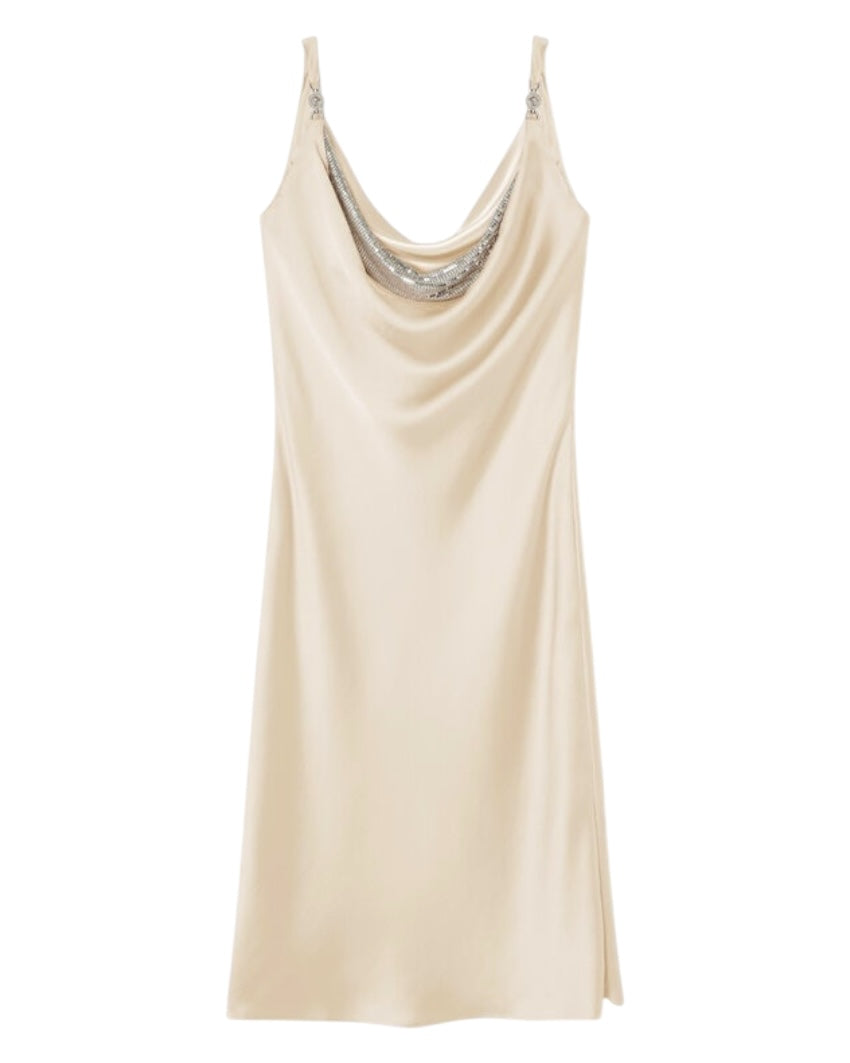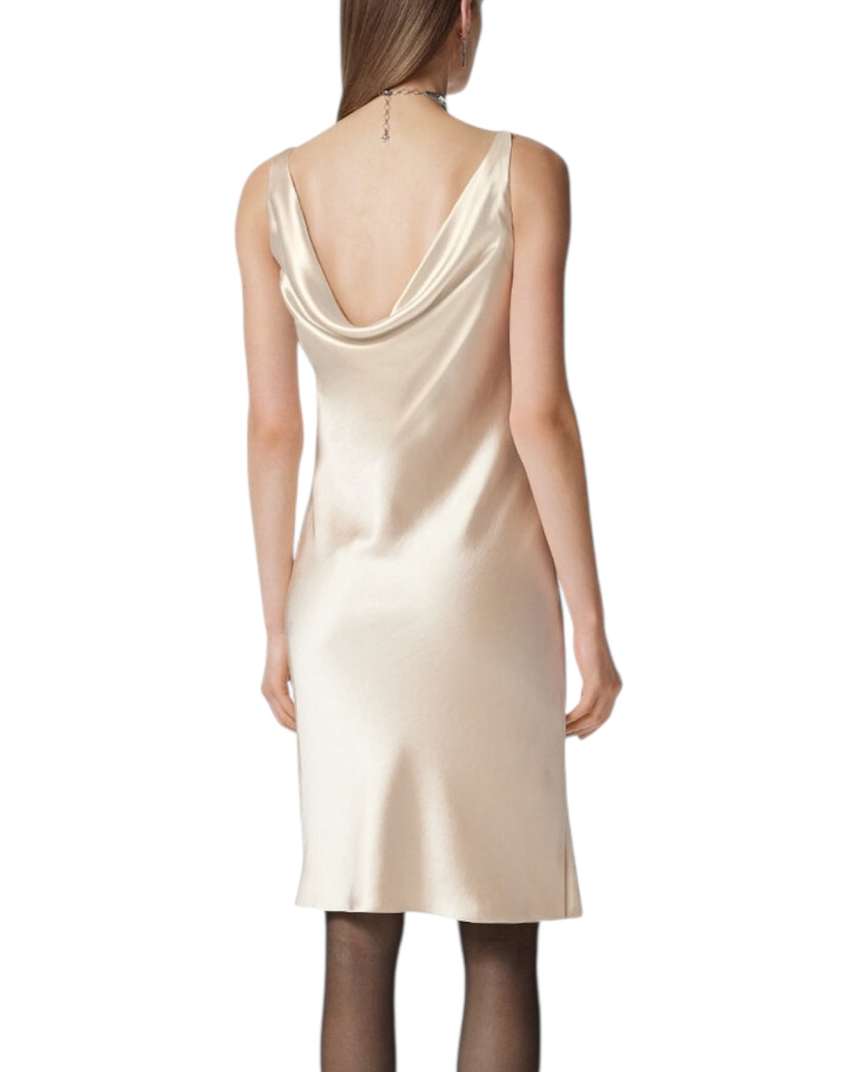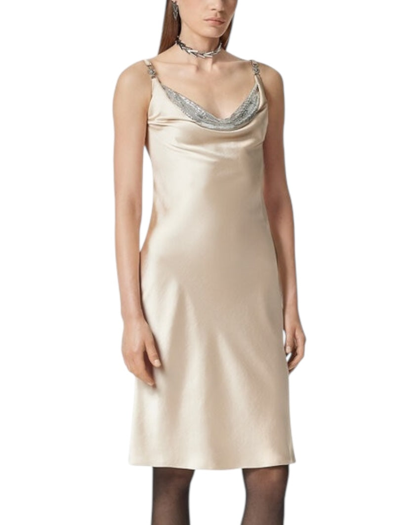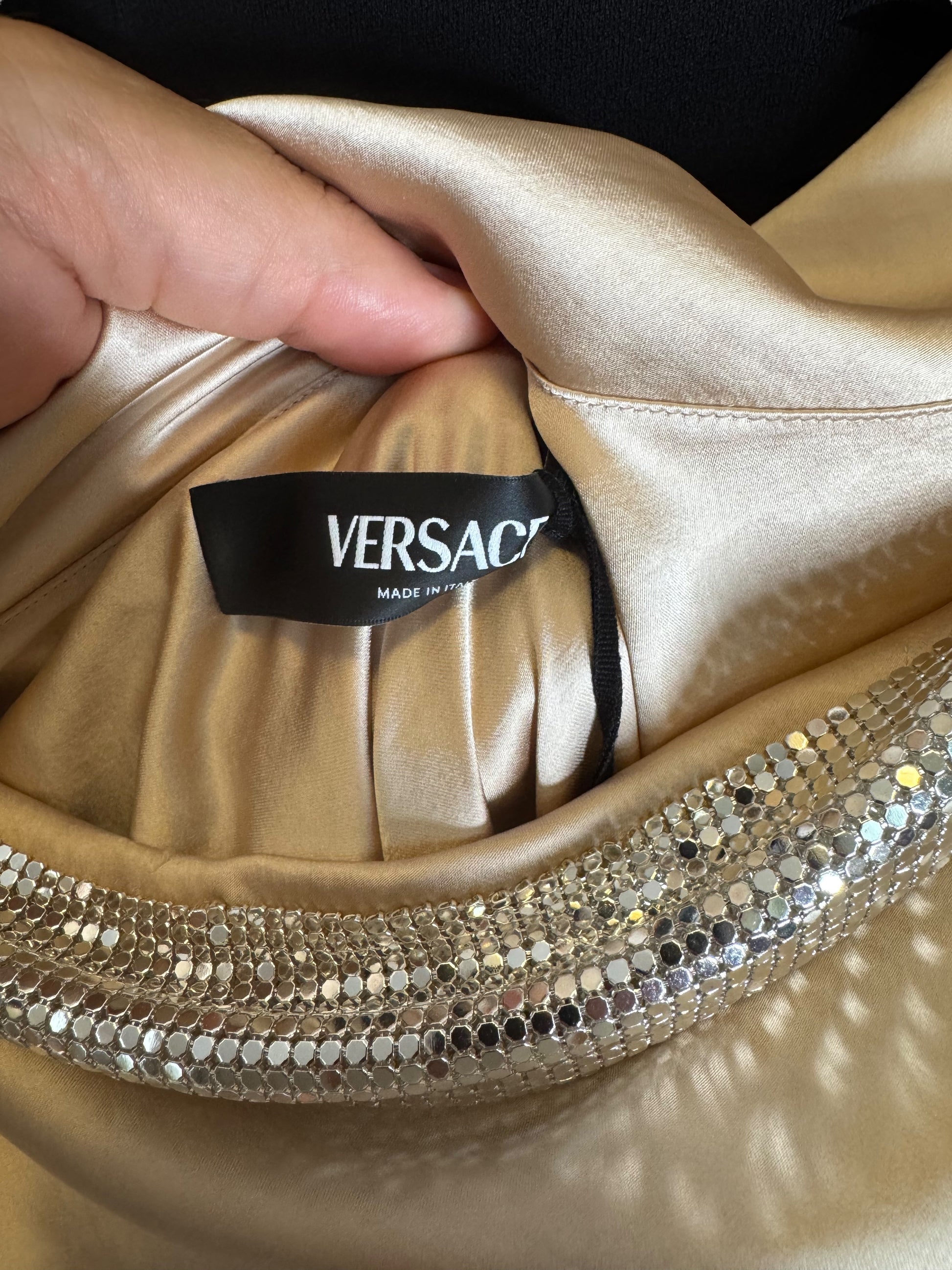 Vestito Versace in raso champagne con scollo drappeggiato e dettagli metallici