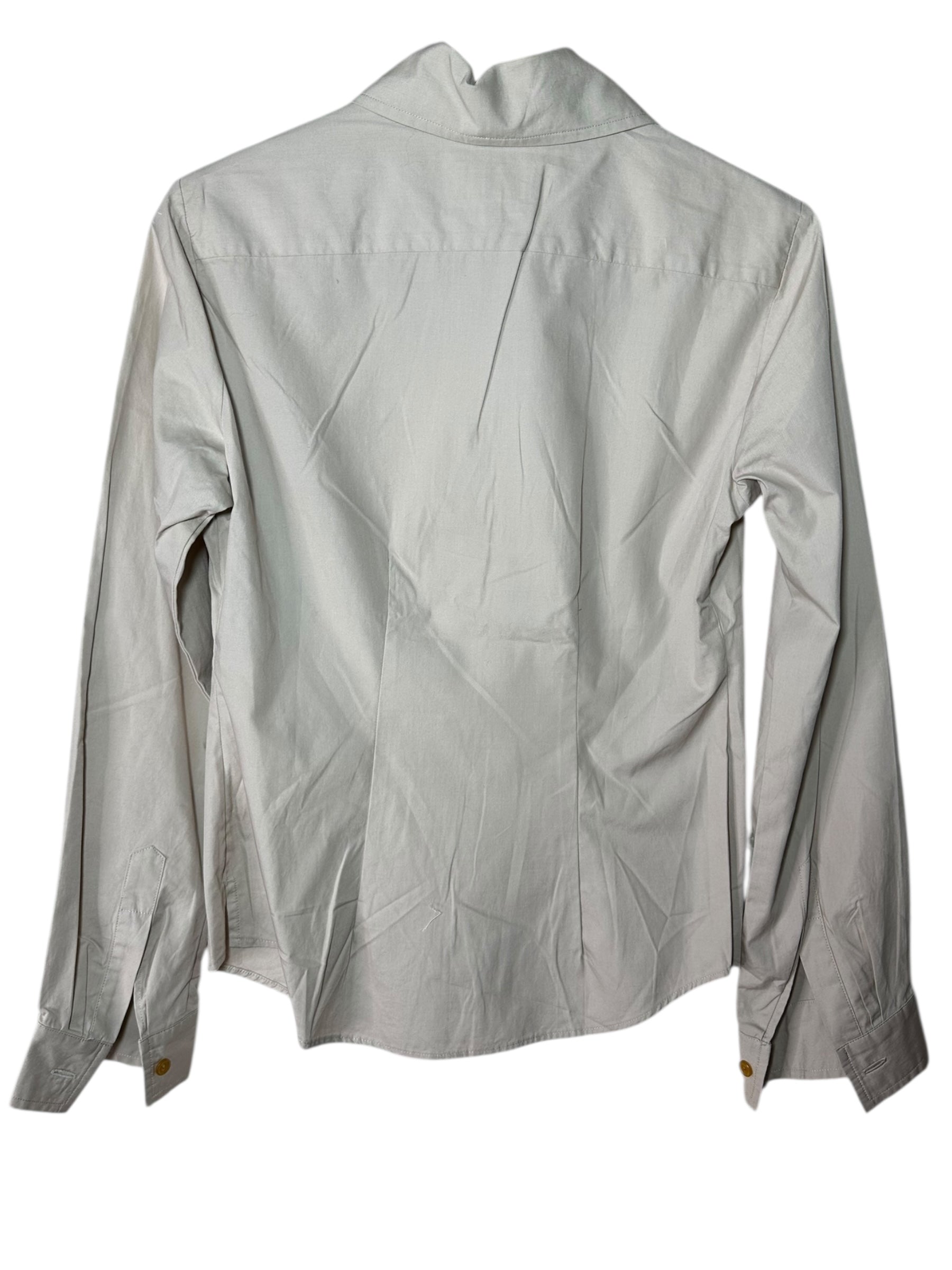 Camicia dal design essenziale ma sofisticato firmata Vivienne Westwood Red Label, realizzata in Italia in 100% cotone. Il modello presenta un colletto destrutturato con taglio asimmetrico, abbottonatura frontale con bottoni color ambra e iconico logo Orb ricamato sul fondo, lato sinistro. Le linee pulite e leggermente sagomate valorizzano la figura senza costringerla, rendendo il capo adatto sia a look formali che più creativi.