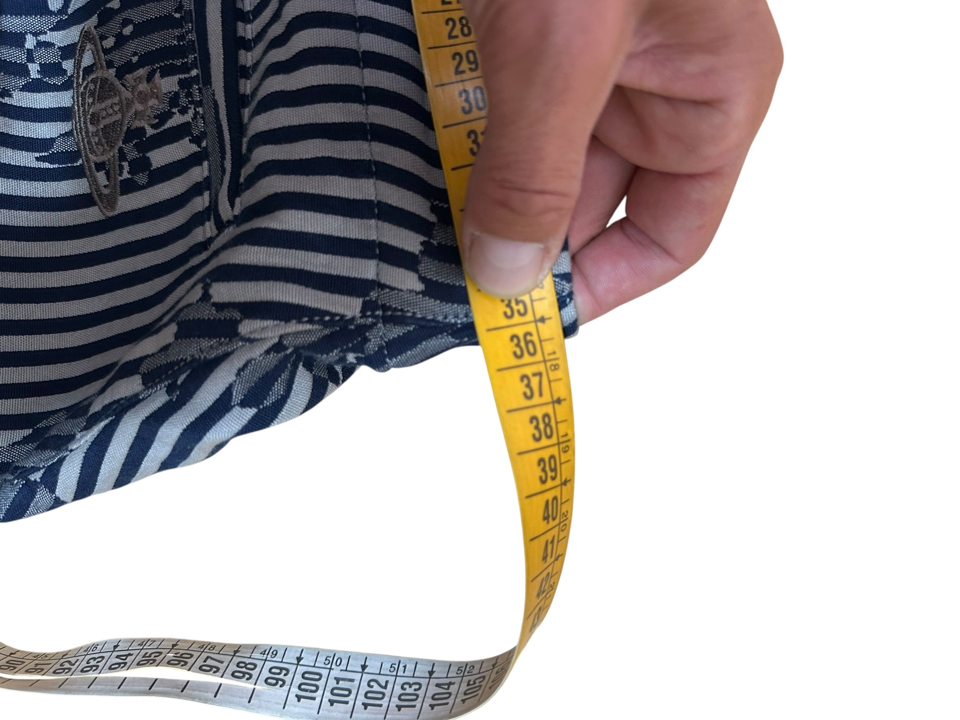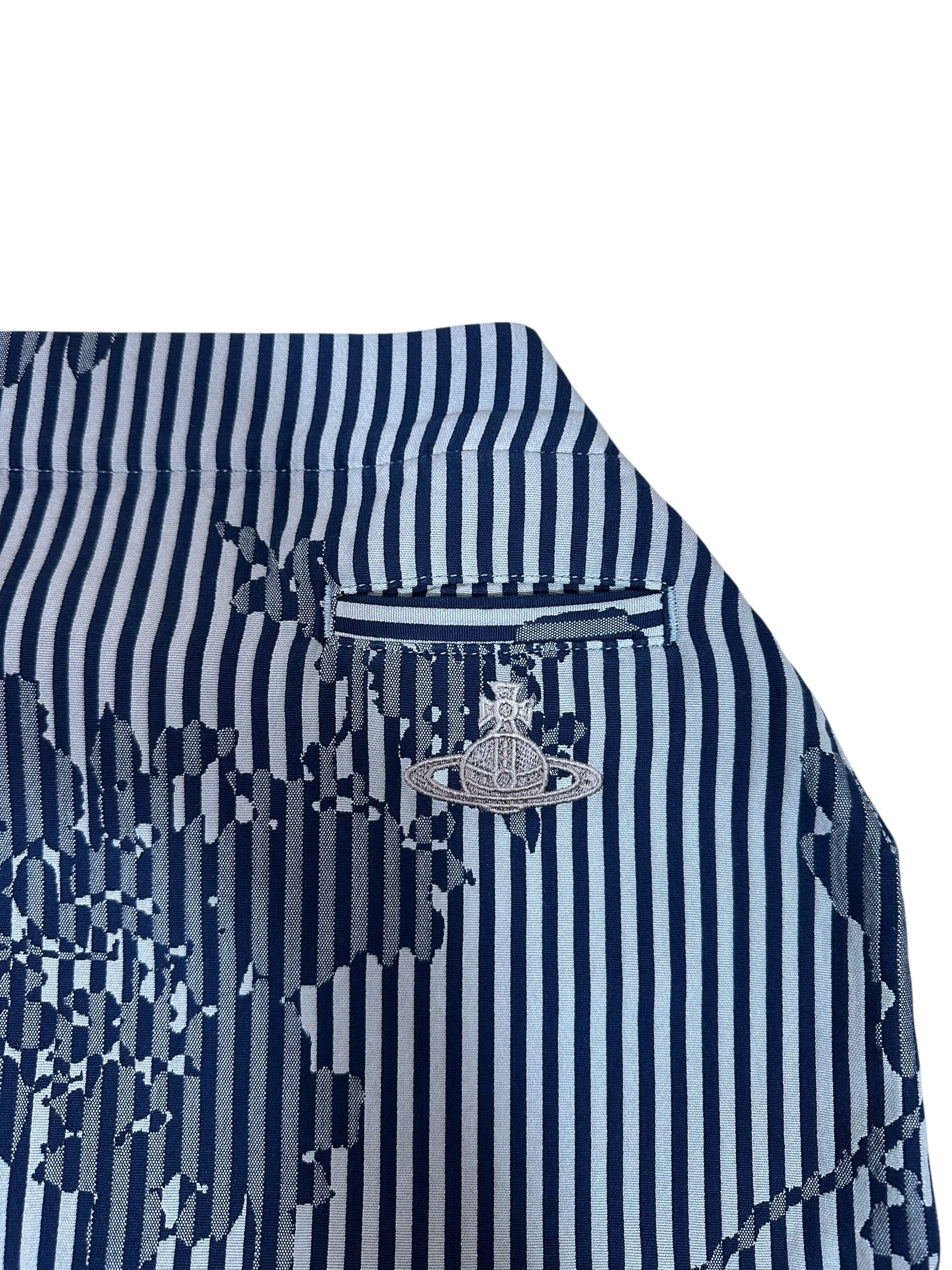 Dettaglio distintivo è il logo Orb ricamato in filo metallico sulla parte frontale destra, sopra un taschino a filetto decorativo. Sul retro è presente una zip a vista con cursore personalizzato Vivienne Westwood, che conferma l’autenticità del capo. Il tessuto è corposo ma confortevole, adatto per la mezza stagione e per l’estate.
