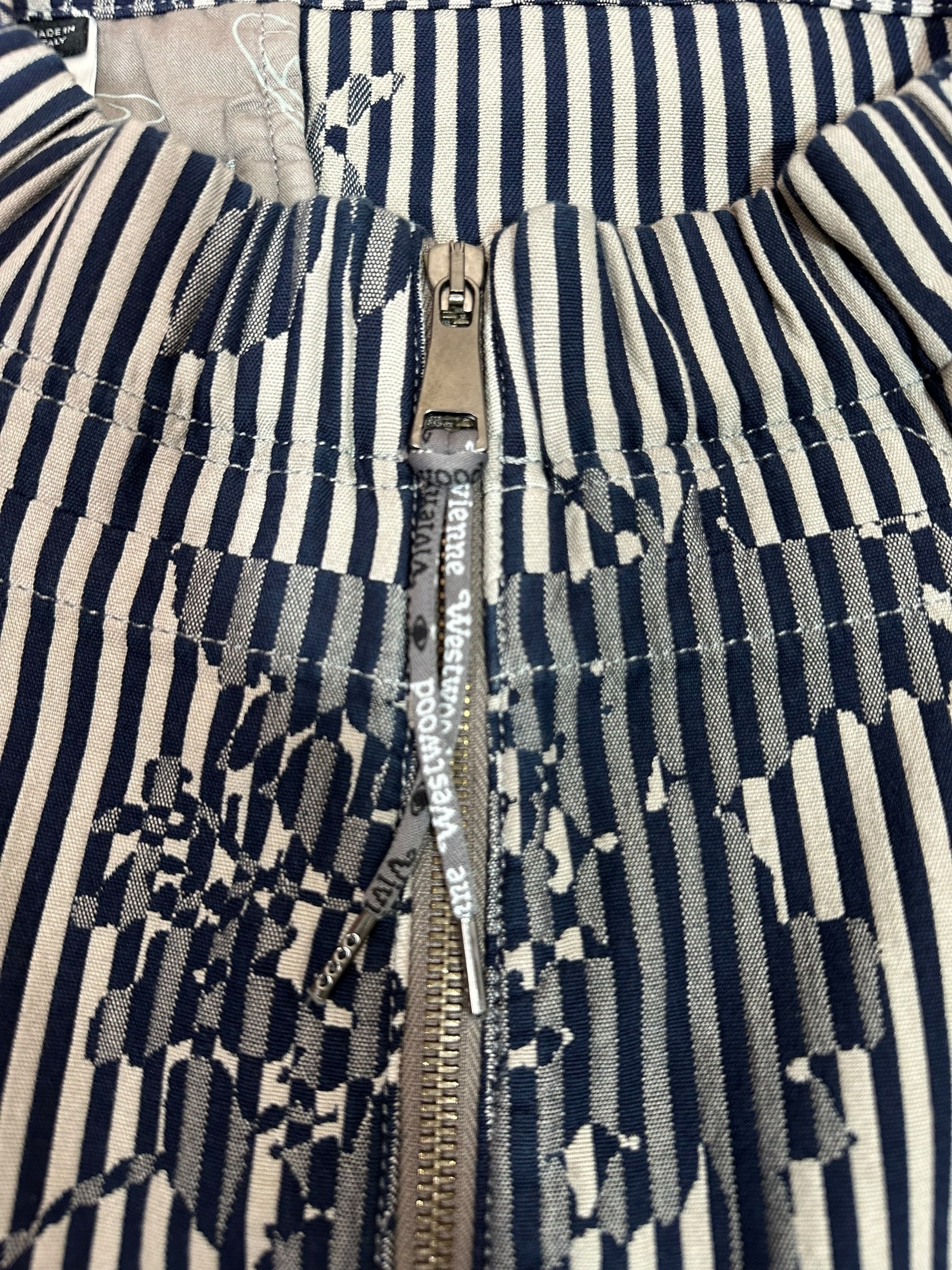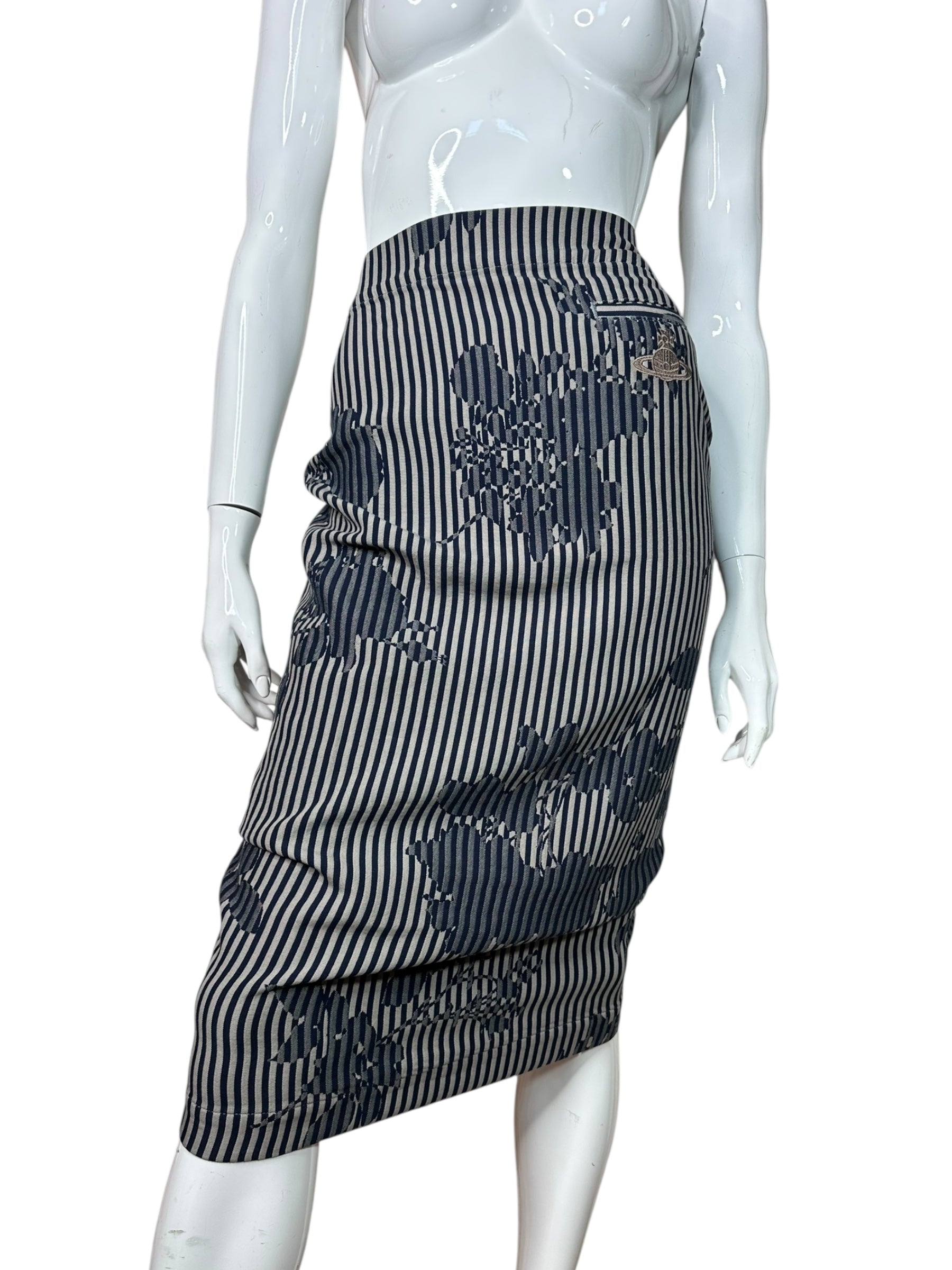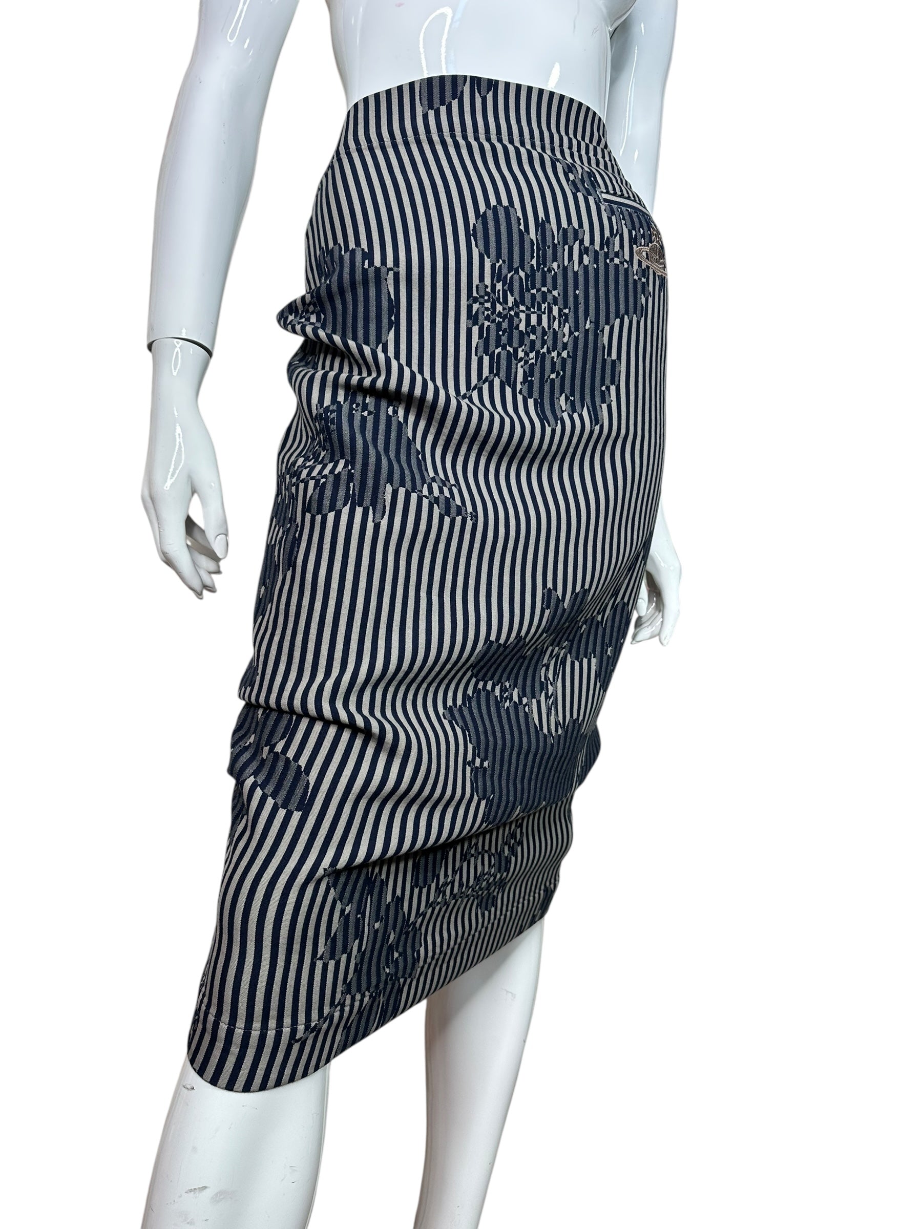 Raffinata gonna longuette firmata Vivienne Westwood, realizzata in Italia in 100% cotone. Caratterizzata da una linea aderente e strutturata, presenta una sofisticata fantasia a righe verticali blu e avorio con motivi floreali tono su tono effetto jacquard. Il taglio avvolgente e la particolare costruzione con cuciture sagomate valorizzano la silhouette, conferendo alla gonna un’estetica iconica e riconoscibile.