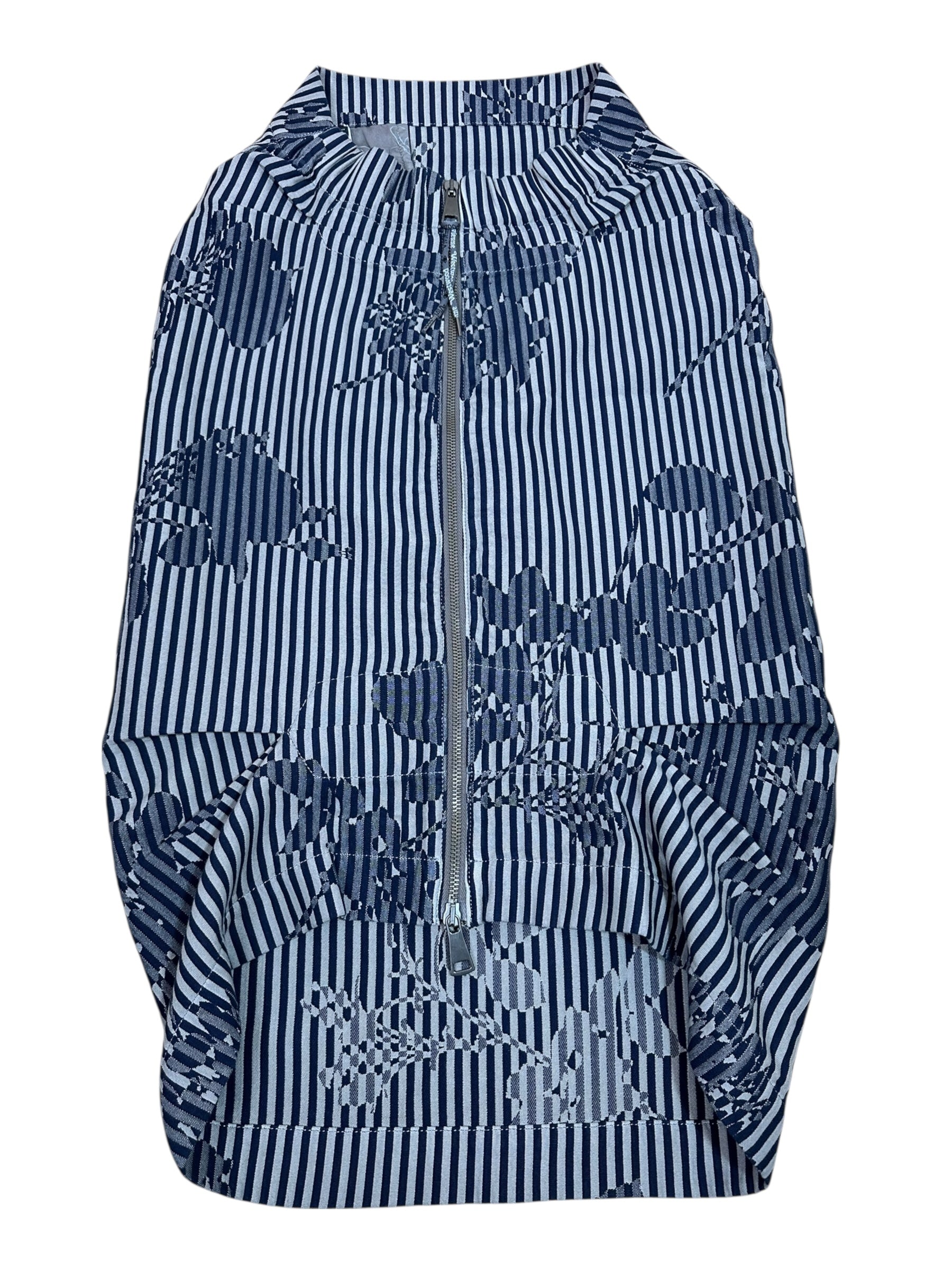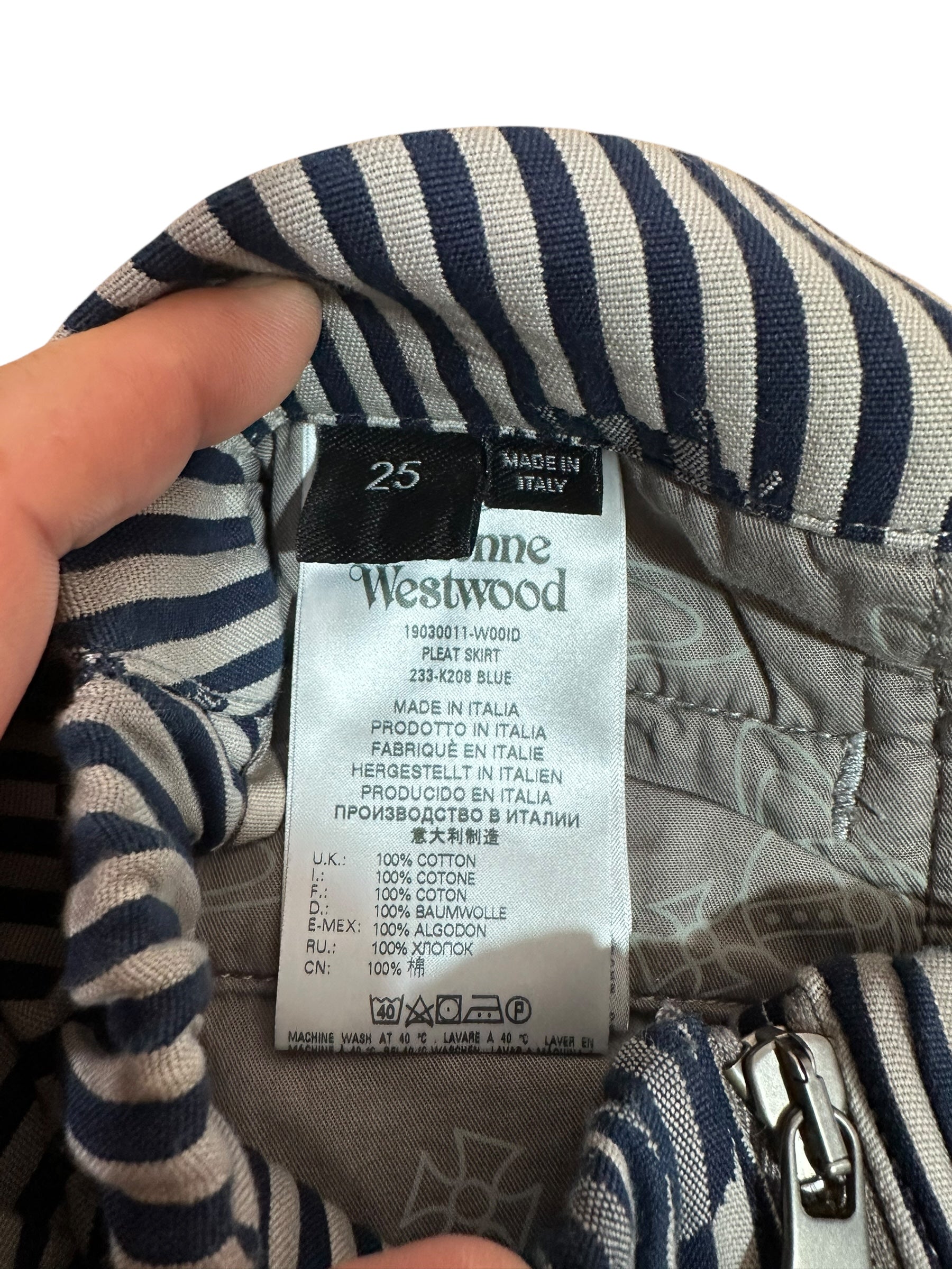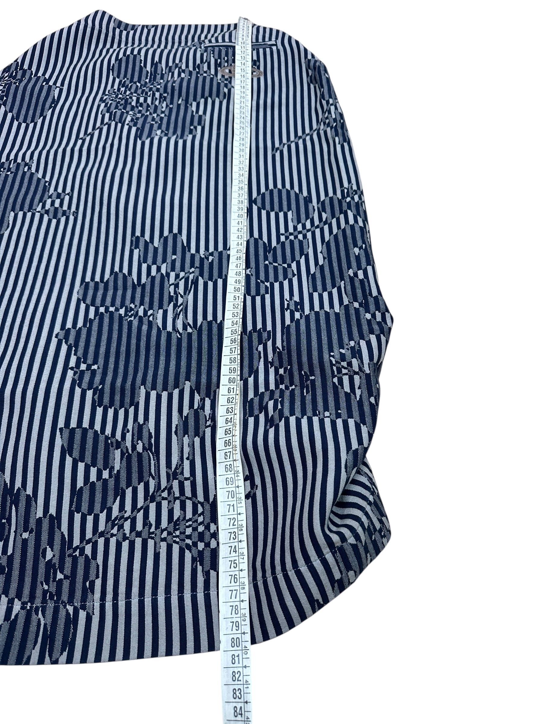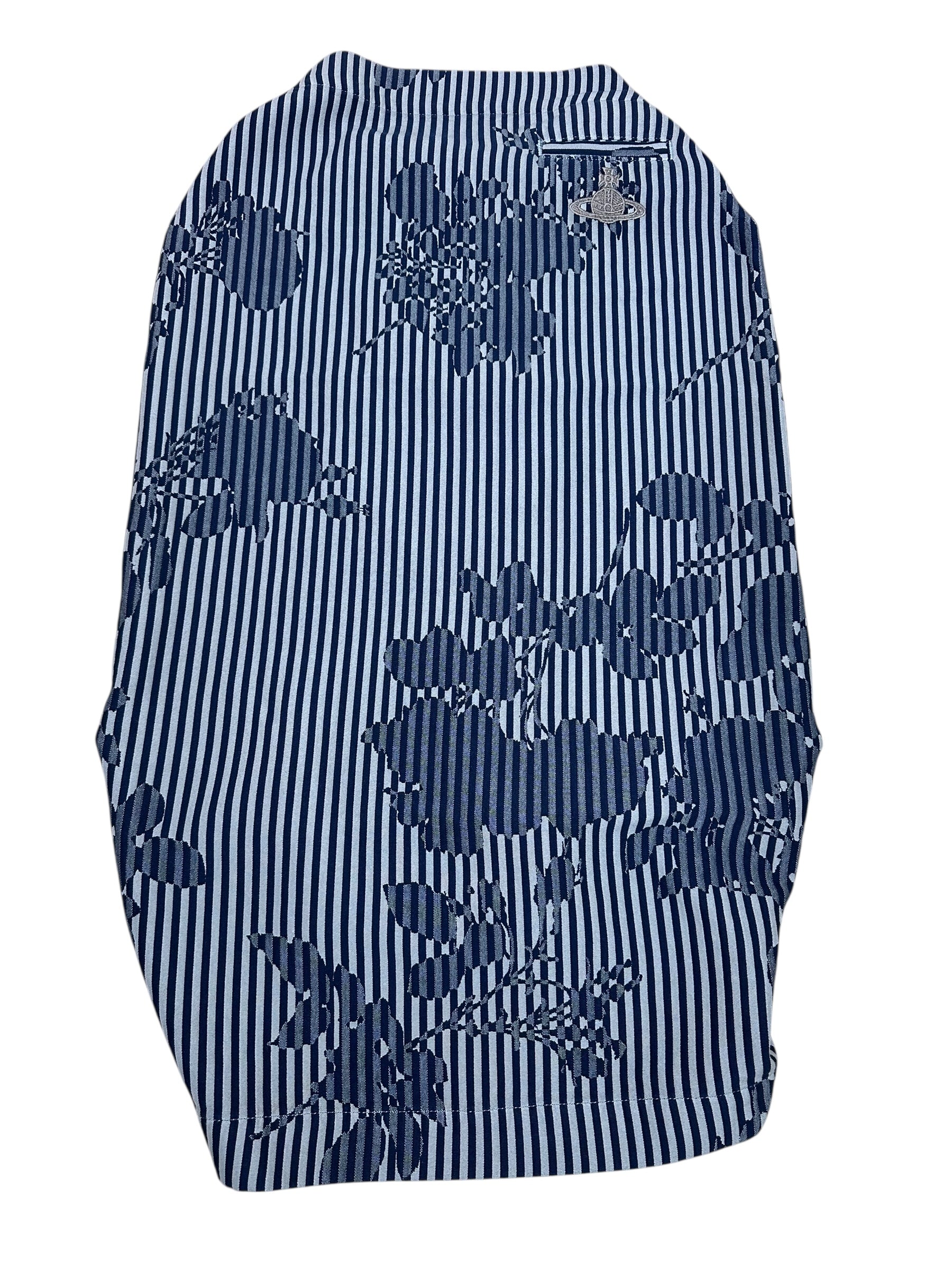 Raffinata gonna longuette firmata Vivienne Westwood, realizzata in Italia in 100% cotone. Caratterizzata da una linea aderente e strutturata, presenta una sofisticata fantasia a righe verticali blu e avorio con motivi floreali tono su tono effetto jacquard. Il taglio avvolgente e la particolare costruzione con cuciture sagomate valorizzano la silhouette, conferendo alla gonna un’estetica iconica e riconoscibile.