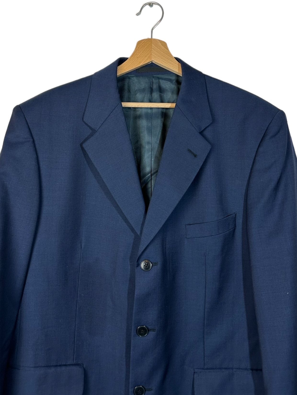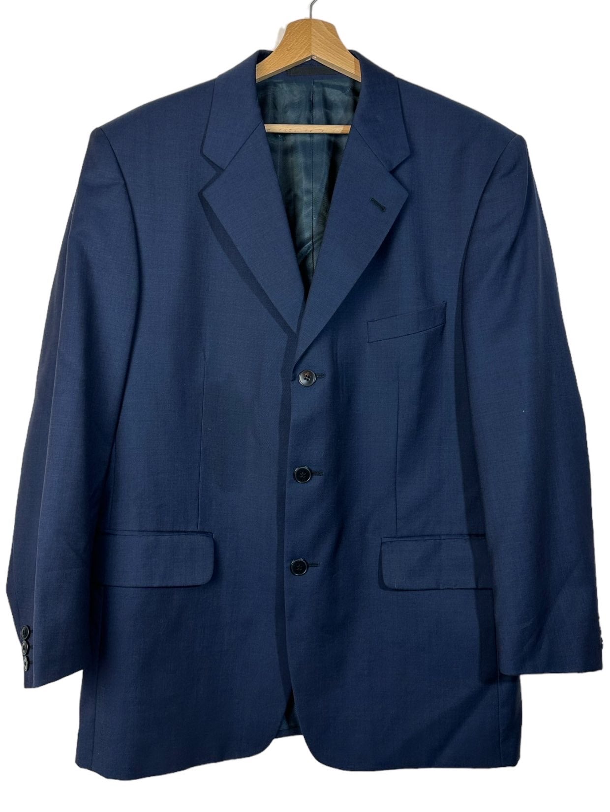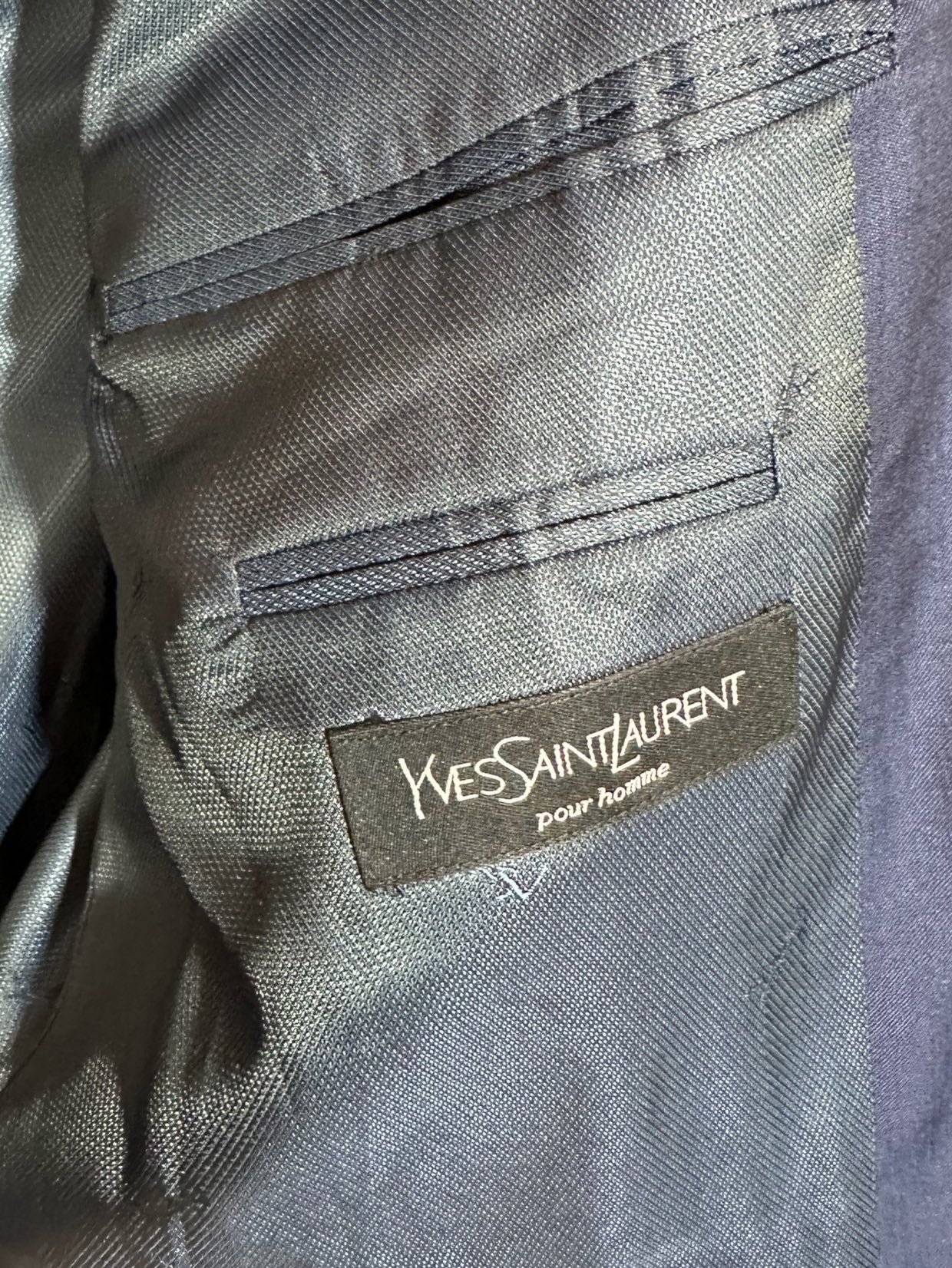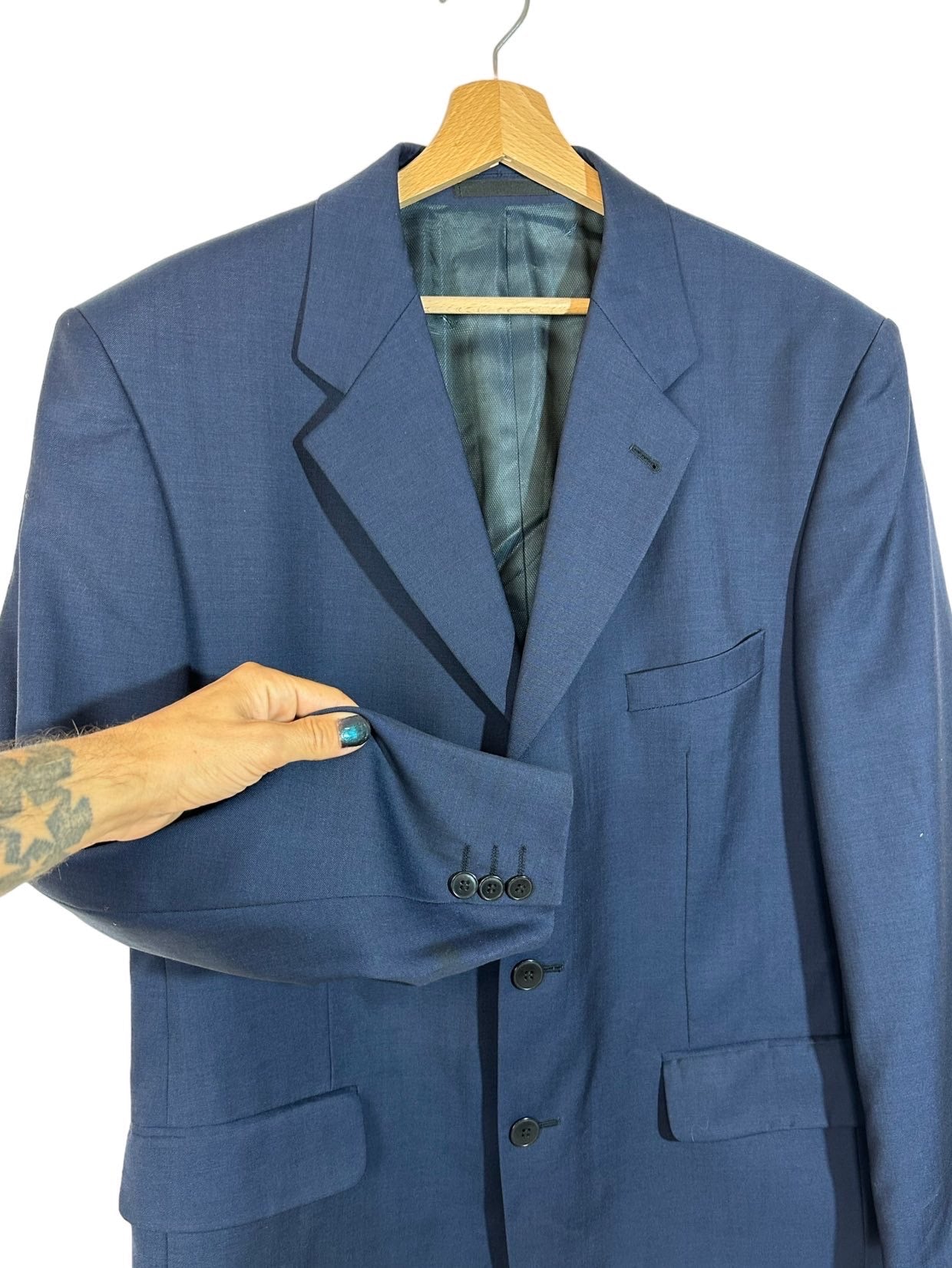 Yves Sai. Laurent blazer maschile vintage in lana e viscosa blu scuro a maniche lunghe con tasche laterali e fodera interna logata. Tg.52