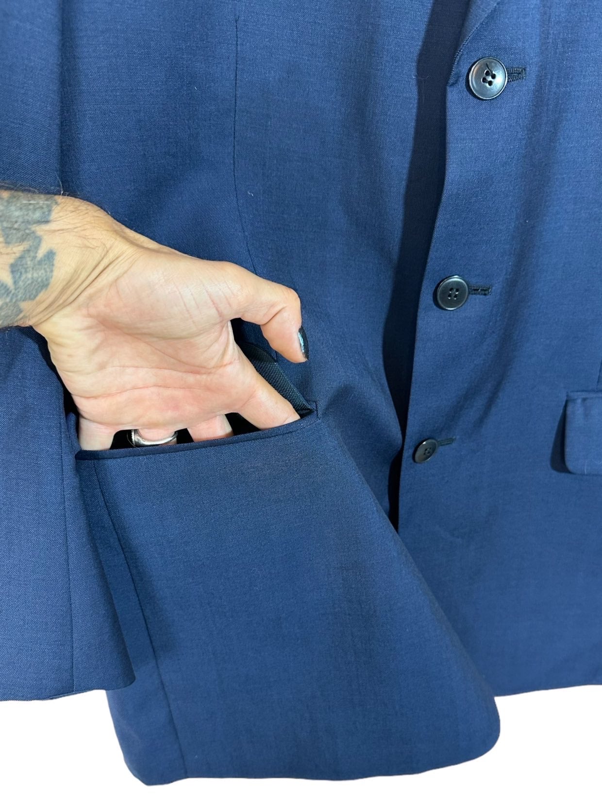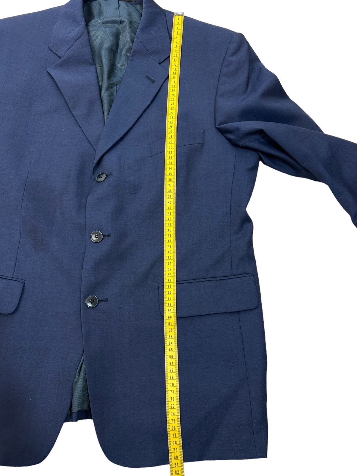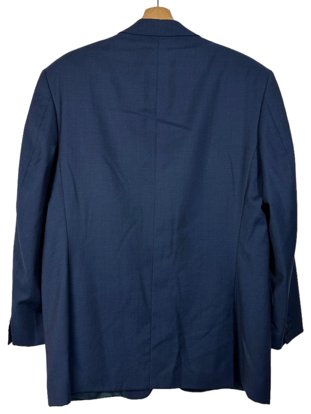 Yves Sai. Laurent blazer maschile vintage in lana e viscosa blu scuro a maniche lunghe con tasche laterali e fodera interna logata. Tg.52