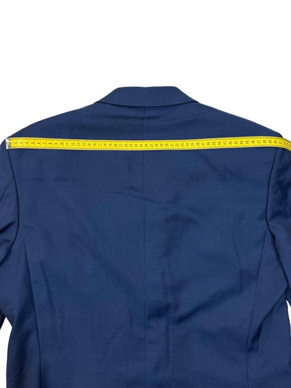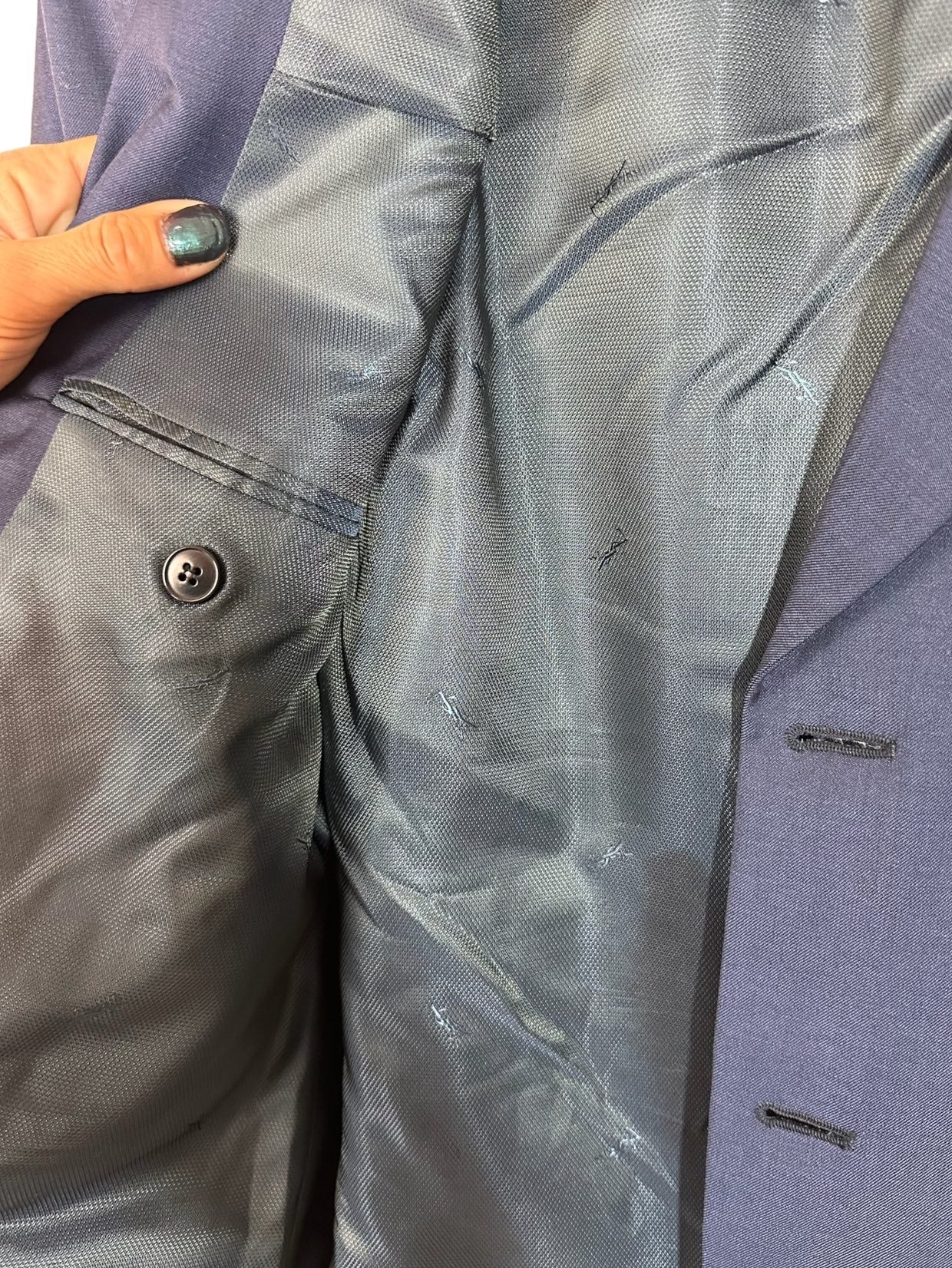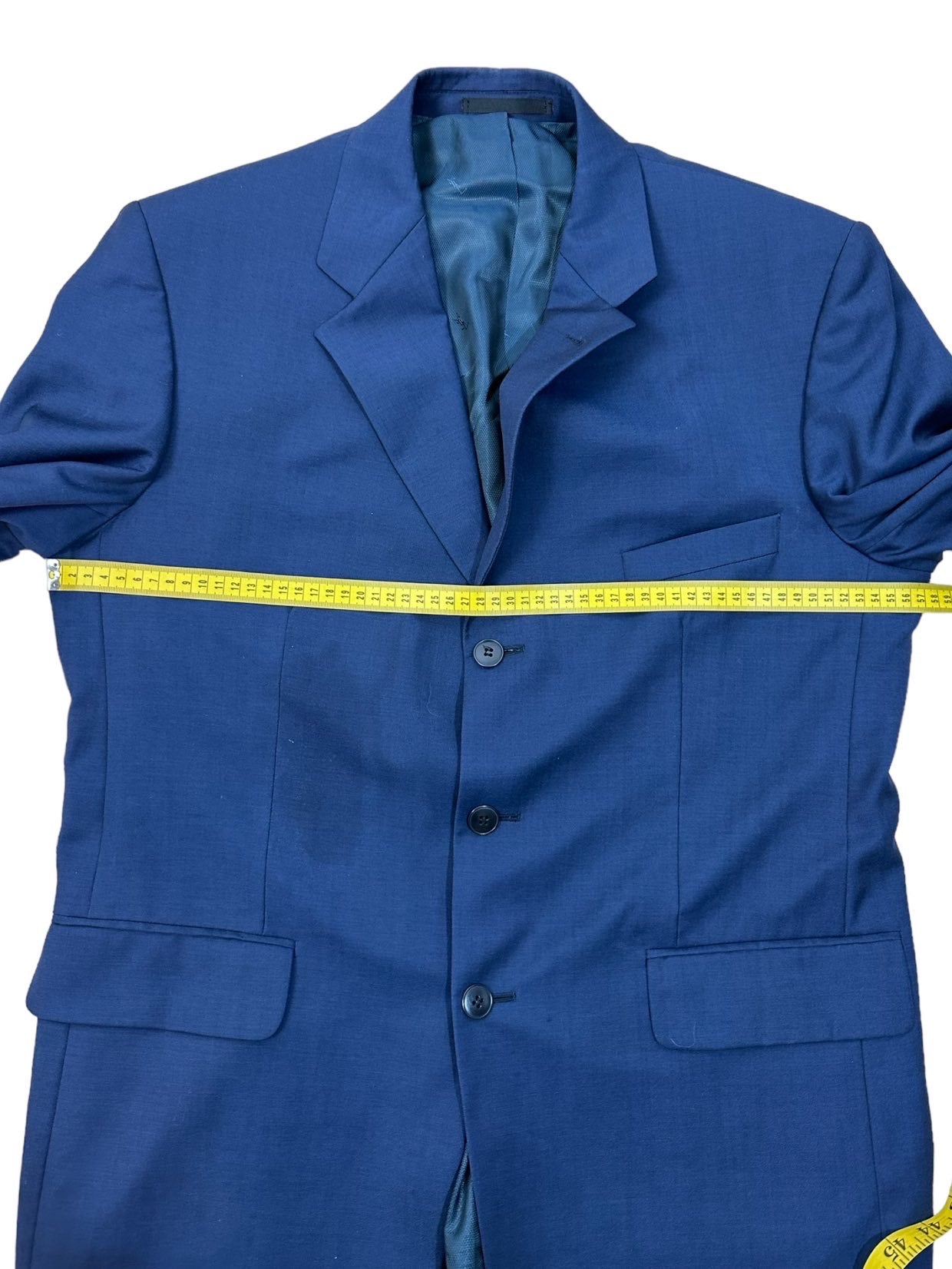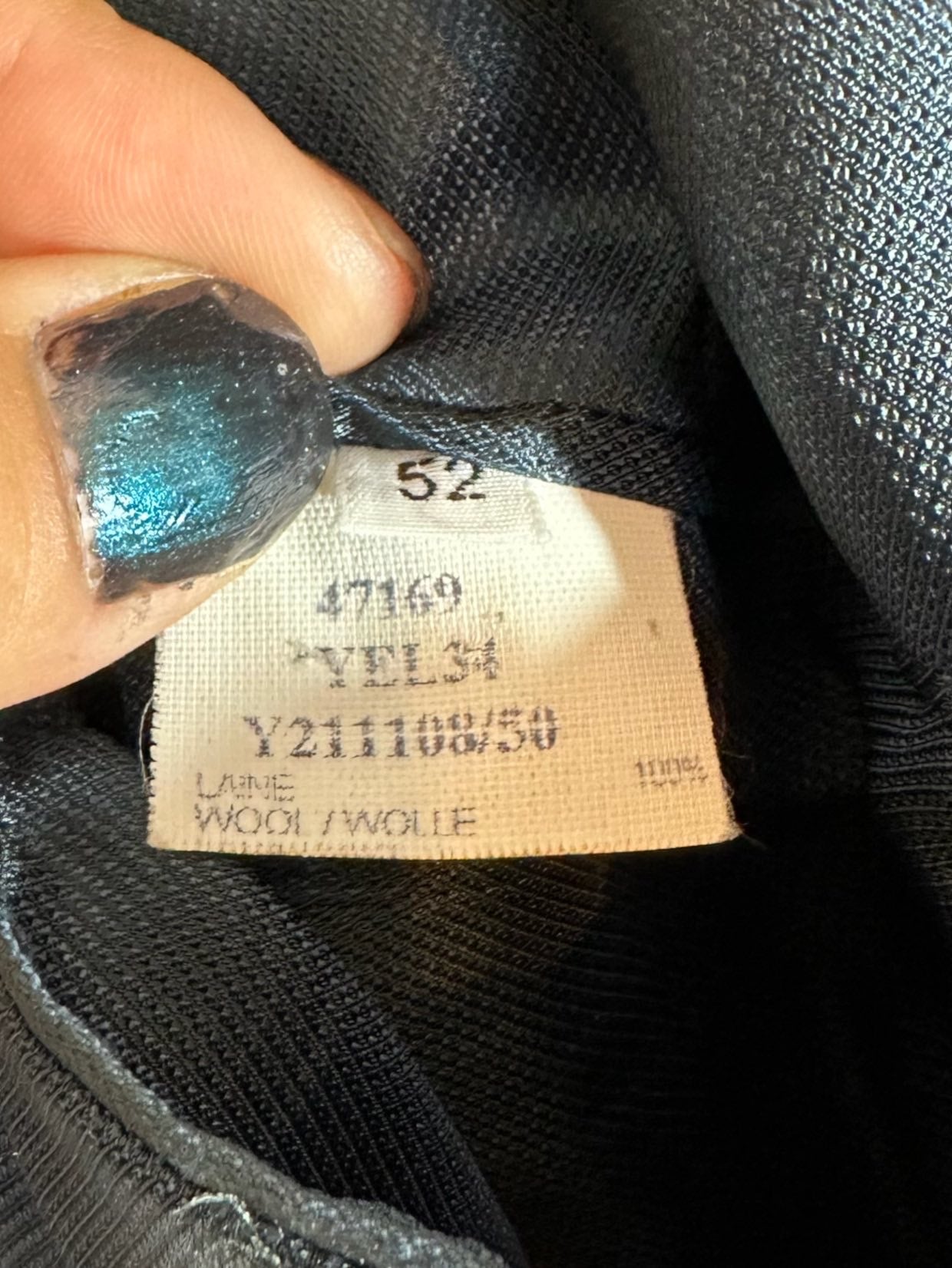 Yves Sai. Laurent blazer maschile vintage in lana e viscosa blu scuro a maniche lunghe con tasche laterali e fodera interna logata. Tg.52
