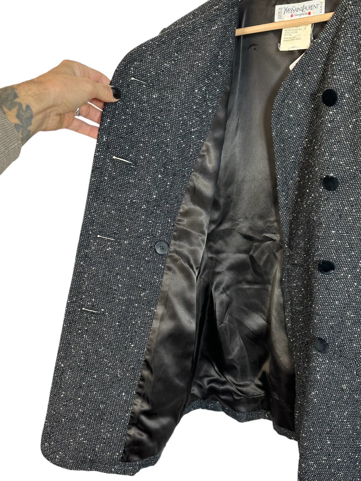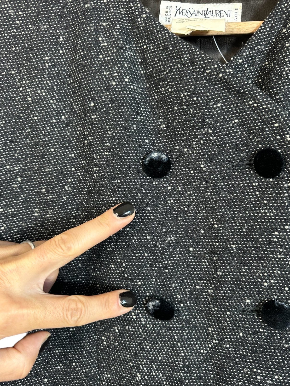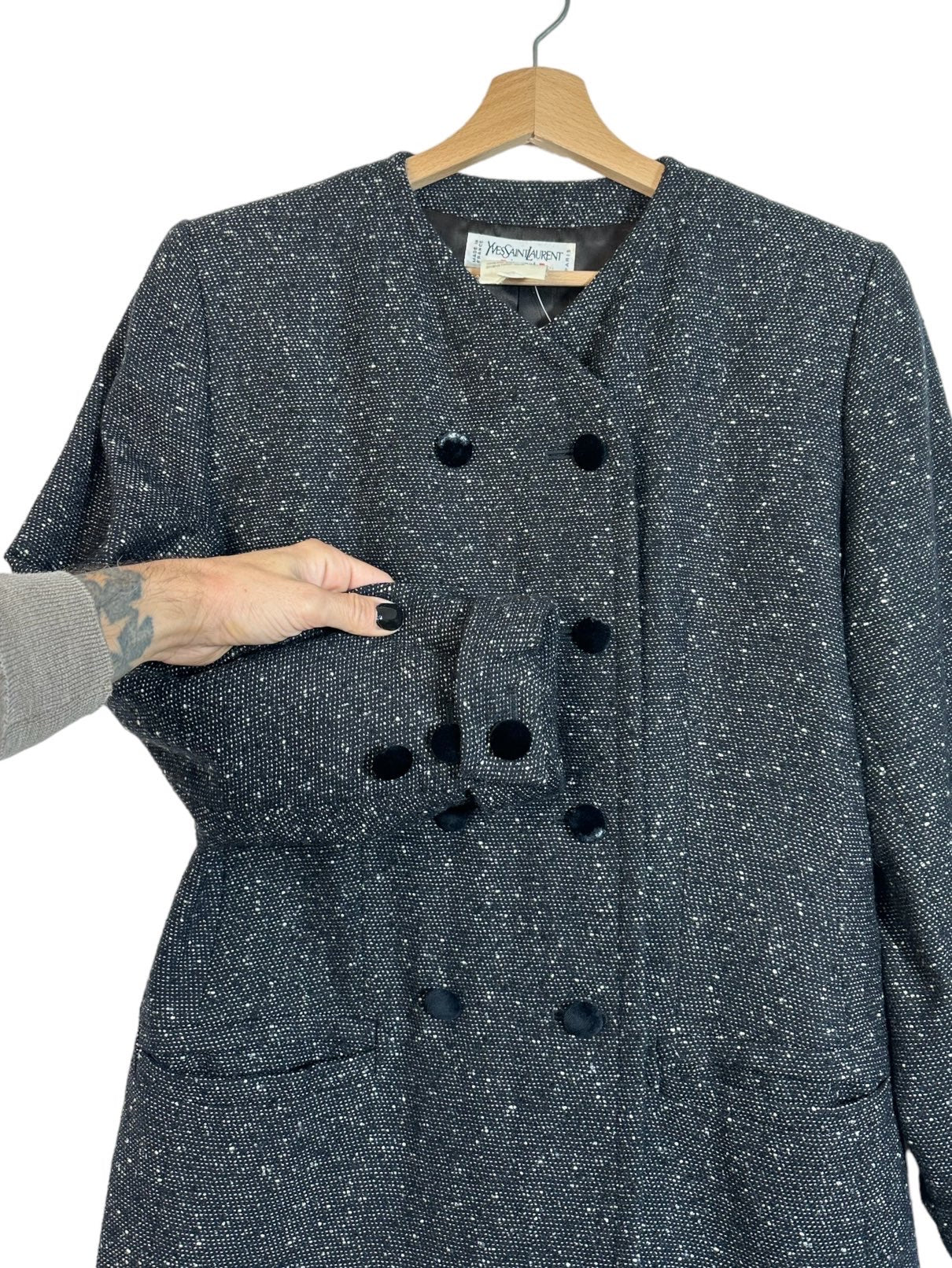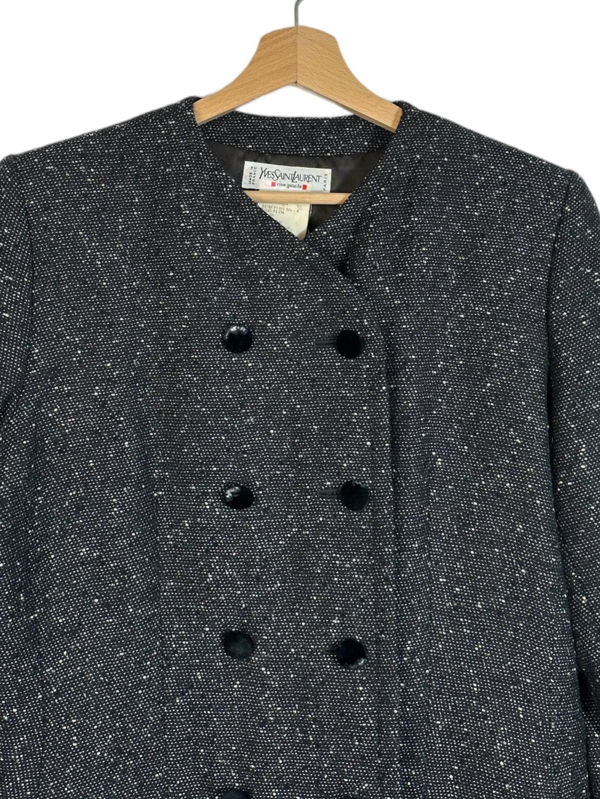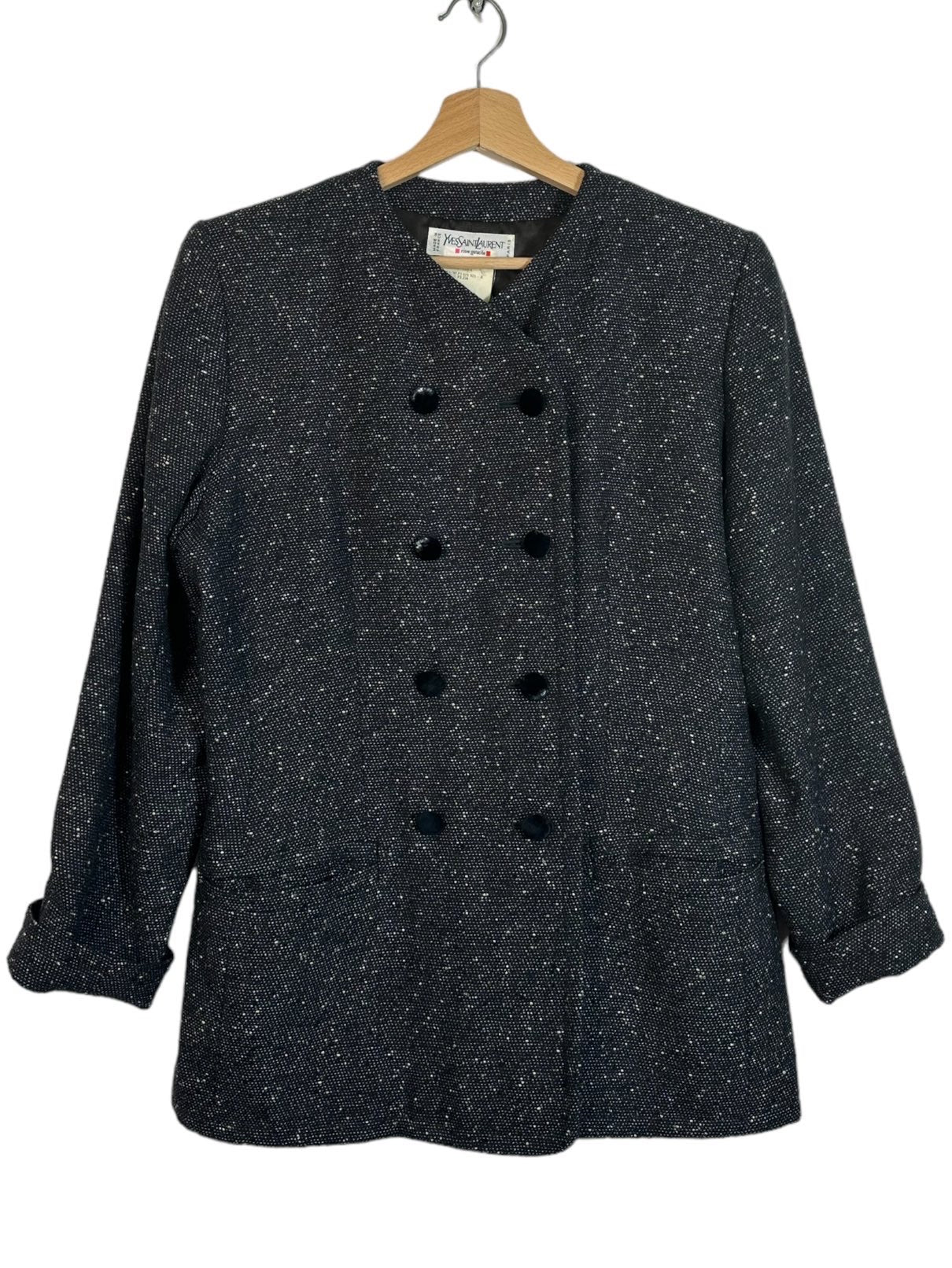 Yves Saint Laurent blazer vintage in lana grigia e nera a maniche lunghe con chiusura doppio petto a bottoni rivestiti in velluto (segni di usura su alcuni bottoni). Tg. 44
