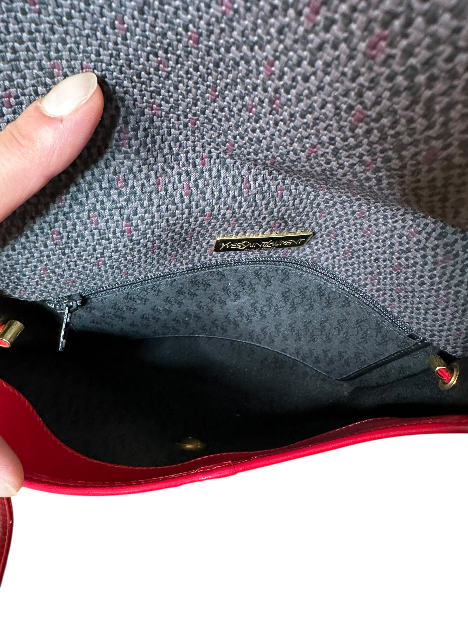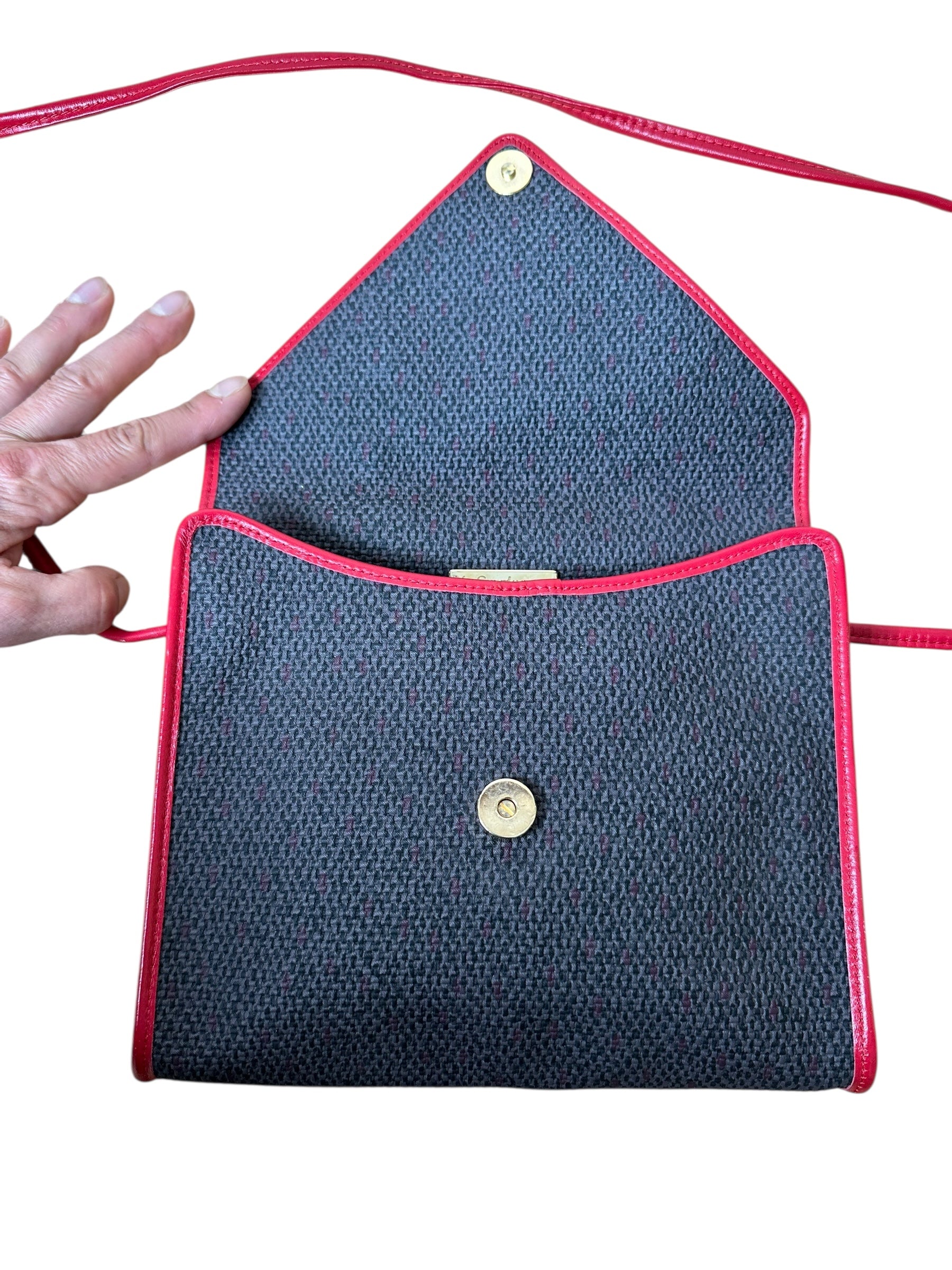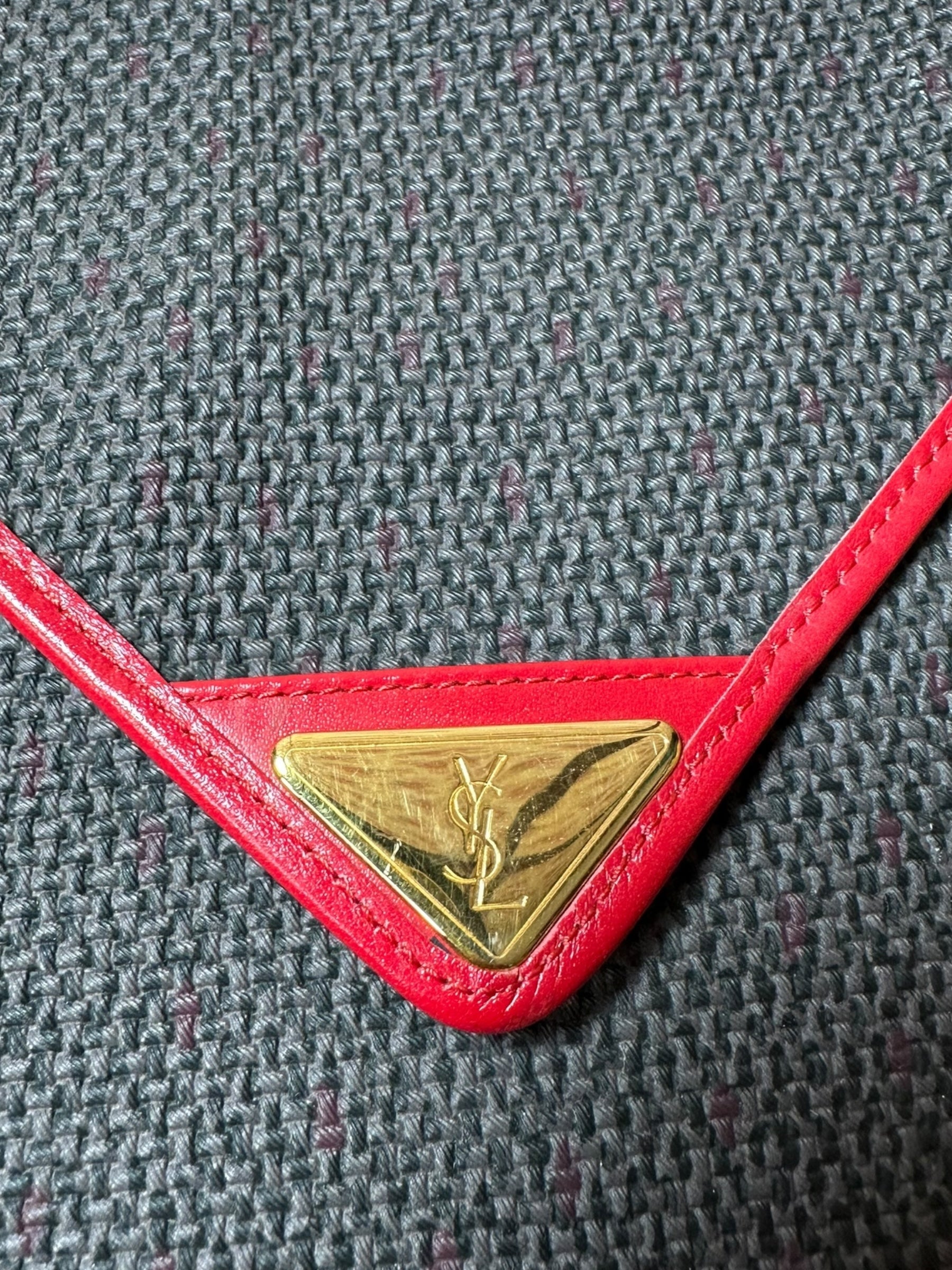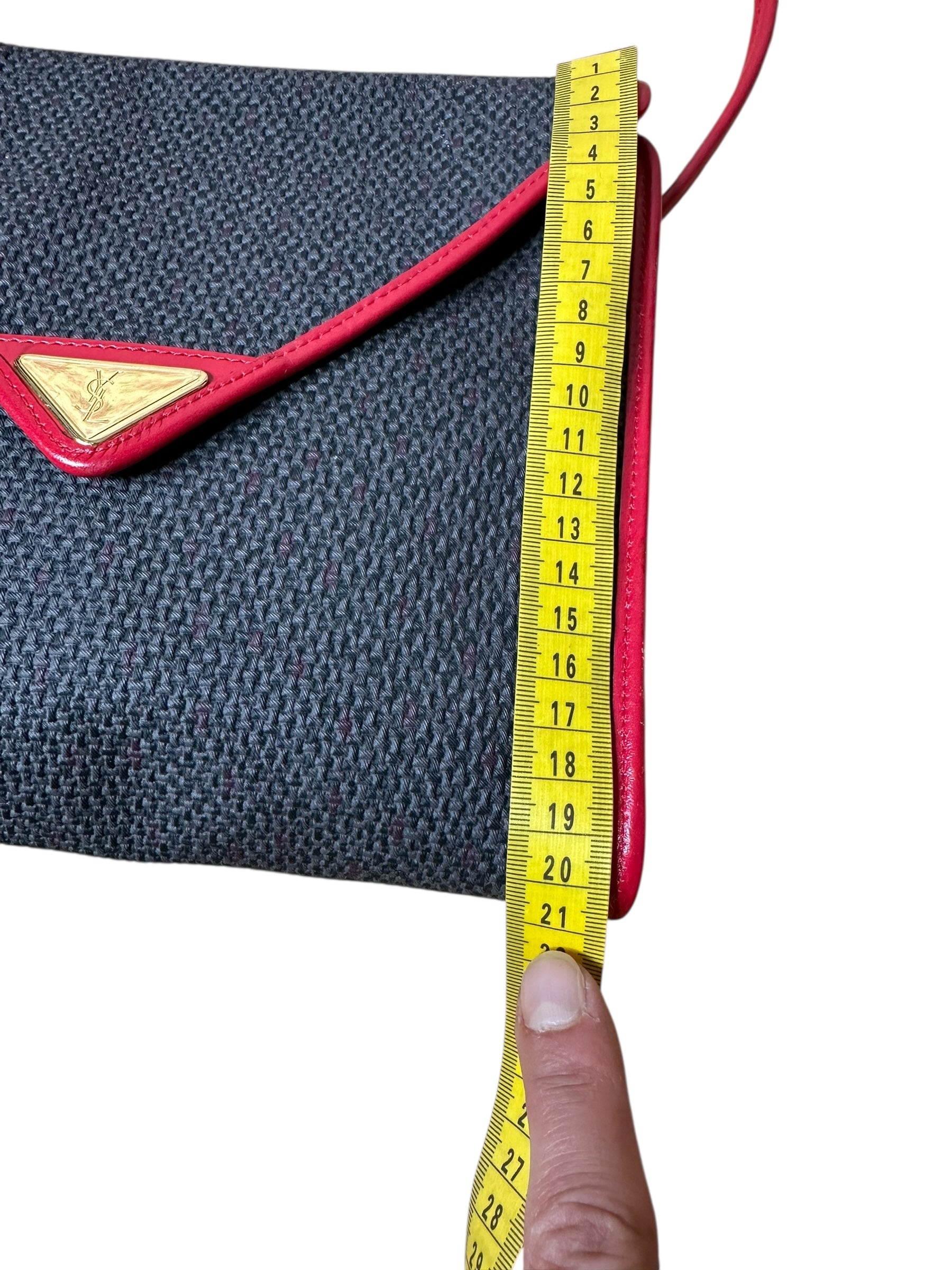Elegante borsa a tracolla Yves Saint Laurent risalente agli anni ’70-’80, realizzata in tela intrecciata color blu notte con micro puntinatura bordeaux e profili in pelle liscia rossa. Presenta una chiusura con patta a V e bottone magnetico, impreziosita frontalmente dall’iconico logo YSL inciso su placca metallica dorata triangolare.