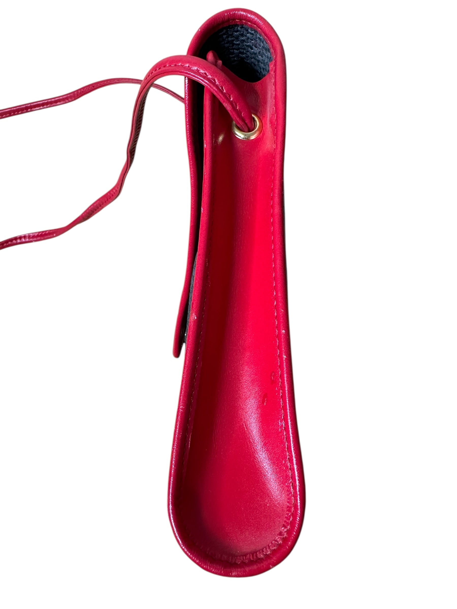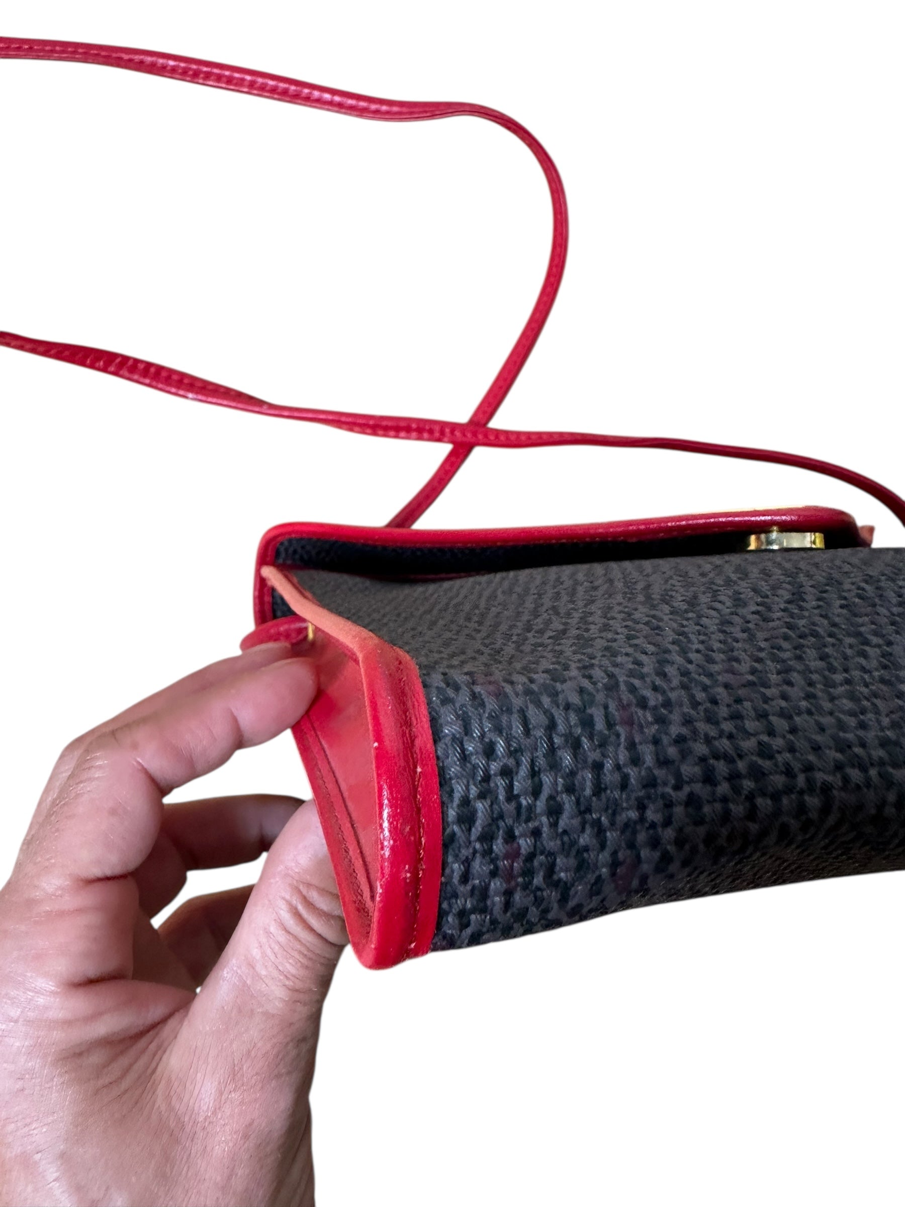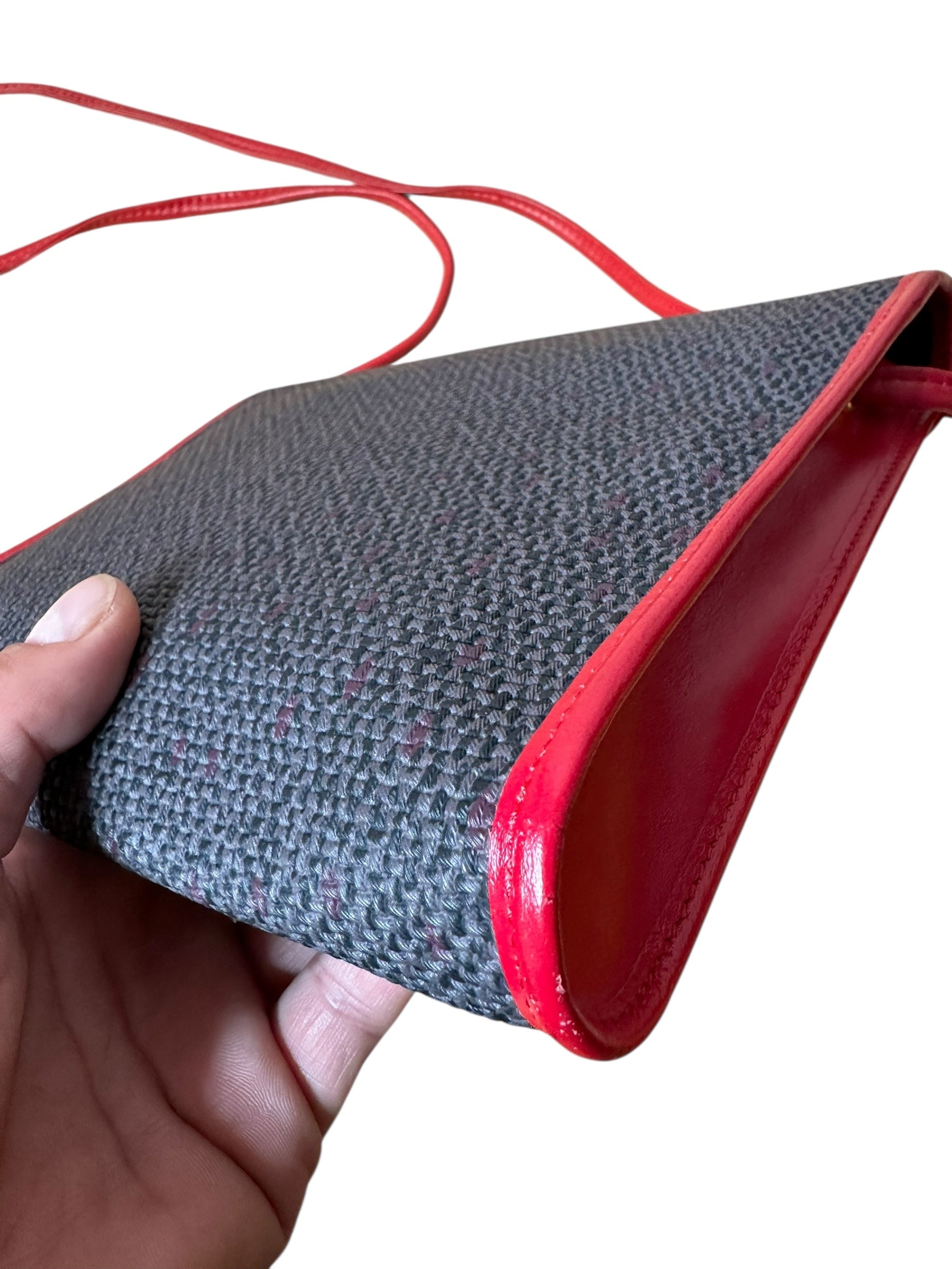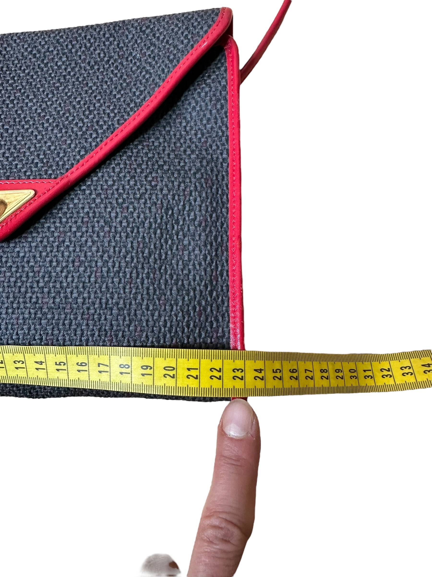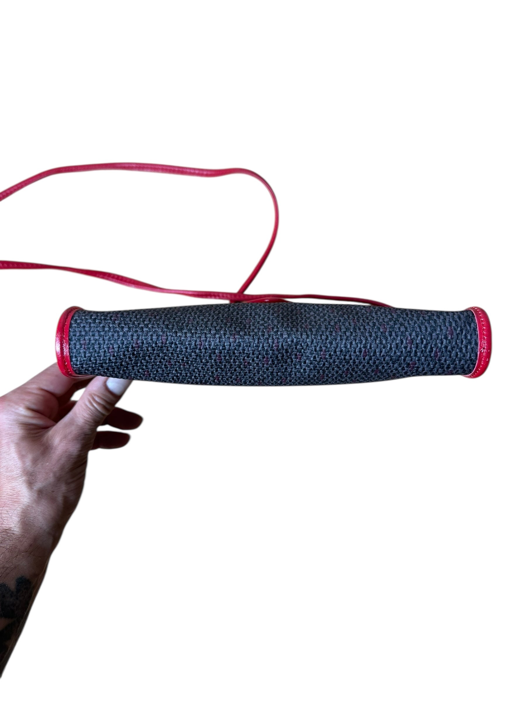 Elegante borsa a tracolla Yves Saint Laurent risalente agli anni ’70-’80, realizzata in tela intrecciata color blu notte con micro puntinatura bordeaux e profili in pelle liscia rossa. Presenta una chiusura con patta a V e bottone magnetico, impreziosita frontalmente dall’iconico logo YSL inciso su placca metallica dorata triangolare.