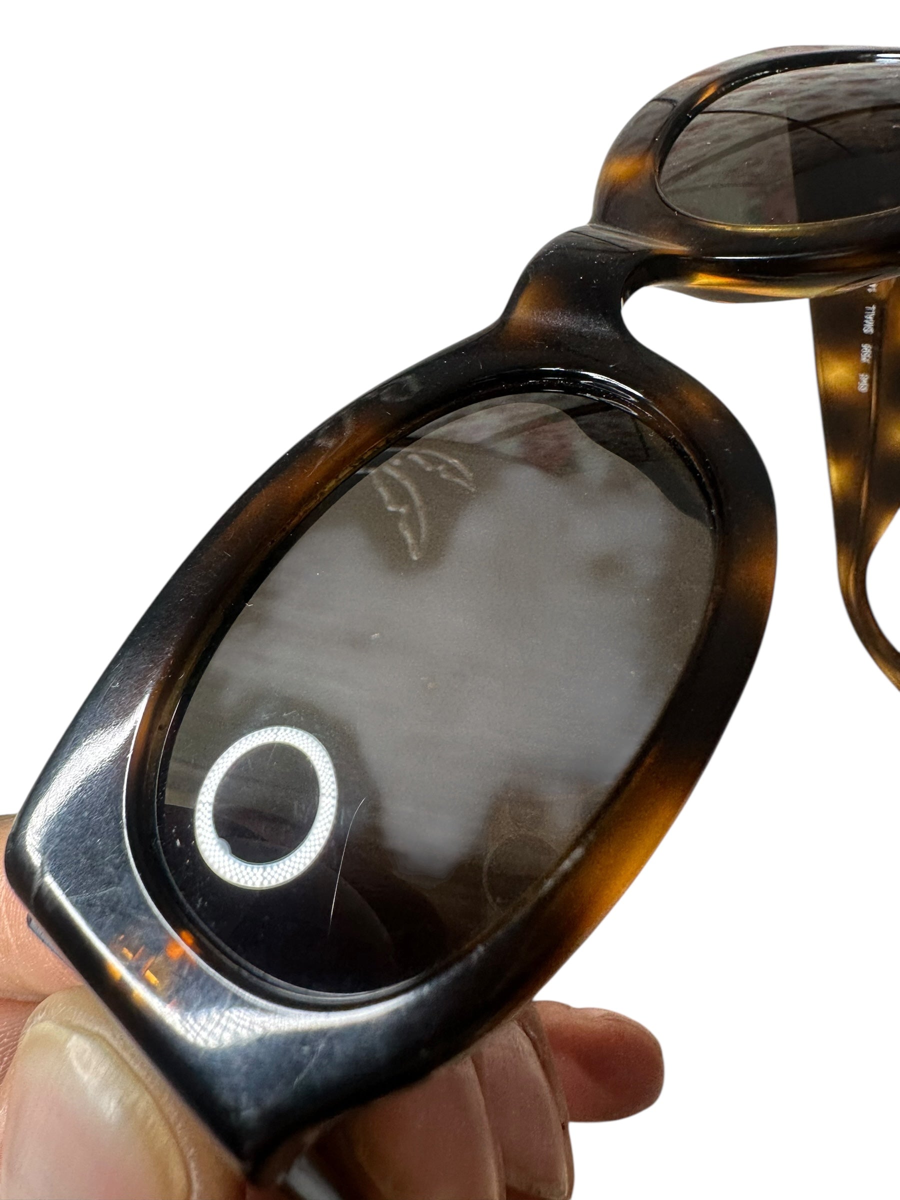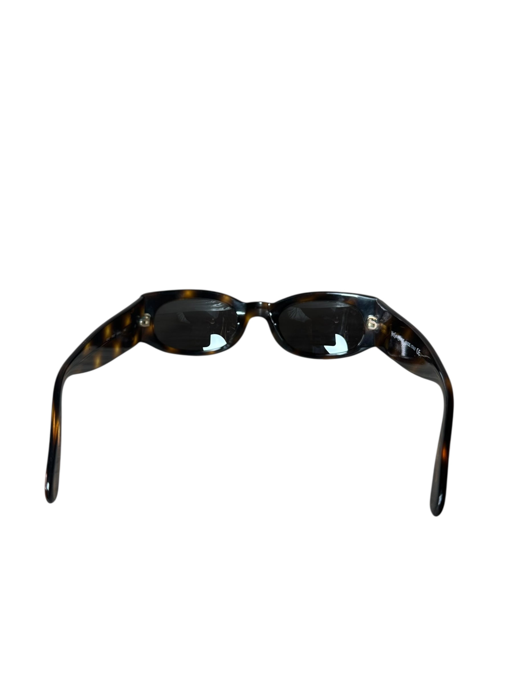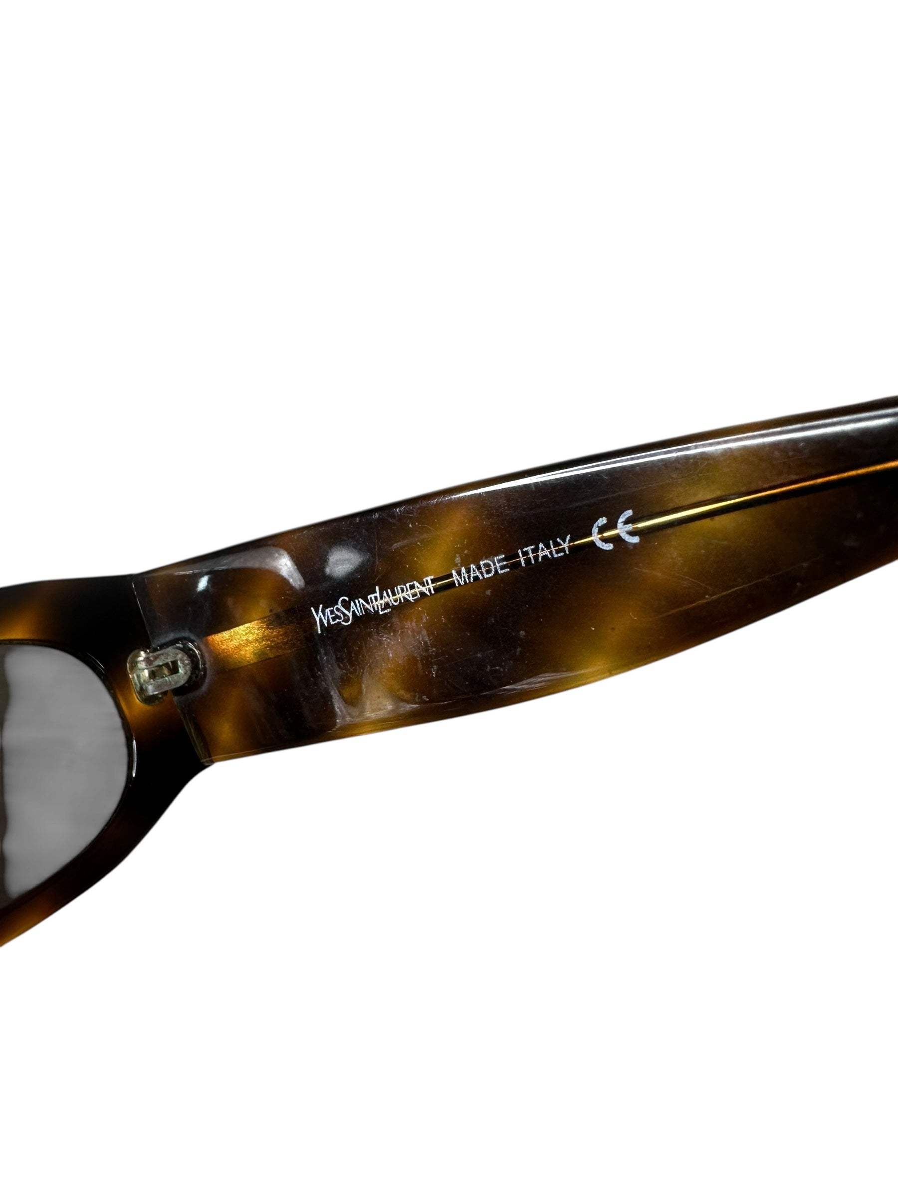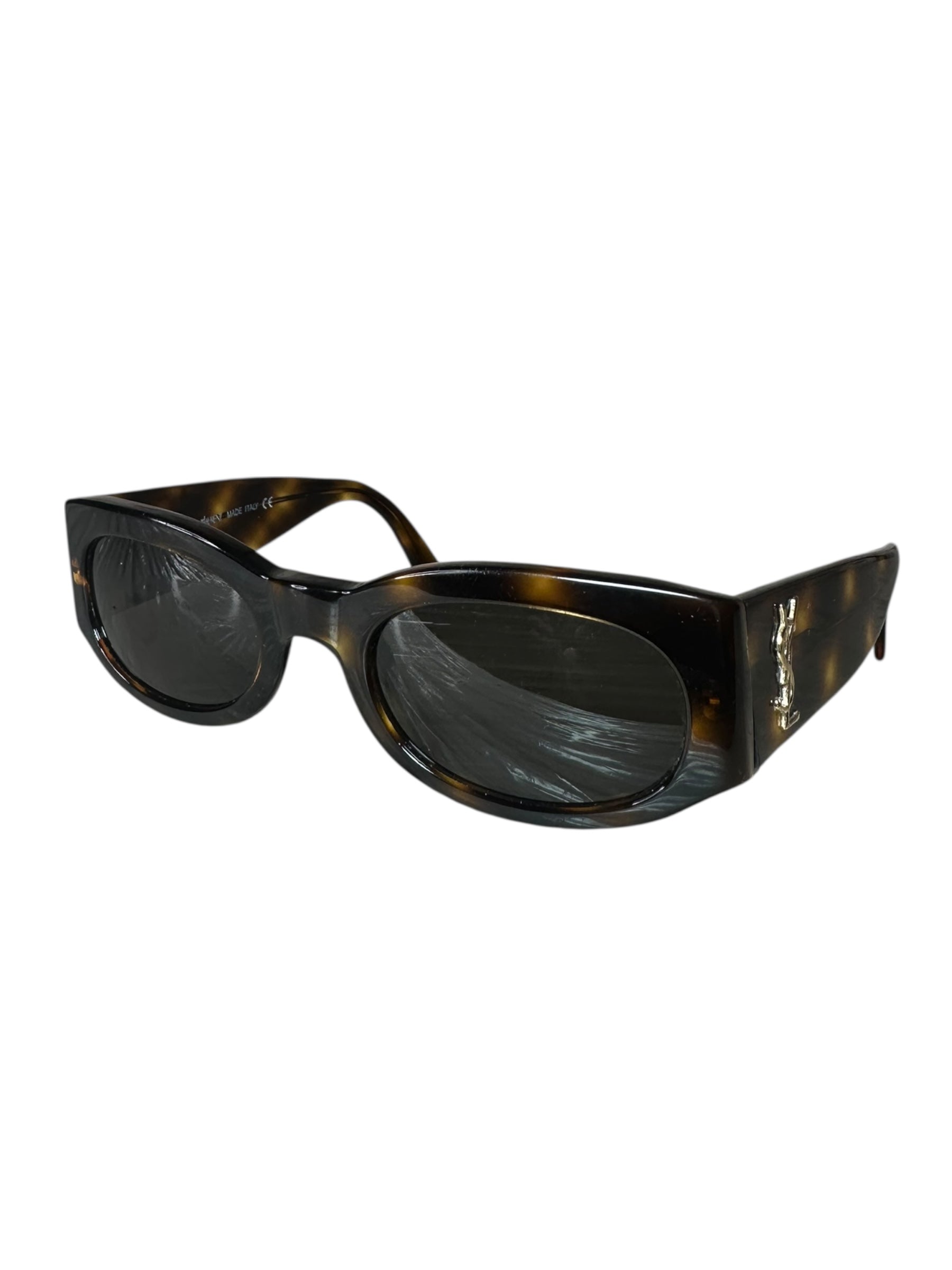 Eleganti occhiali da sole vintage firmati Yves Saint Laurent, caratterizzati da una montatura spessa in acetato effetto tartarugato scuro con iconico logo YSL in metallo argento applicato sulle aste. Design avvolgente anni ’90 con lenti ovali scure e struttura bold che valorizza qualsiasi look con un tocco deciso e retrò.