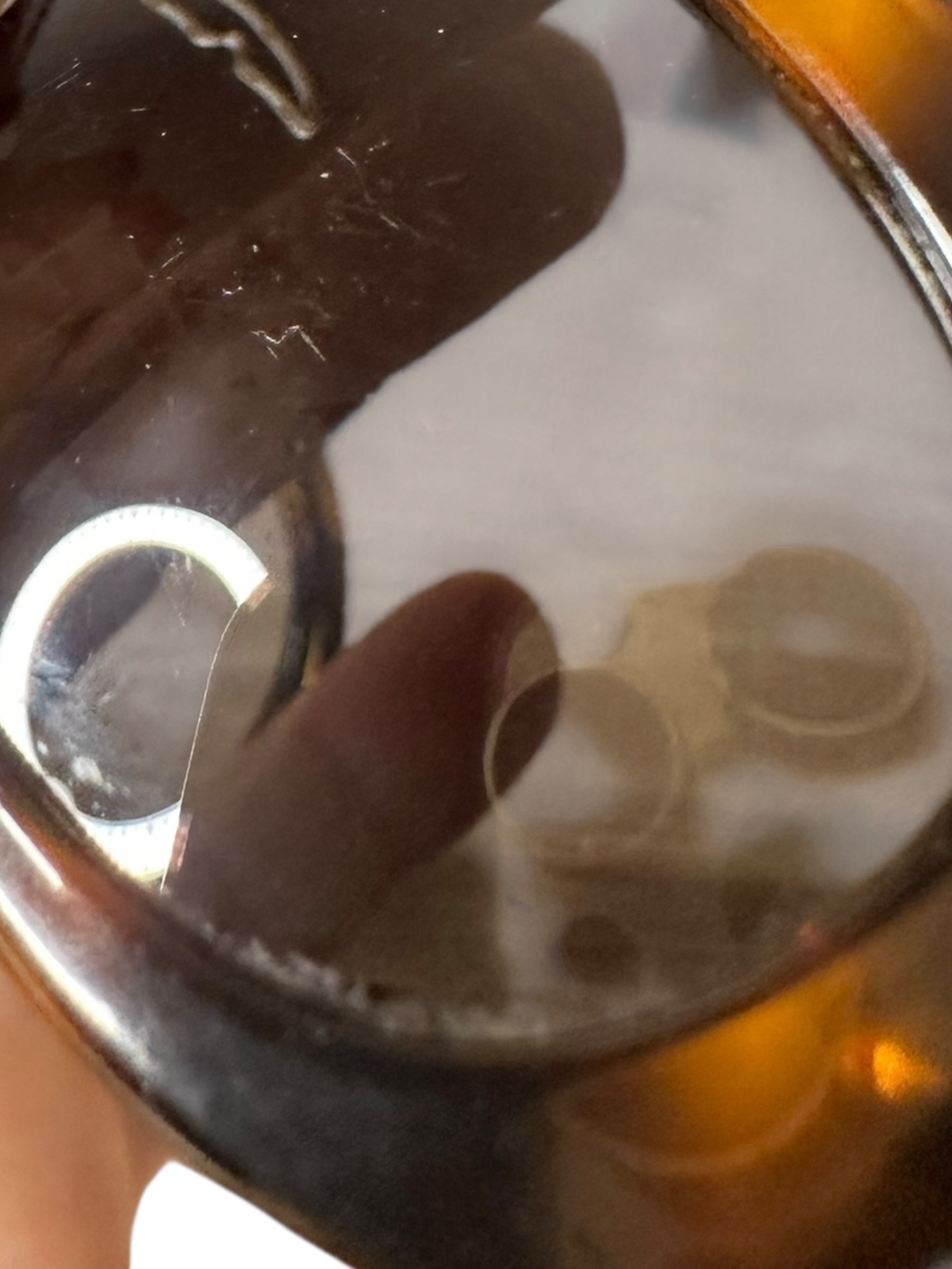 Occhiale in buone condizioni generali. Le lenti presentano dei micro graffi visibili in controluce, che non compromettono la visibilità né la portabilità. La montatura è integra, con minimi segni d’uso superficiali.