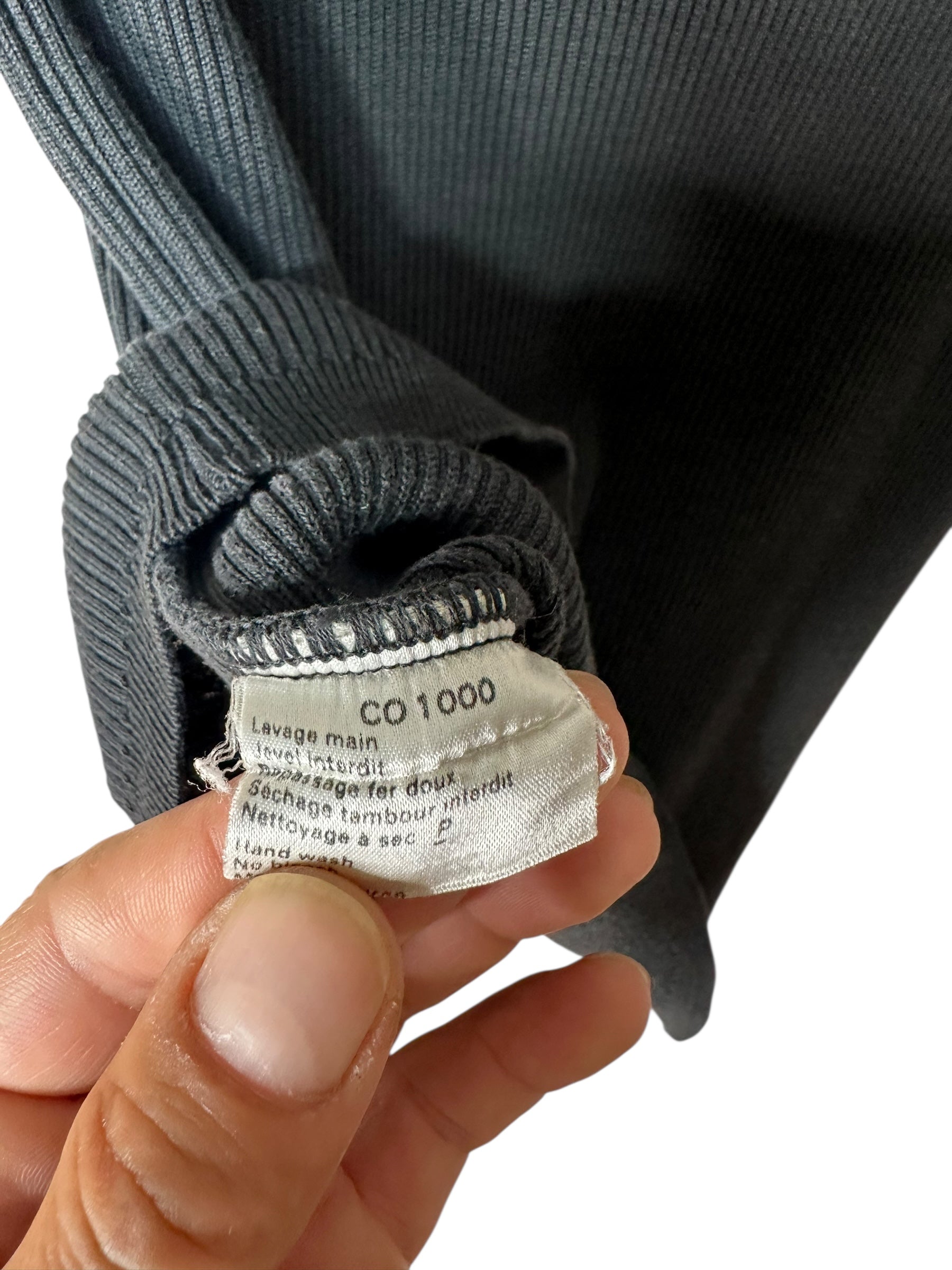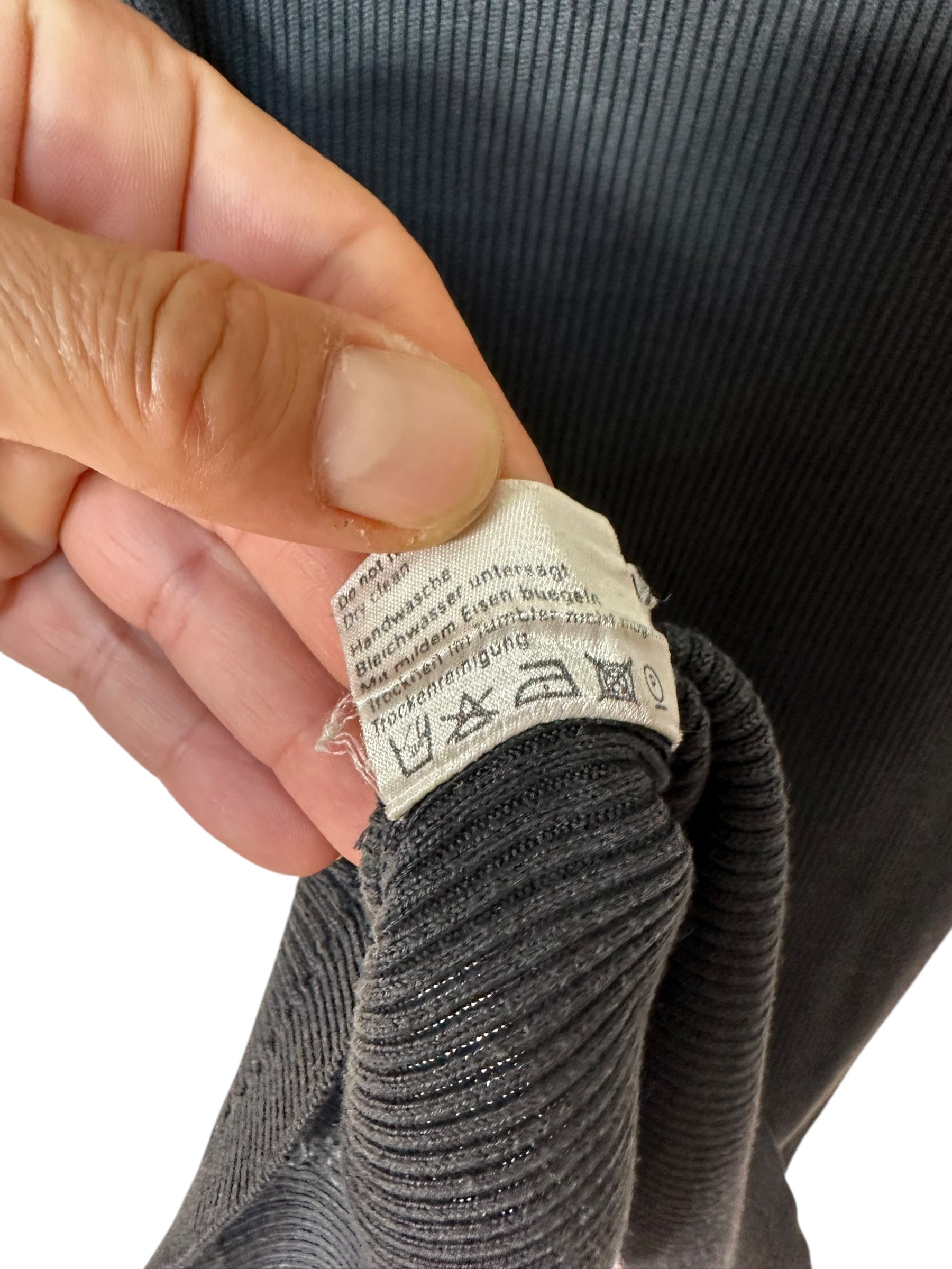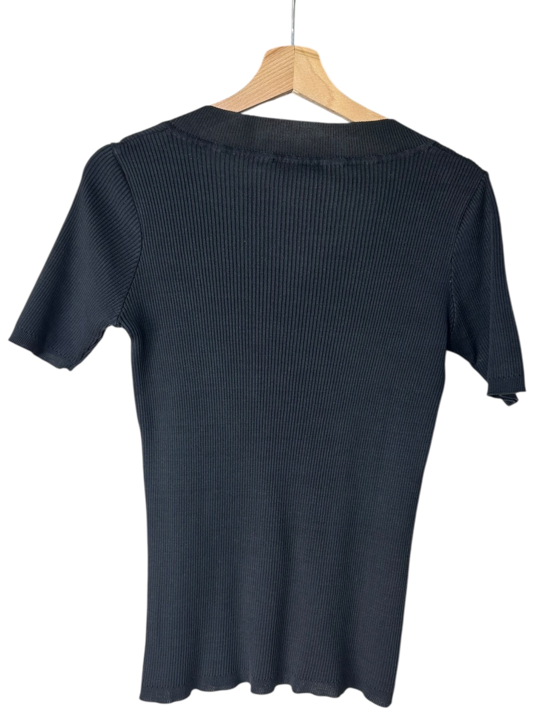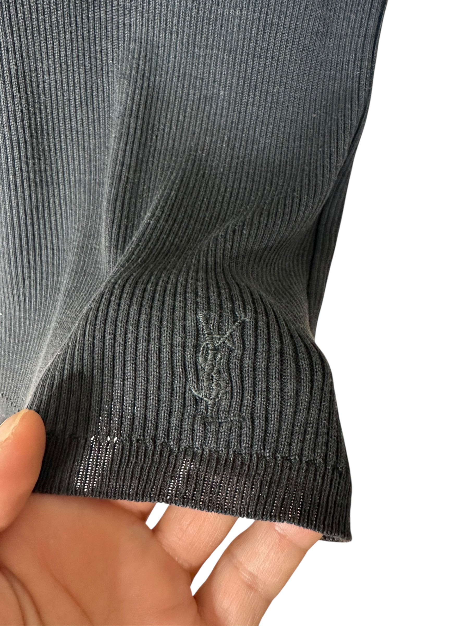 Top vintage firmato Yves Saint Laurent Variation, realizzato in maglia a costine di colore nero, con elegante scollo a V. La struttura in maglia elasticizzata a costine verticali dona al capo una vestibilità aderente e confortevole. Sul fondo, discreto ricamo tono su tono con logo YSL. Capo senza taglia riportata, veste una taglia S/M.